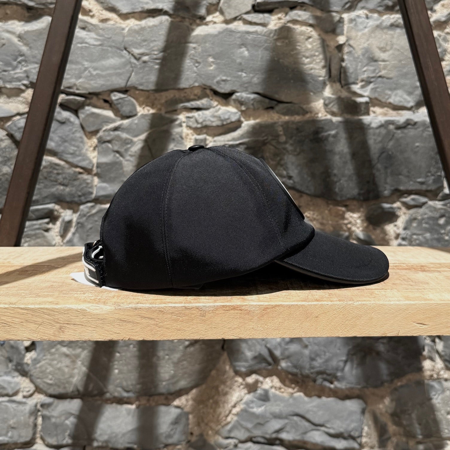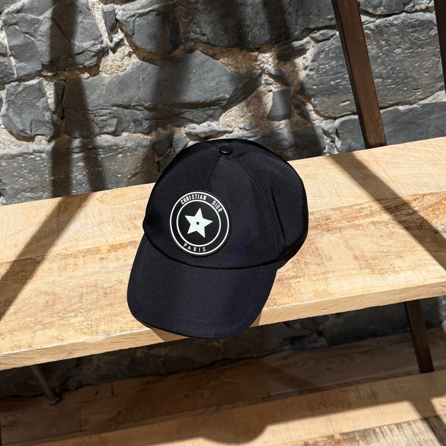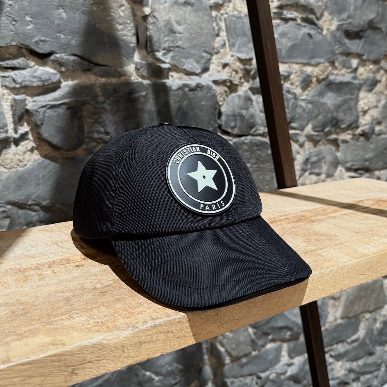 Structured black nylon baseball cap with front round Dior star logo patch. Classic curved brim. Adjustable back velcro rubber strap with Christian Dior branding. Leather trims. Black cotton lining. Made in Italy. Comes with original tag.