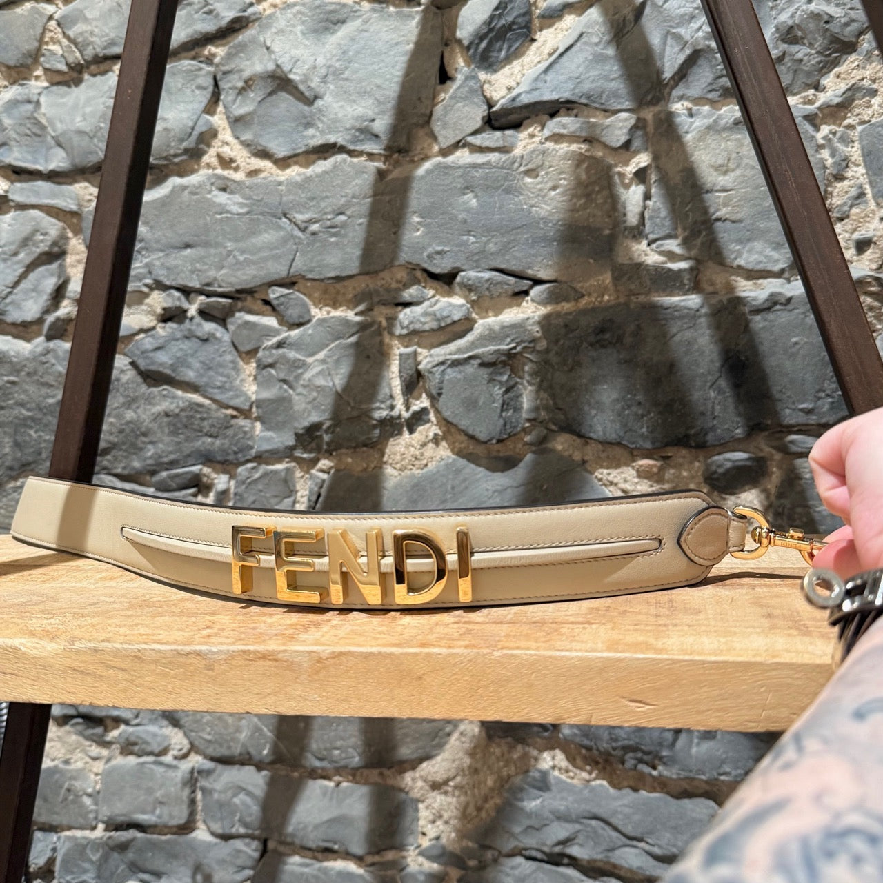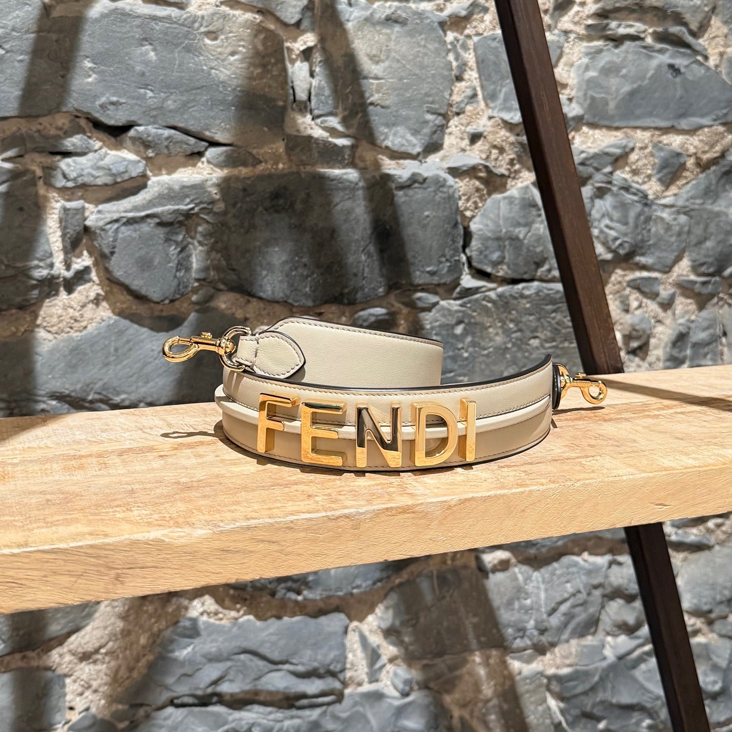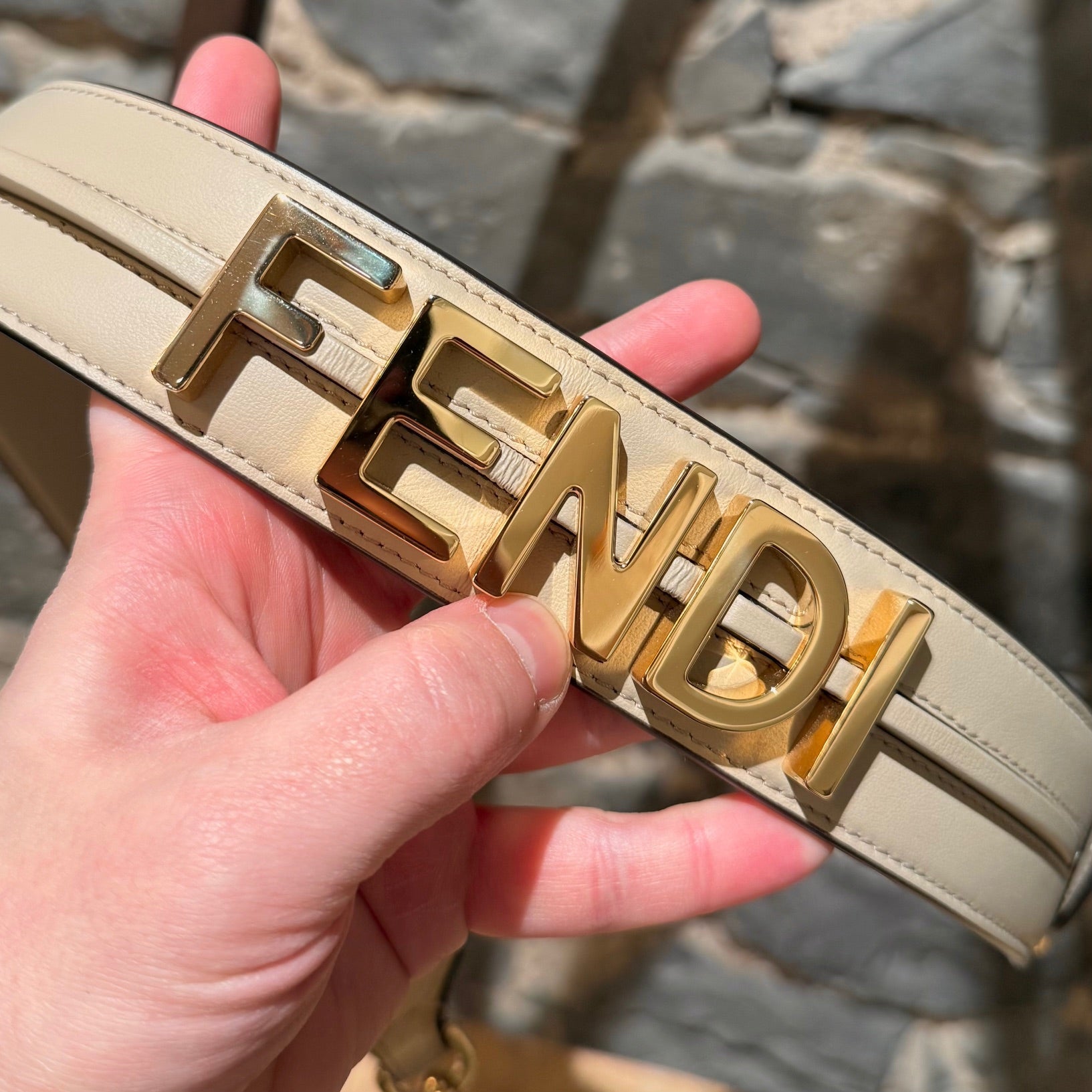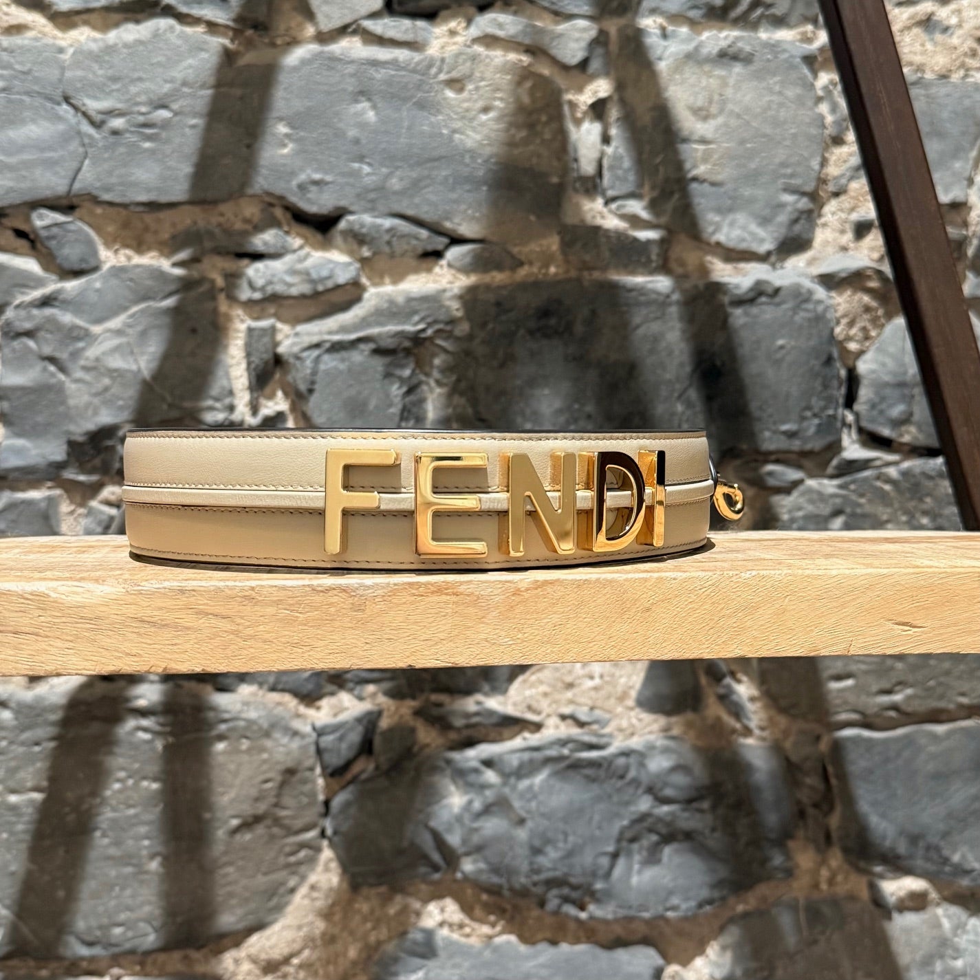 Wide leather strap from the Fendigraphy collection. Calfskin leather in beige with black edges. Features large gold-tone “FENDI” lettering with raised leather detailing. Two gold-tone “FENDI”-engraved lobster clasps. Non-adjustable. Made in Italy. Comes with a Fendi Roma dustbag.