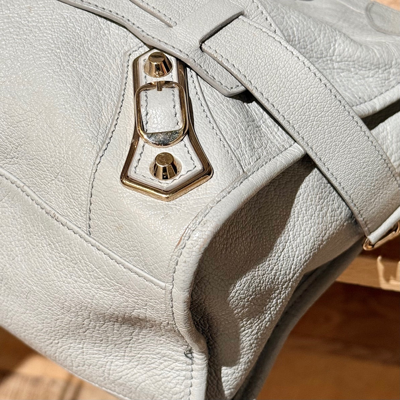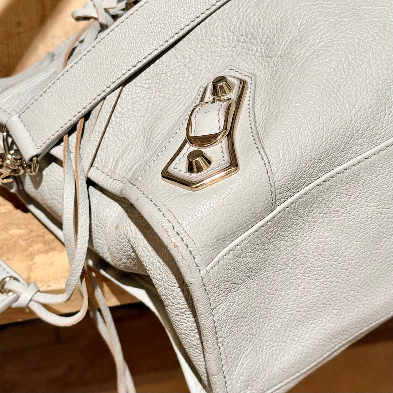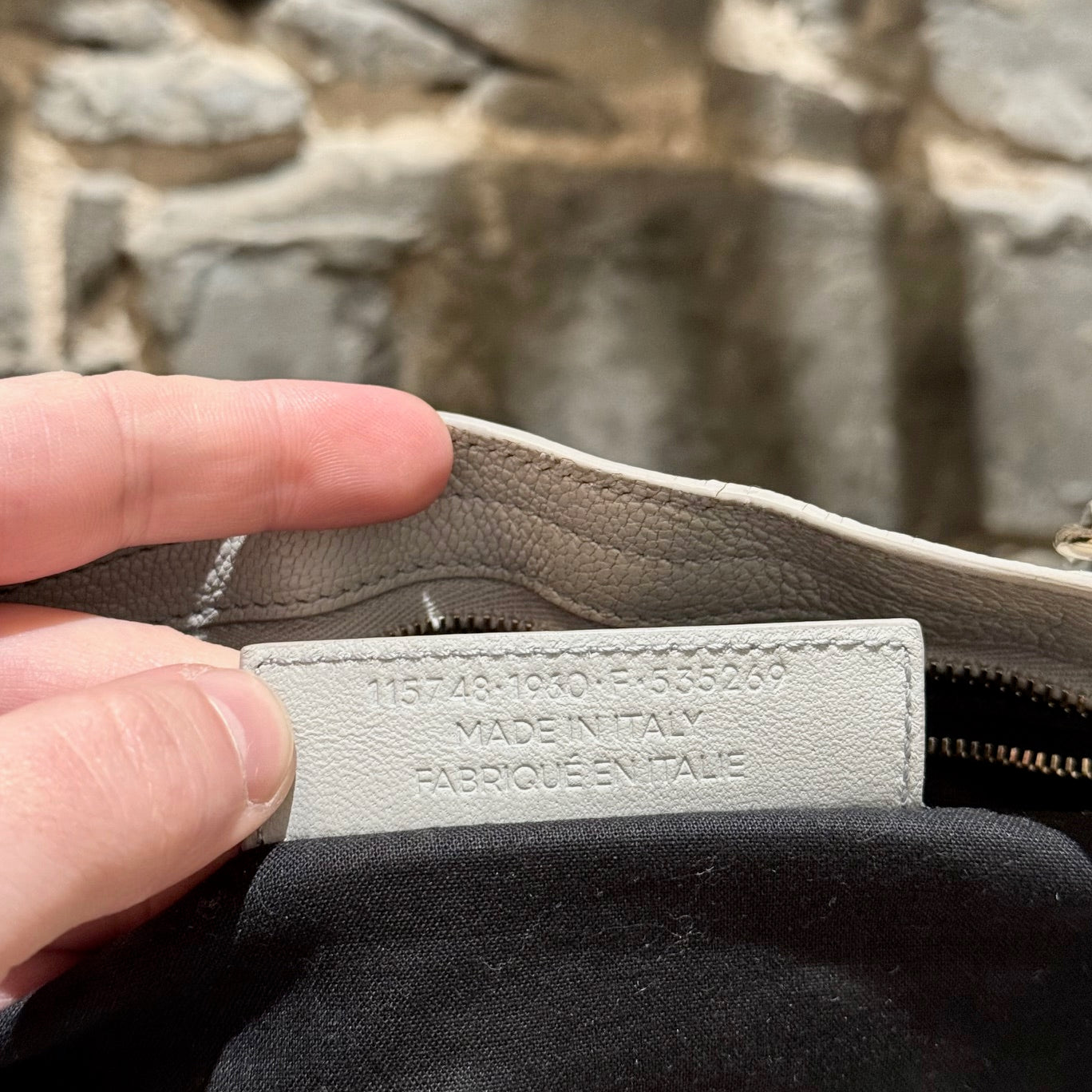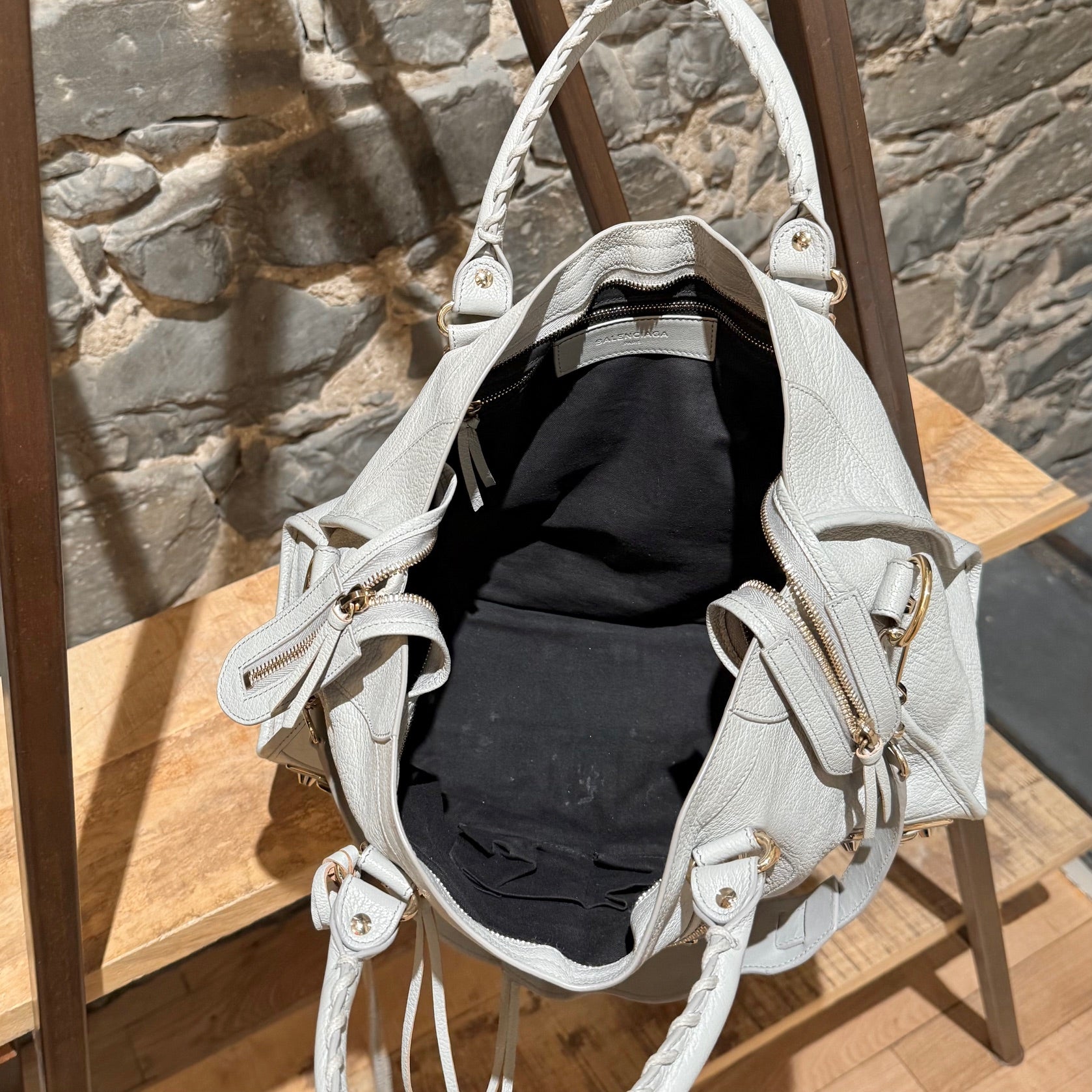 From the Spring Summer 2015 collection - date code F. Iconic model. Soft, relaxed structure. Pearl grey leather with Metallic Edge gold-tone hardware. Dual rolled top handles with braided detailing. Removable shoulder strap with lobster clasps and leather pad. Top zip closure with leather pull. Front zip pocket with long leather fringes. Attached mirror charm. Stud and buckle accents at front and base corners. Black textile lining with zip pocket and cell pockets. Made in Italy. Comes with dustbag.