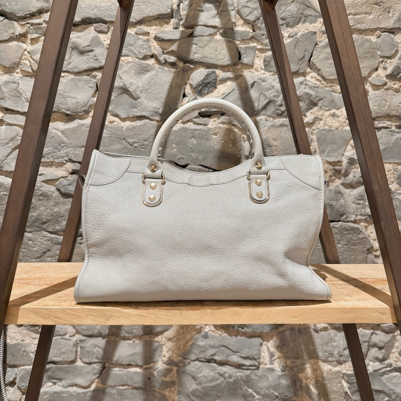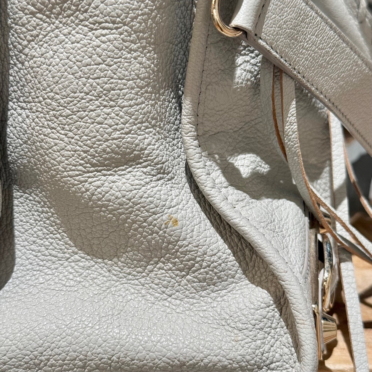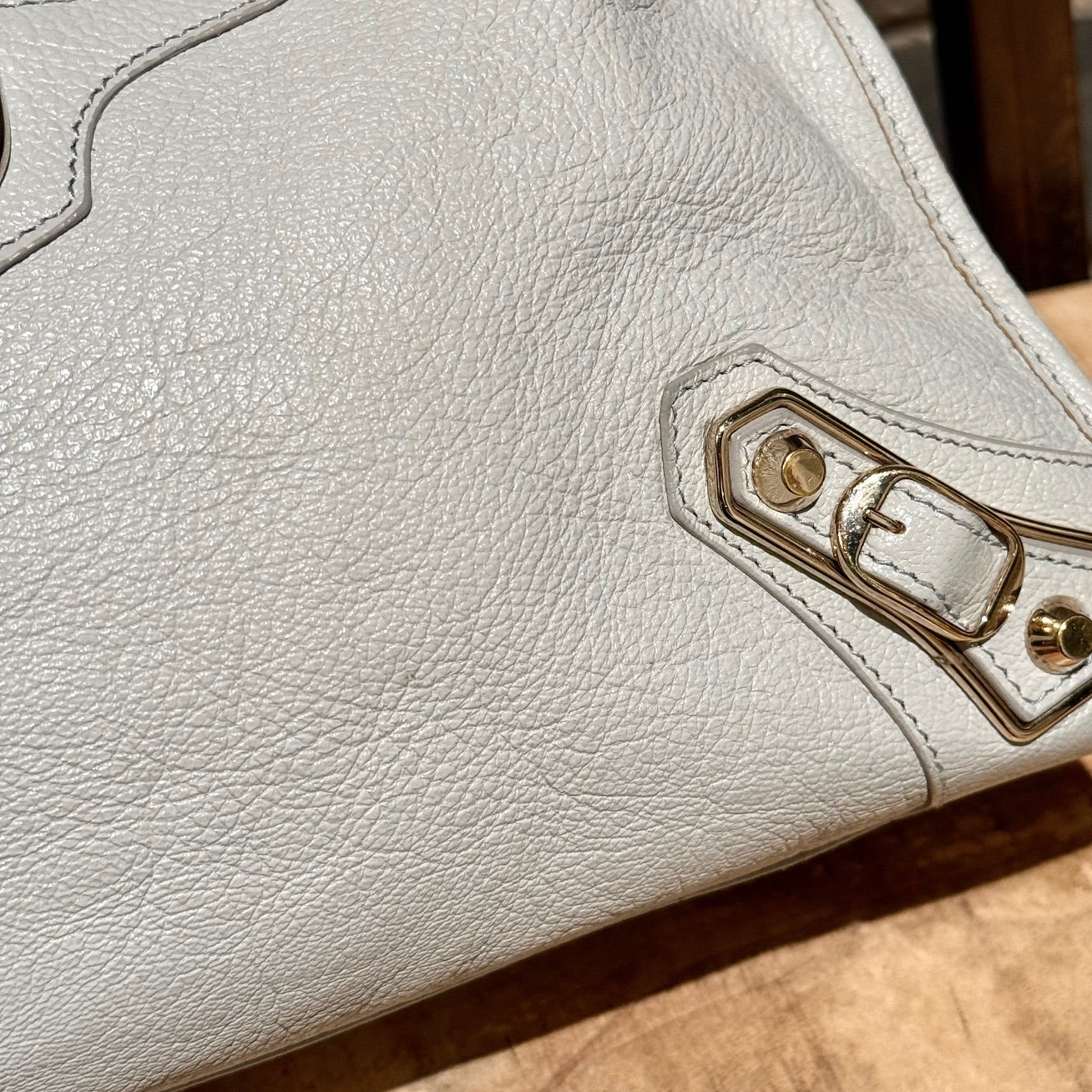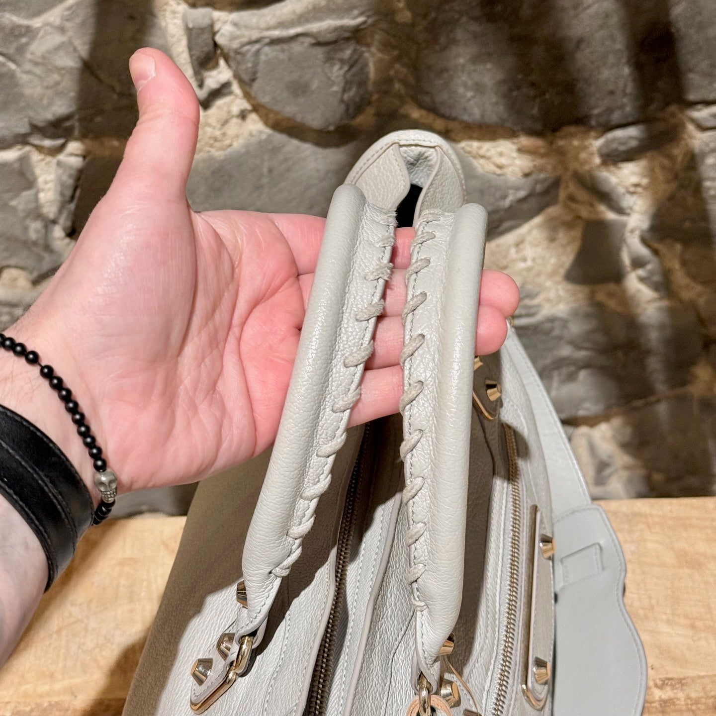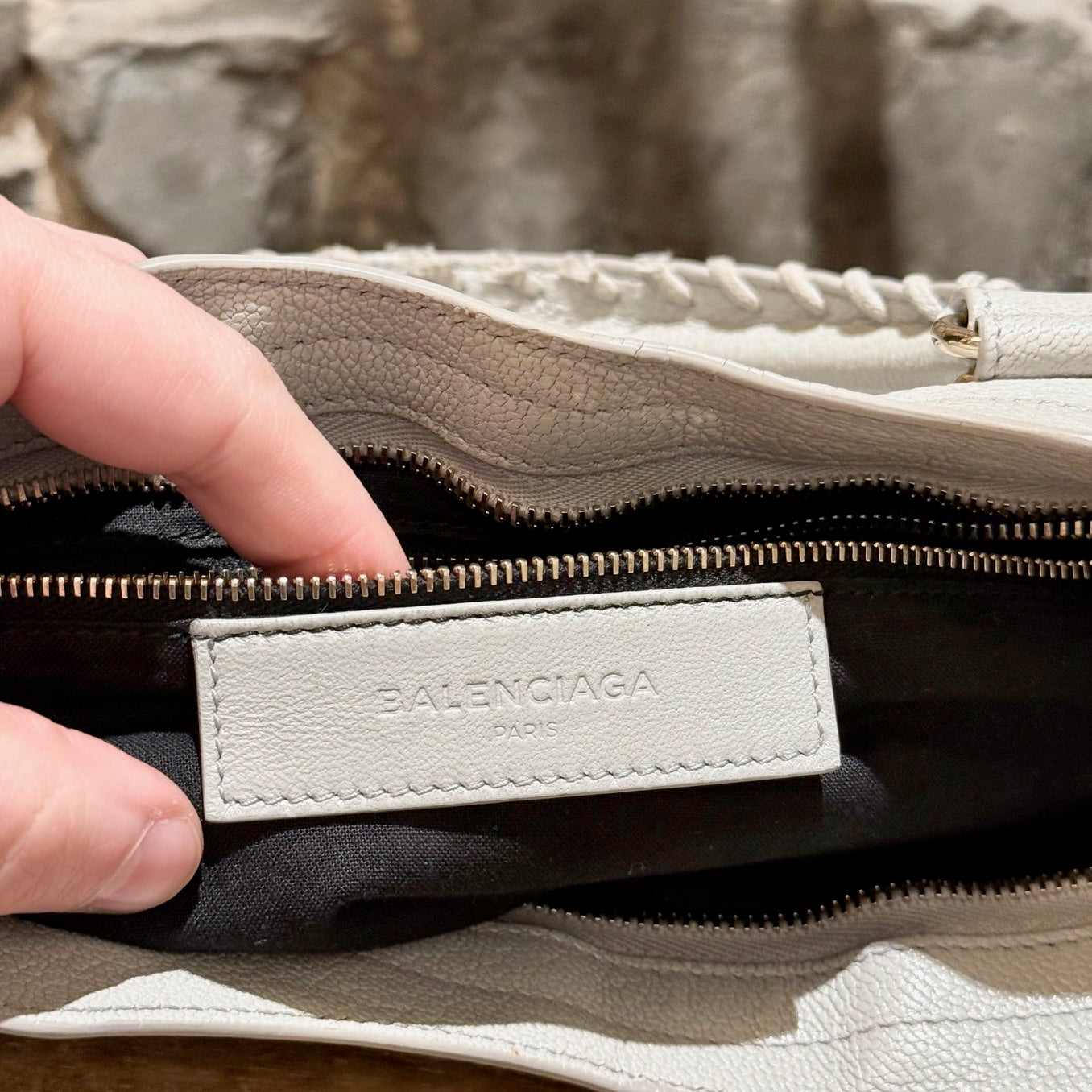 From the Spring Summer 2015 collection - date code F. Iconic model. Soft, relaxed structure. Pearl grey leather with Metallic Edge gold-tone hardware. Dual rolled top handles with braided detailing. Removable shoulder strap with lobster clasps and leather pad. Top zip closure with leather pull. Front zip pocket with long leather fringes. Attached mirror charm. Stud and buckle accents at front and base corners. Black textile lining with zip pocket and cell pockets. Made in Italy. Comes with dustbag.