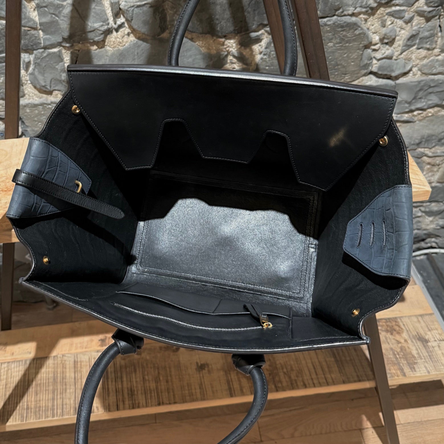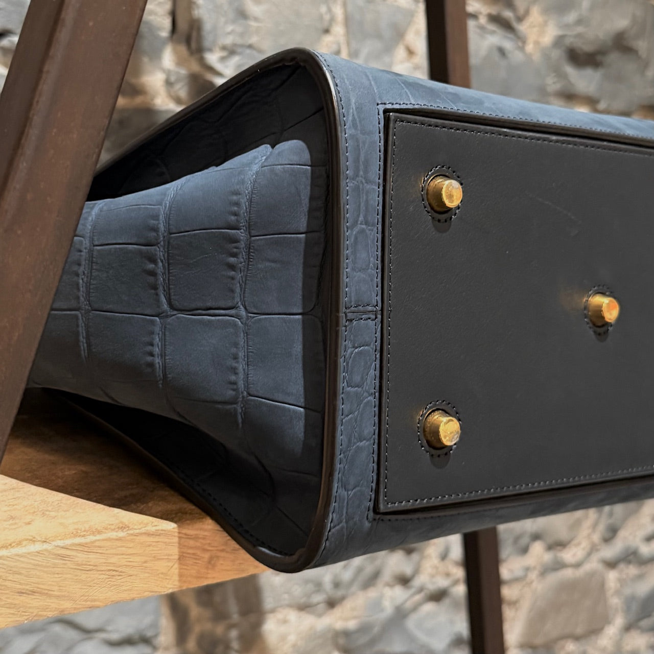 Crocodile-embossed nubuck leather. Black calfskin handles and top flap front. Knot details at the base of the handles. Gold-tone brass hardware. Leather interior lining. Made in Italy. Comes with its original dustbag.