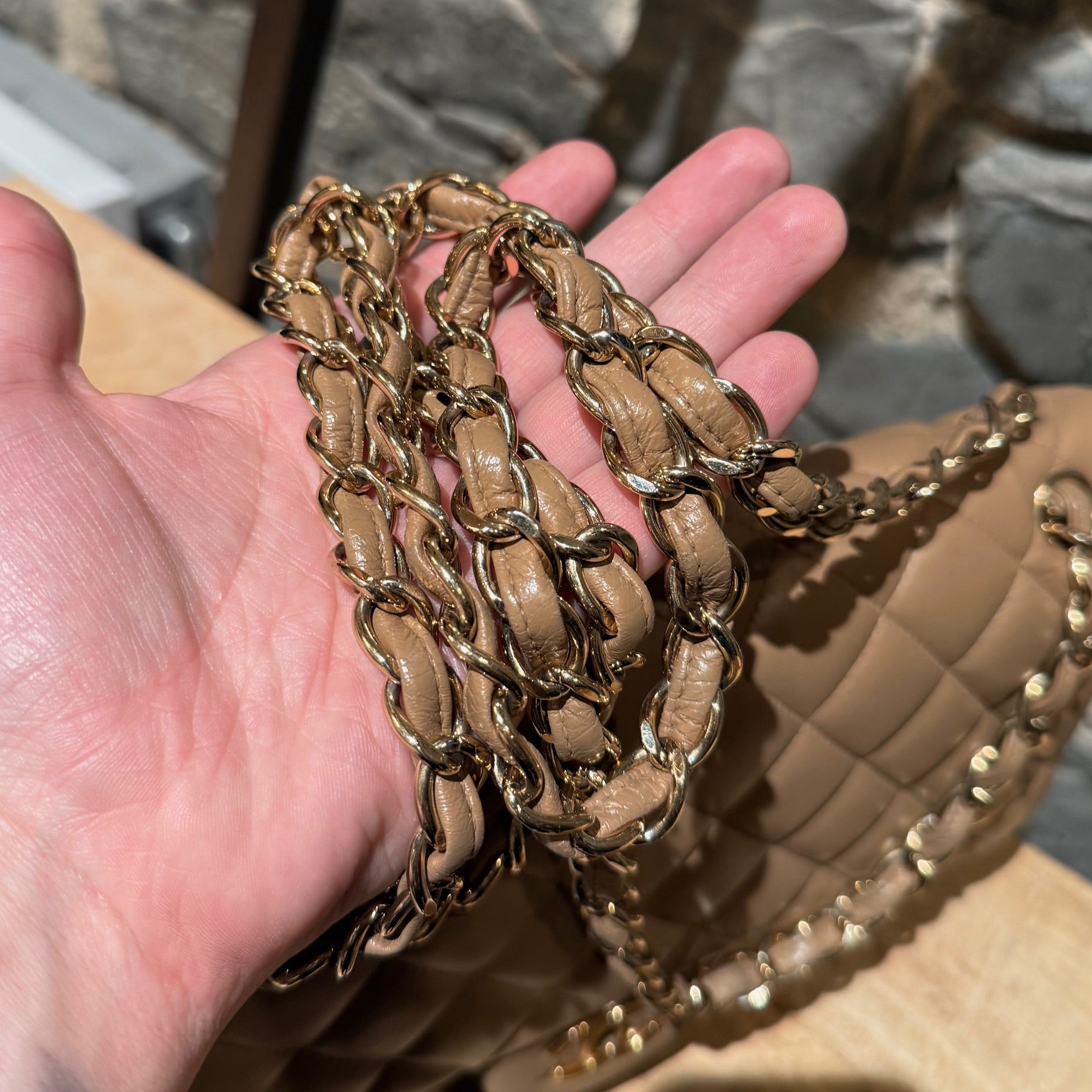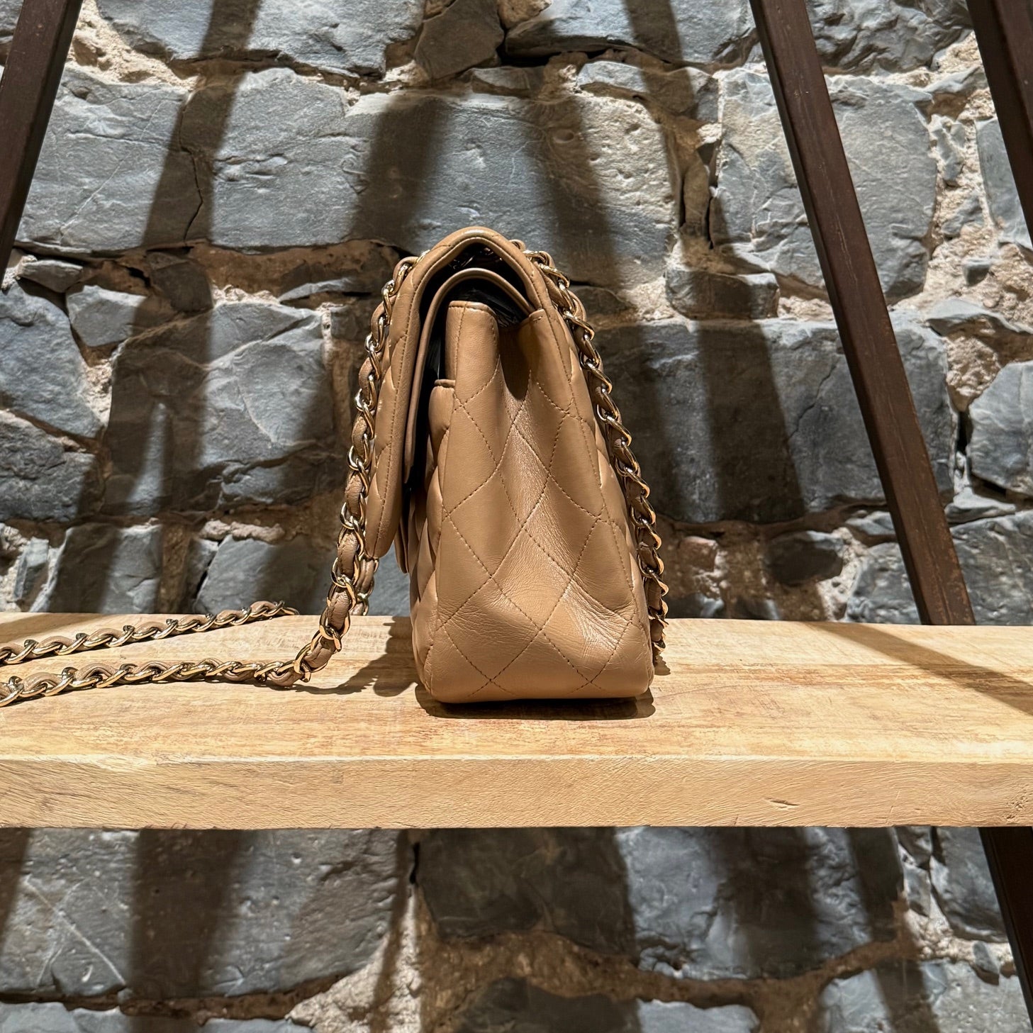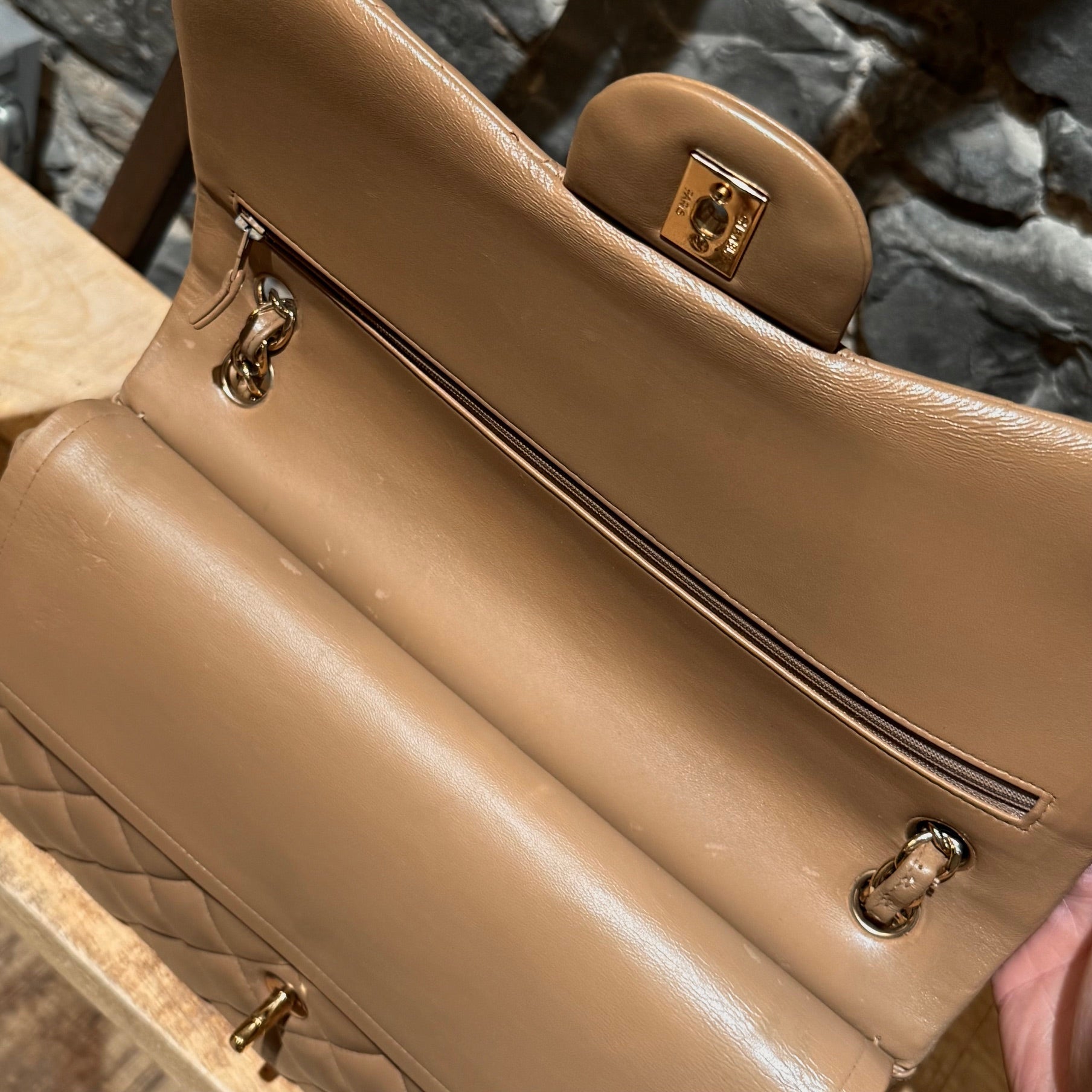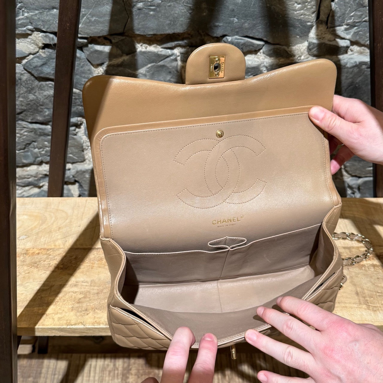 Chanel 2013-2014 Beige Lambskin Jumbo Classic Double Flap Bag. Quilted beige lambskin exterior. Double flap closure with a gold-tone CC turnlock. Half-moon back pocket. Adjustable interwoven gold-tone chain link and beige leather shoulder strap. Interior is beige leather. Zipper compartment, slit pocket, two (2) open pockets and a "lipstick" compartment. Comes with a brand dustbag. Made in Italy.