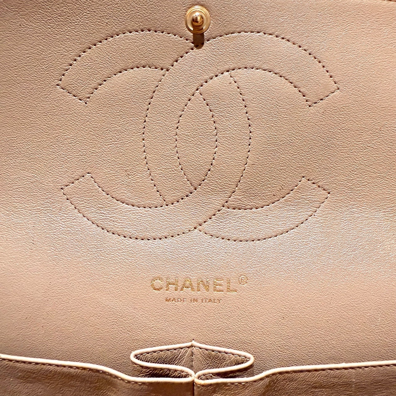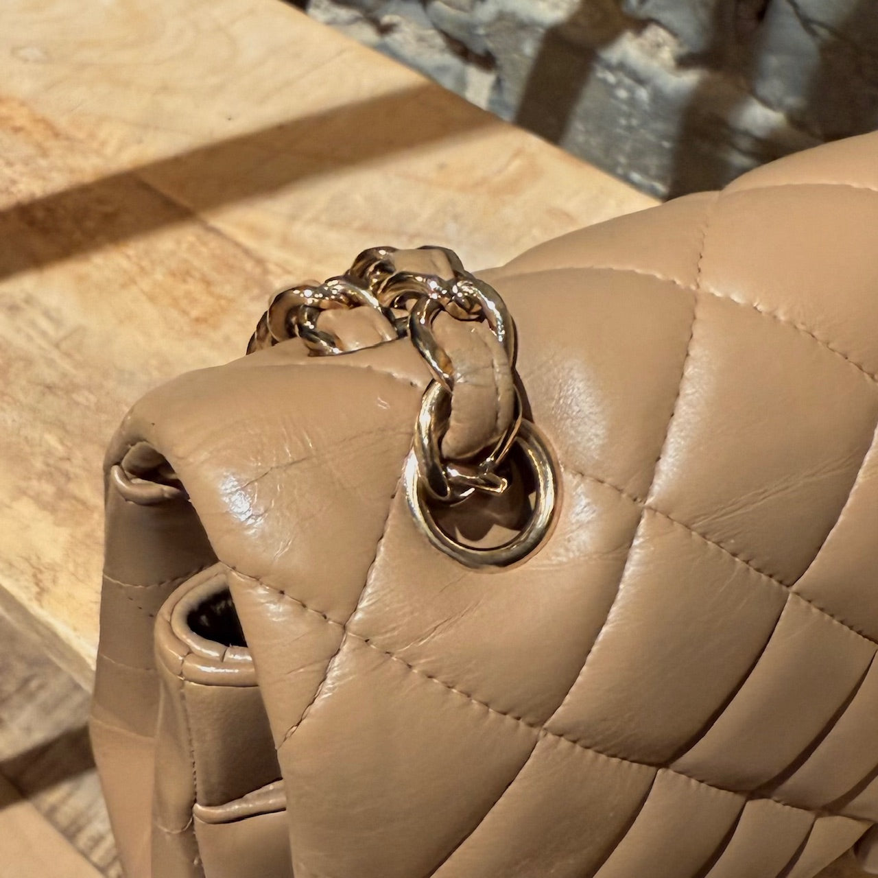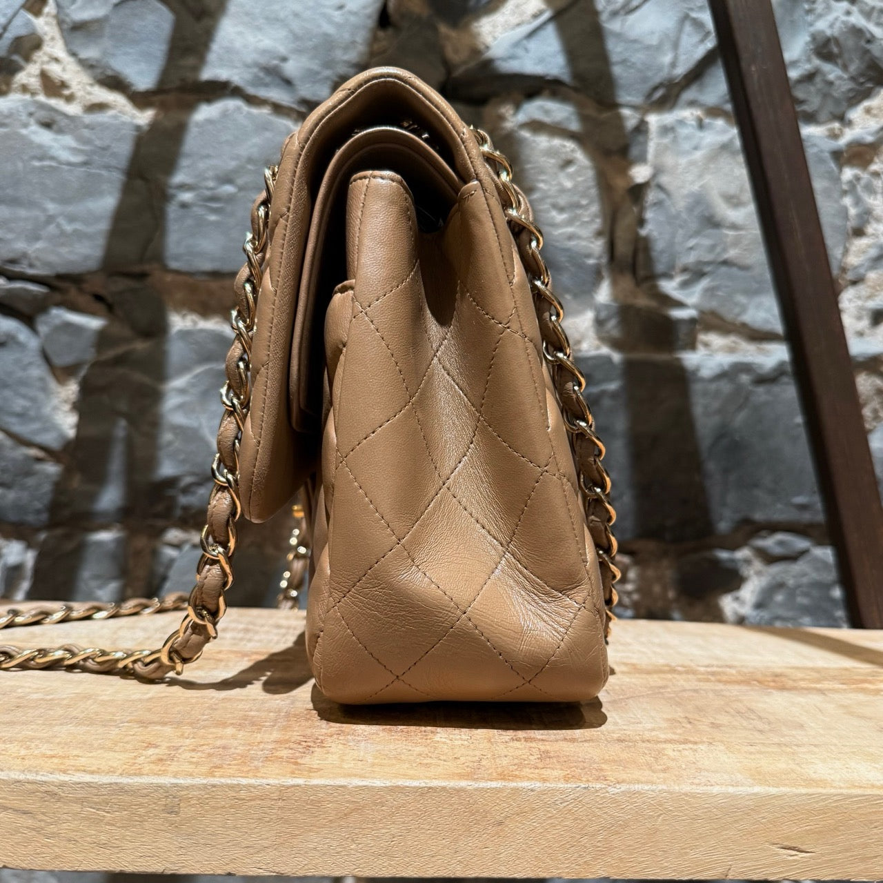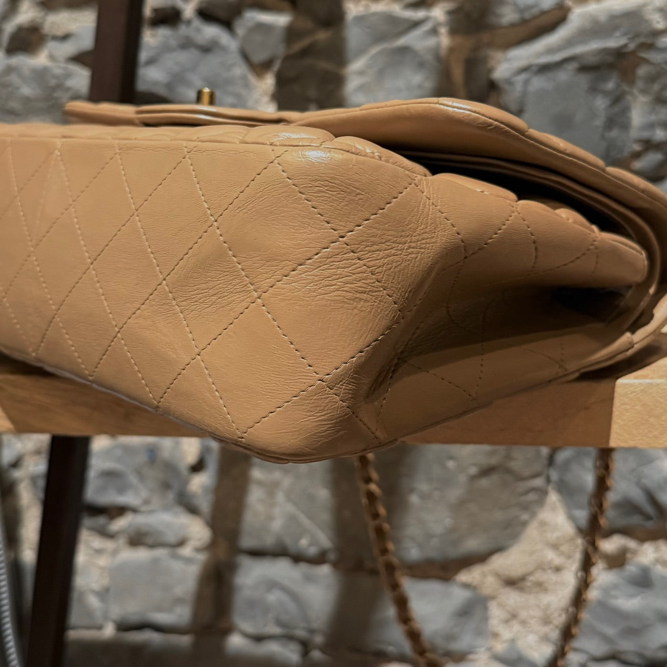 Chanel 2013-2014 Beige Lambskin Jumbo Classic Double Flap Bag. Quilted beige lambskin exterior. Double flap closure with a gold-tone CC turnlock. Half-moon back pocket. Adjustable interwoven gold-tone chain link and beige leather shoulder strap. Interior is beige leather. Zipper compartment, slit pocket, two (2) open pockets and a "lipstick" compartment. Comes with a brand dustbag. Made in Italy.