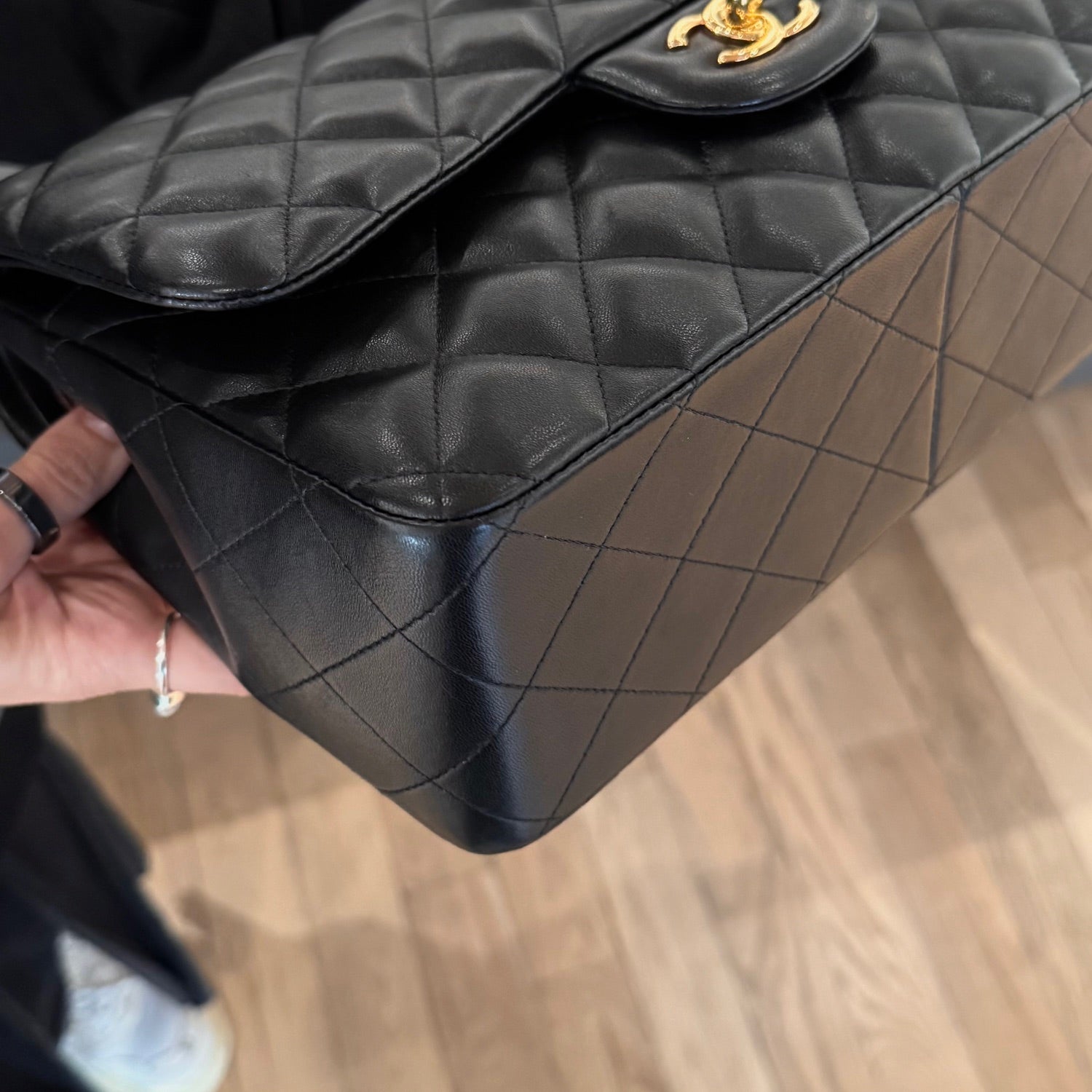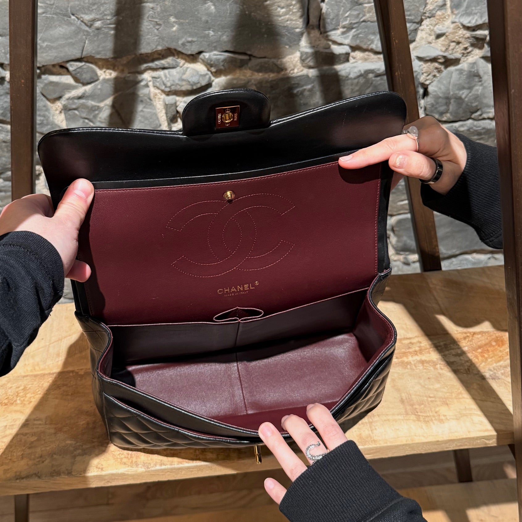 From the 2013-2014 collection by Karl Lagerfeld. Current model name is Classic Large. Signature diamond quilted soft padded black lambskin exterior. Gold-tone hardware. Double flap closure with a CC turn-lock. Half-moon back pocket. Adjustable interwoven chain link and black leather shoulder strap. Burgundy leather interior embossed with the stitched CC logo. Zipper compartment, slit pocket, two (2) open pockets and a "lipstick" compartment. Comes with a Chanel box, dustbag, booklets, hardware glove, ribbon, purchase receipt, and authenticity card. Made in Italy.