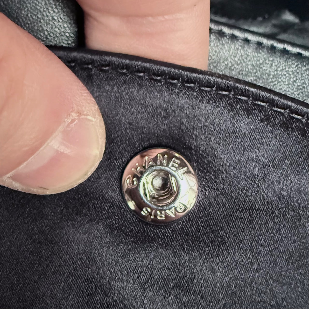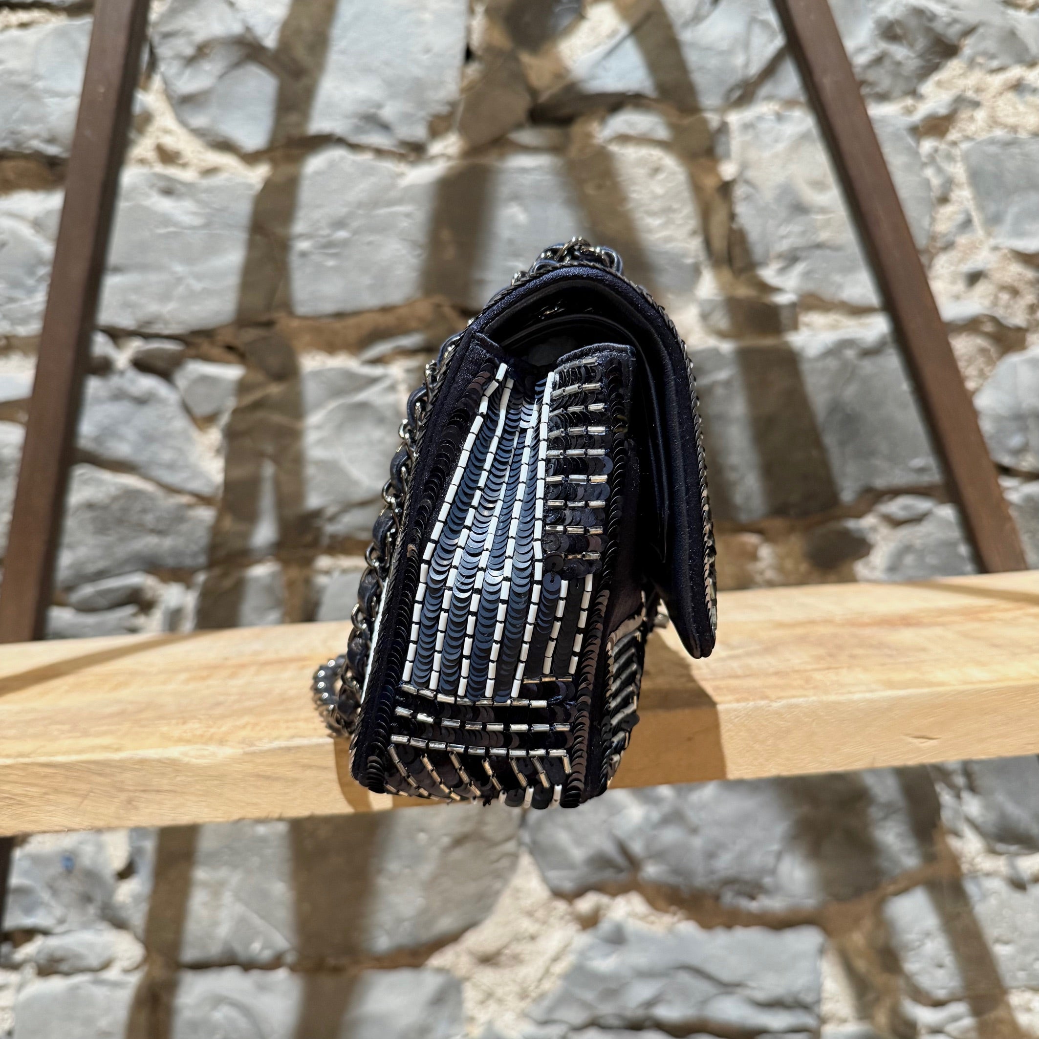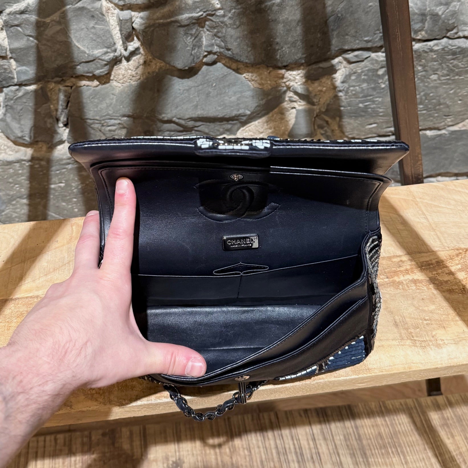 Chanel 2015-2016 Navy Blue Satin Sequin Beaded Medium Double Flap Bag. Rare collectible piece. Structured silhouette in navy satin base. Fully sequin embroidered and beaded in a geometric patchwork design. Classic CC turn-lock closure in silver-tone hardware. Rear patch pocket. Chain strap interlaced with navy blue leather. Leather-lined interior with signature double flap construction. Made in France. Comes with authenticity card and Chanel dustbag.