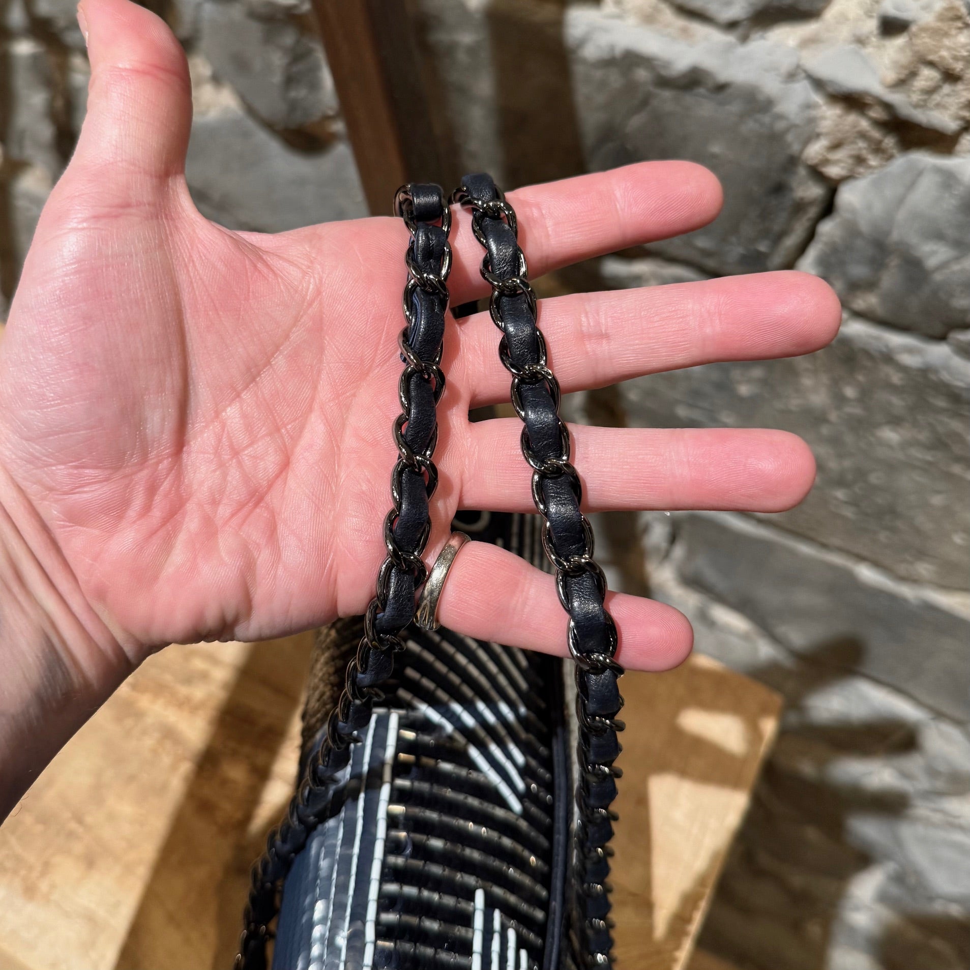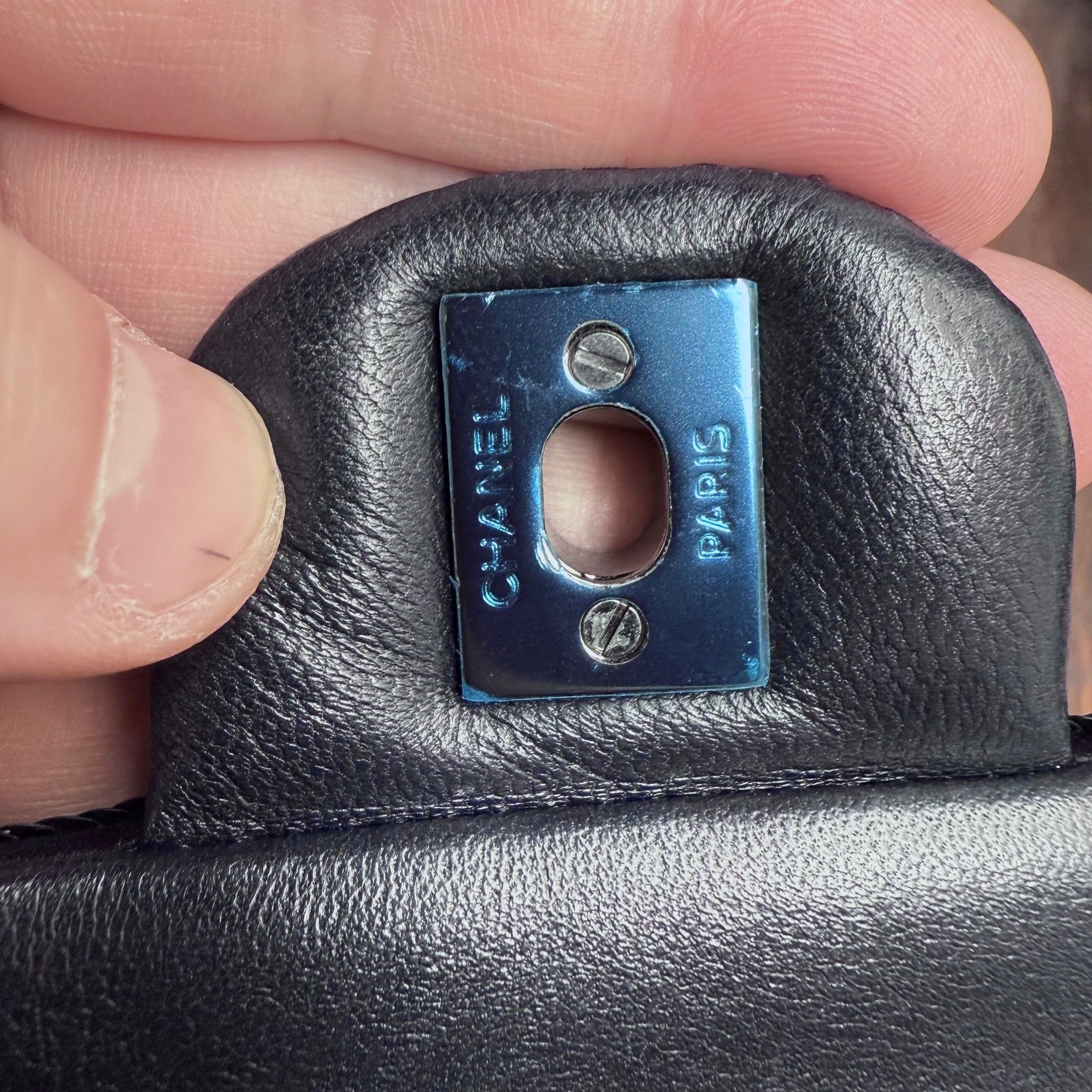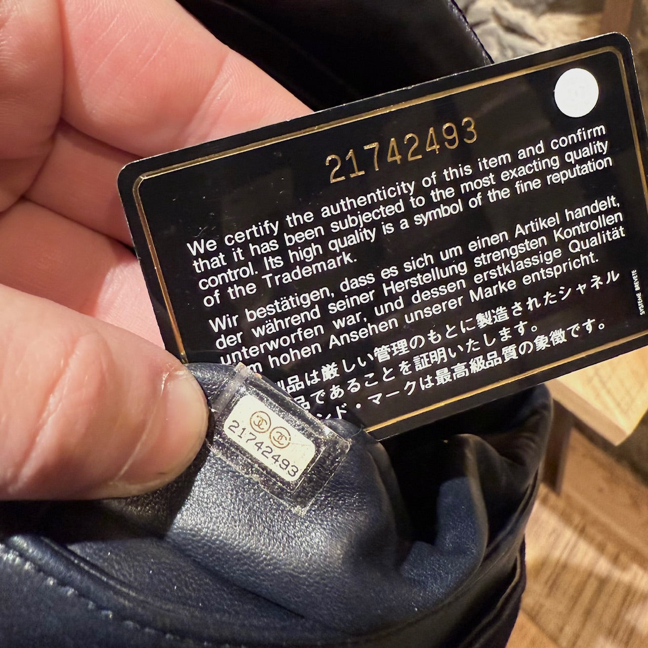 Chanel 2015-2016 Navy Blue Satin Sequin Beaded Medium Double Flap Bag. Rare collectible piece. Structured silhouette in navy satin base. Fully sequin embroidered and beaded in a geometric patchwork design. Classic CC turn-lock closure in silver-tone hardware. Rear patch pocket. Chain strap interlaced with navy blue leather. Leather-lined interior with signature double flap construction. Made in France. Comes with authenticity card and Chanel dustbag.