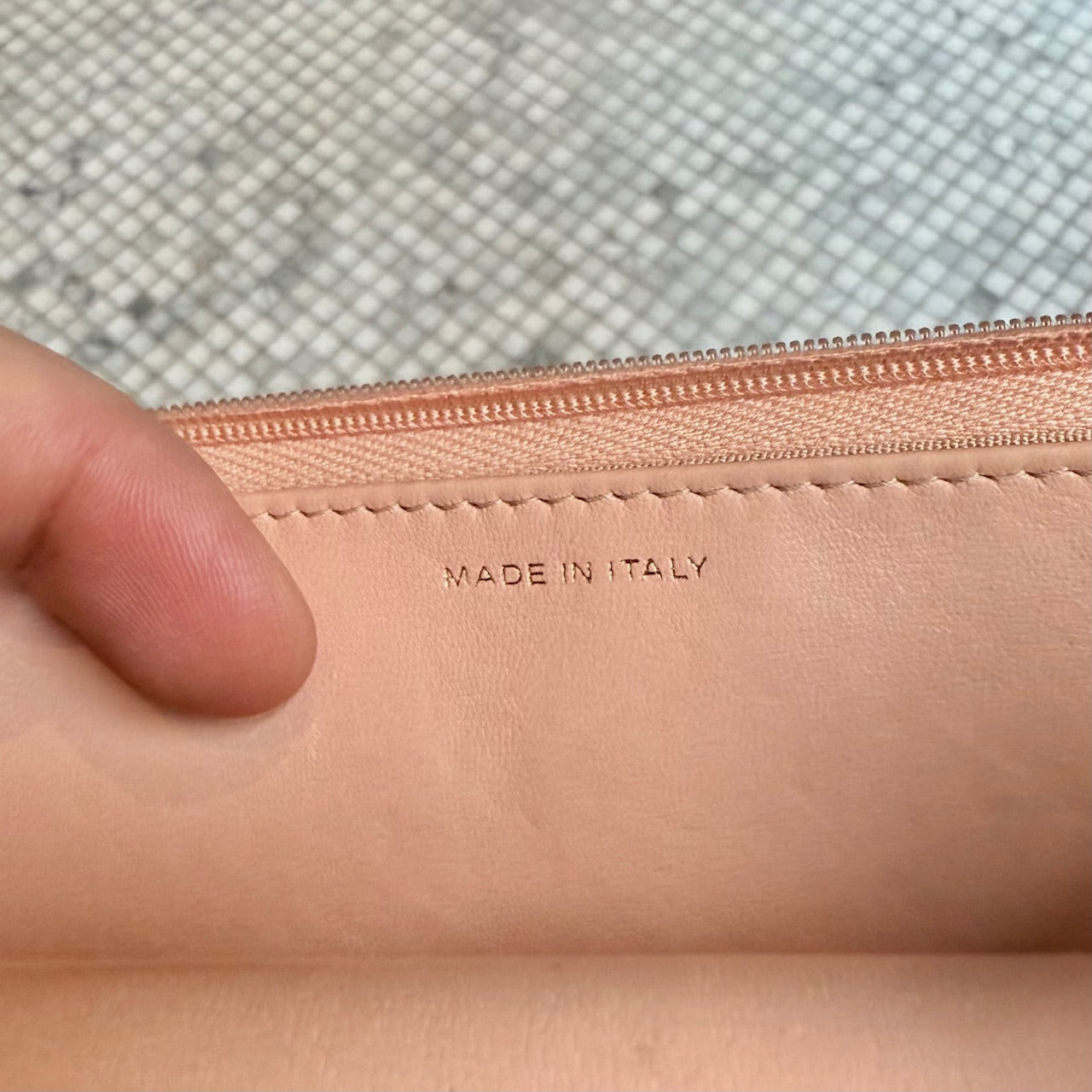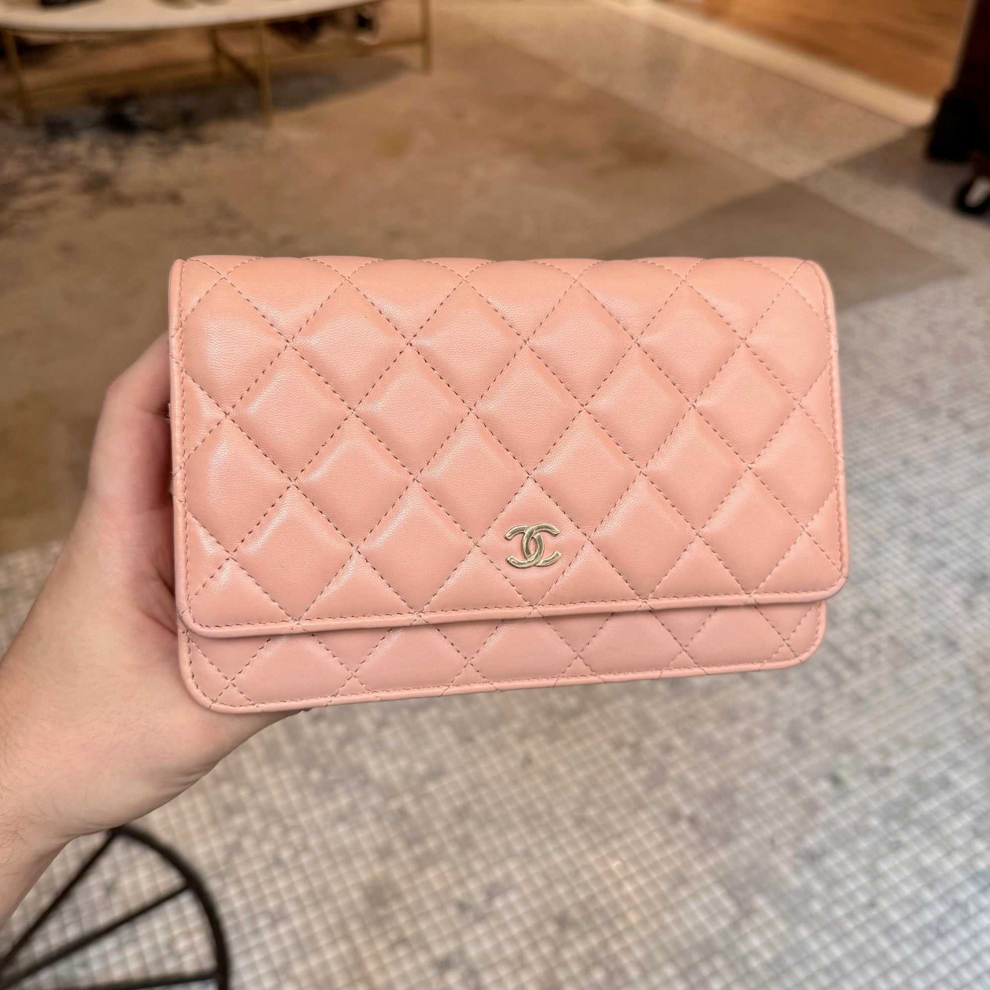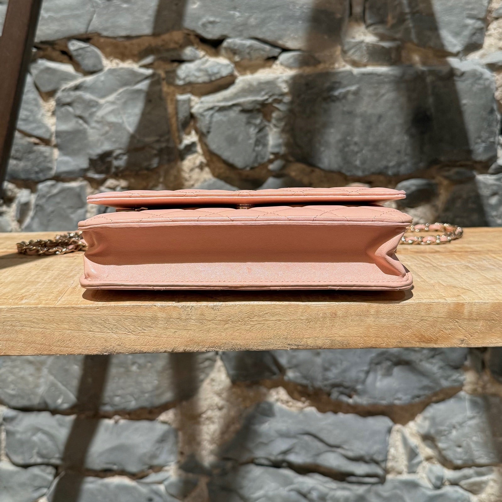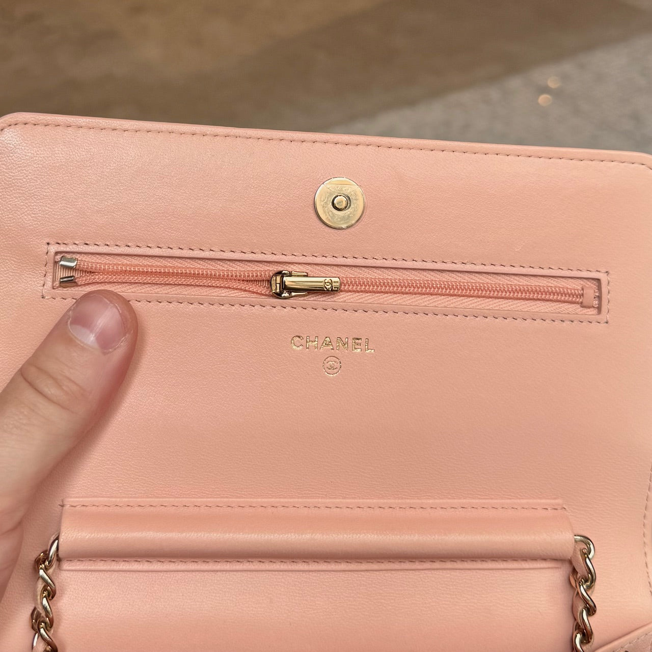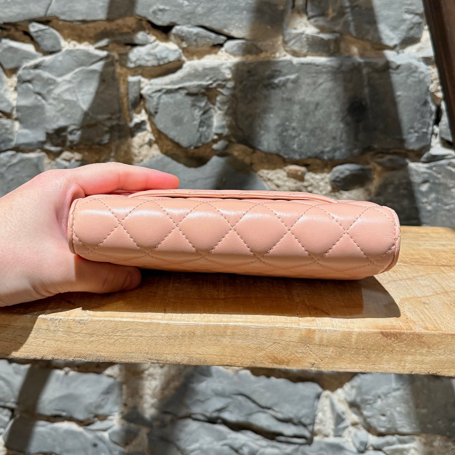 Quilted diamond shape pattern lambskin. Light gold-tone CC logo plaque at front flap. Chain-link with leather shoulder strap. Press-stud snap fastening. Pink leather and grosgrain interior lining. Half-moon–shaped pocket at back. Made In Italy. Comes with Chanel authenticity card, dustbag and box.