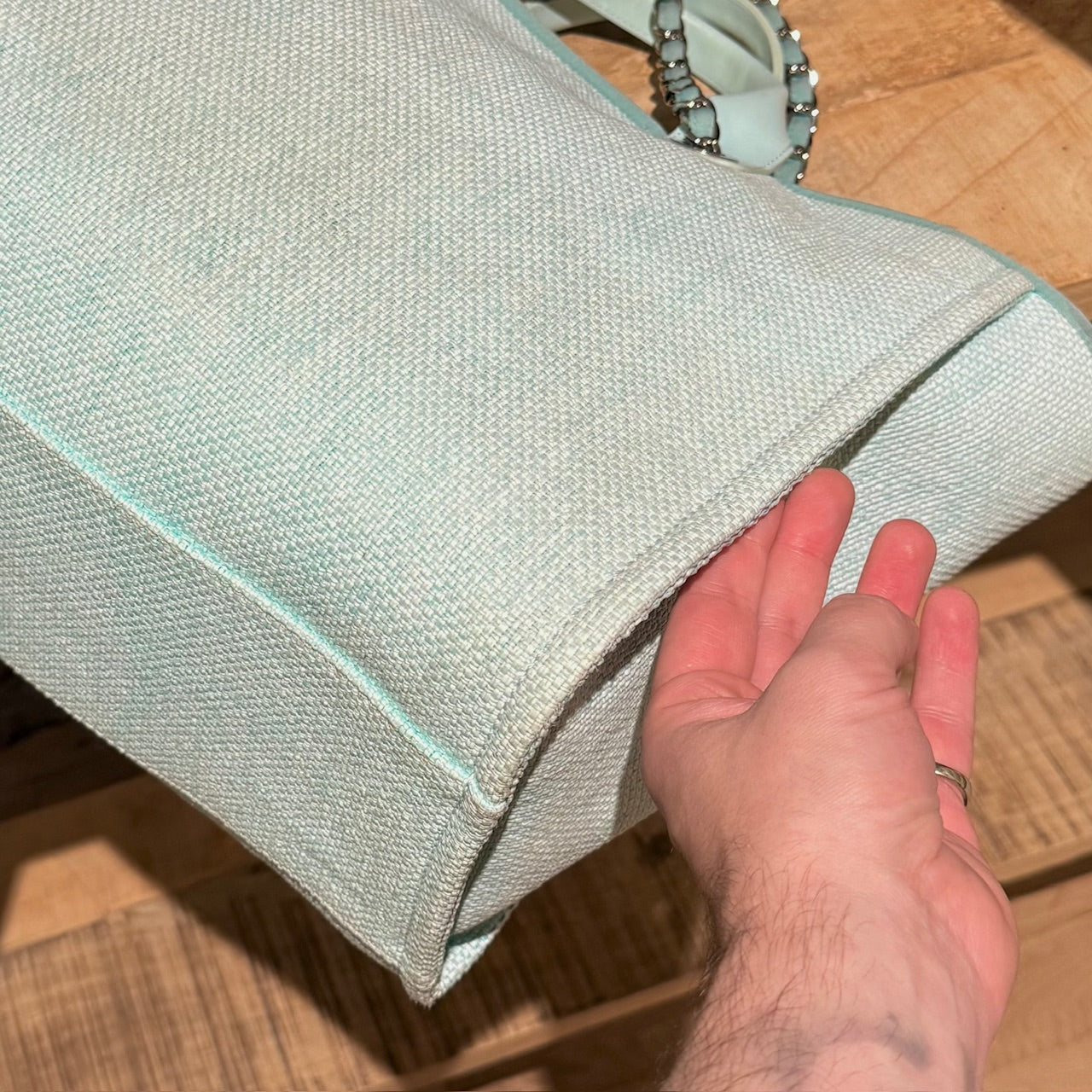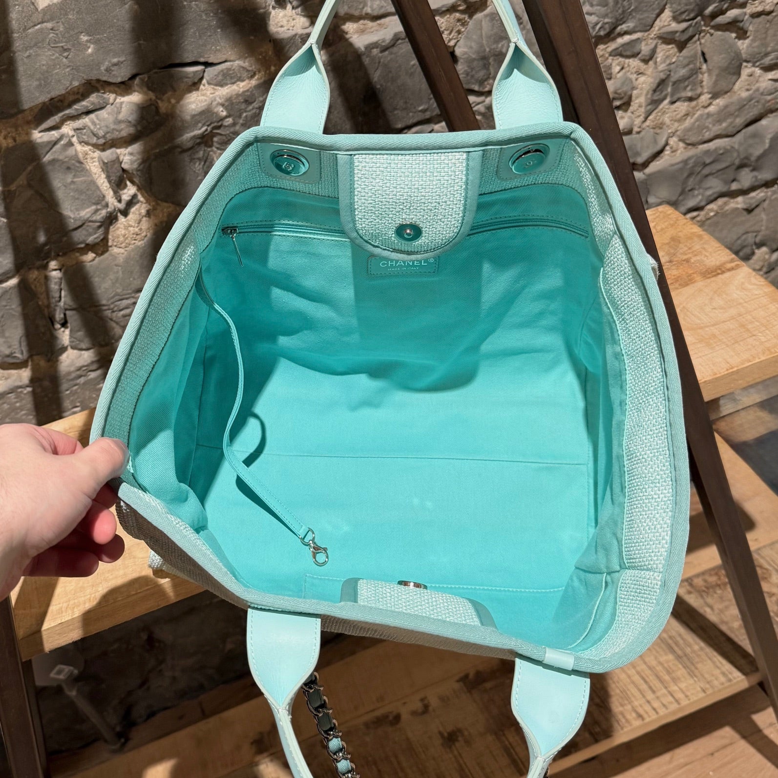 From the 2017 collection. Turquoise woven straw (raffia). Silver-tone branded hardware. The exterior displays the CHANEL logo and “31 RUE CAMBON PARIS” embroidery on the front panel. Dual rolled leather top handles and fabric-threaded chain shoulder straps. Magnetic snap closure. Interior lined in turquoise fabric with one (1) zip pocket and a key clasp. Made in Italy. Comes with authenticity card and date code sticker.