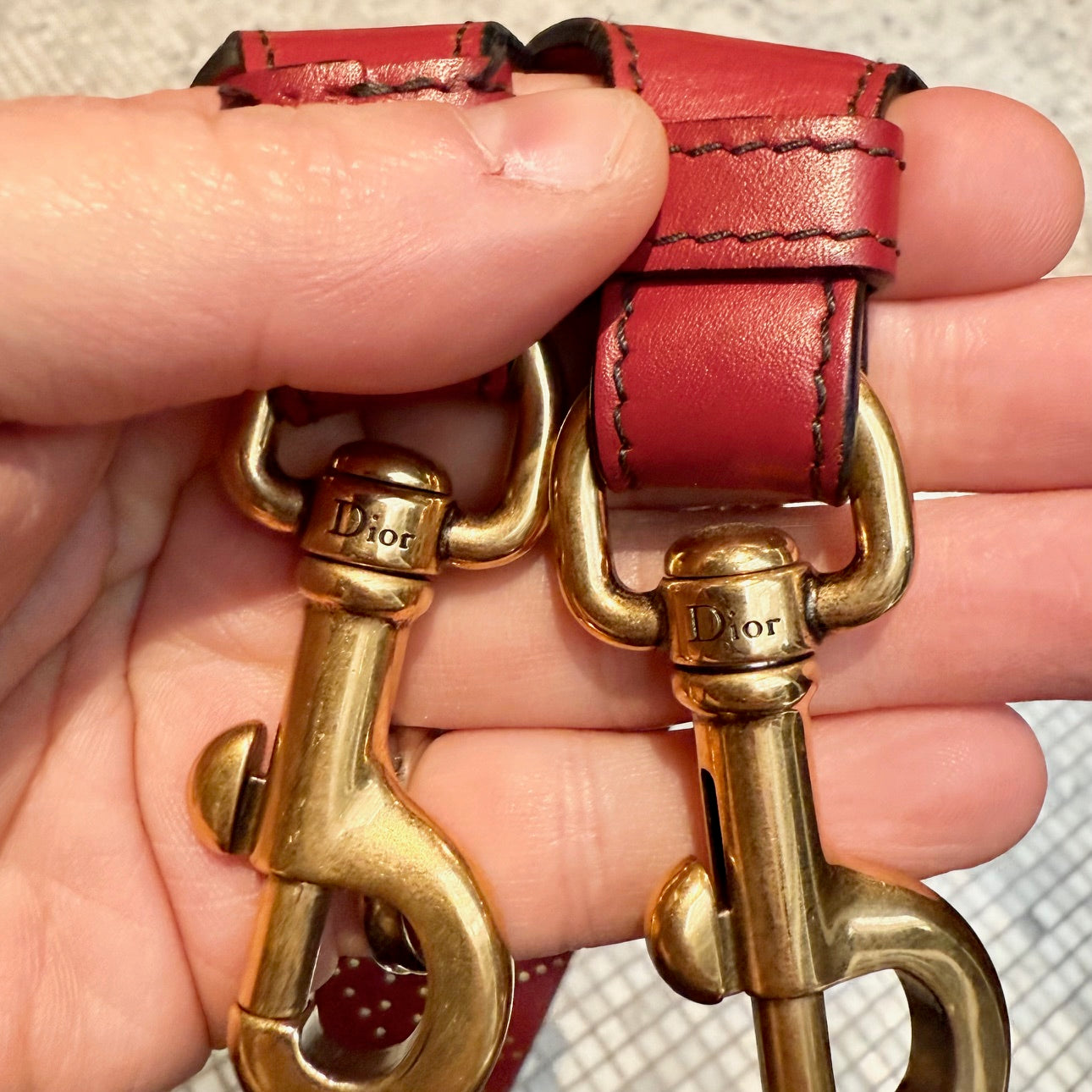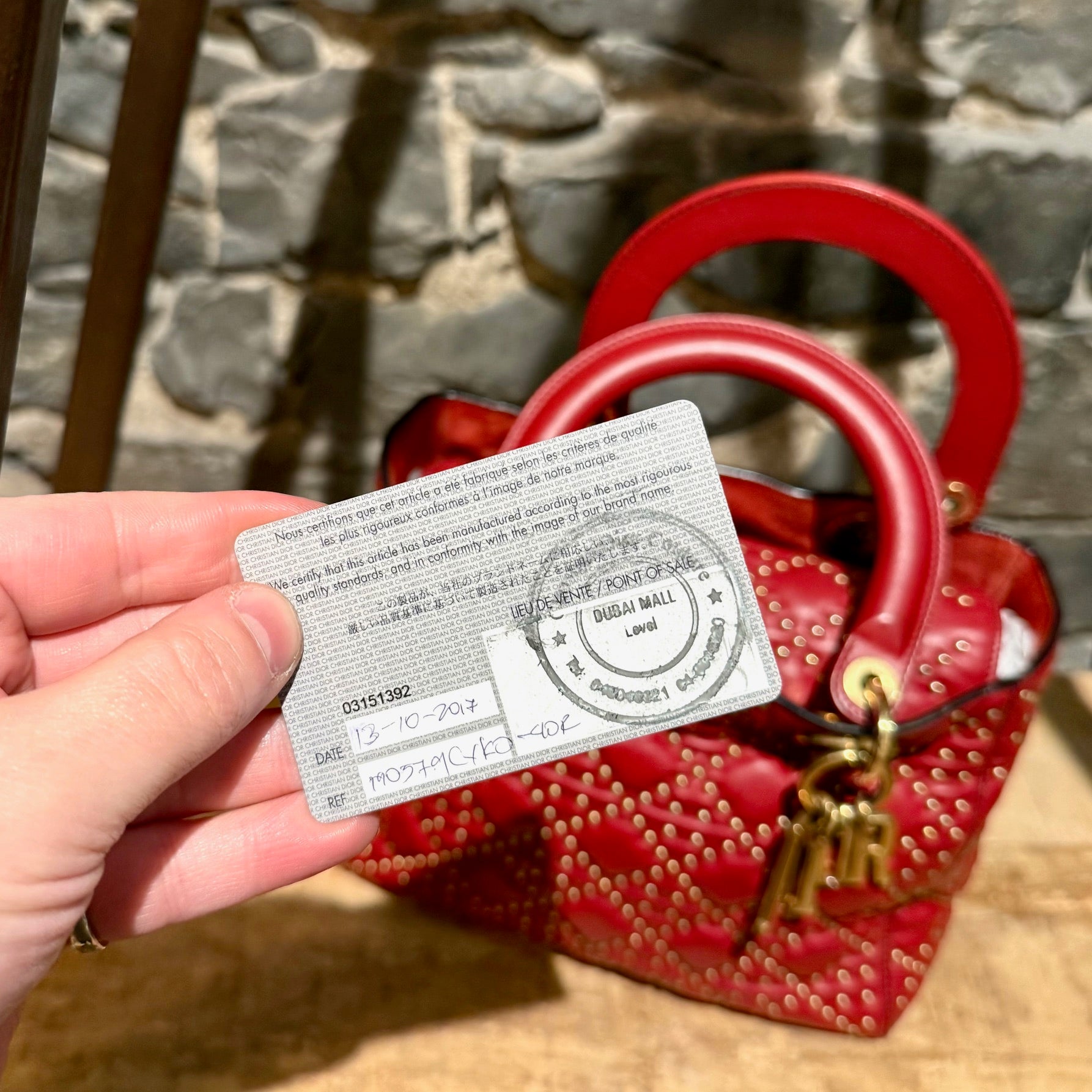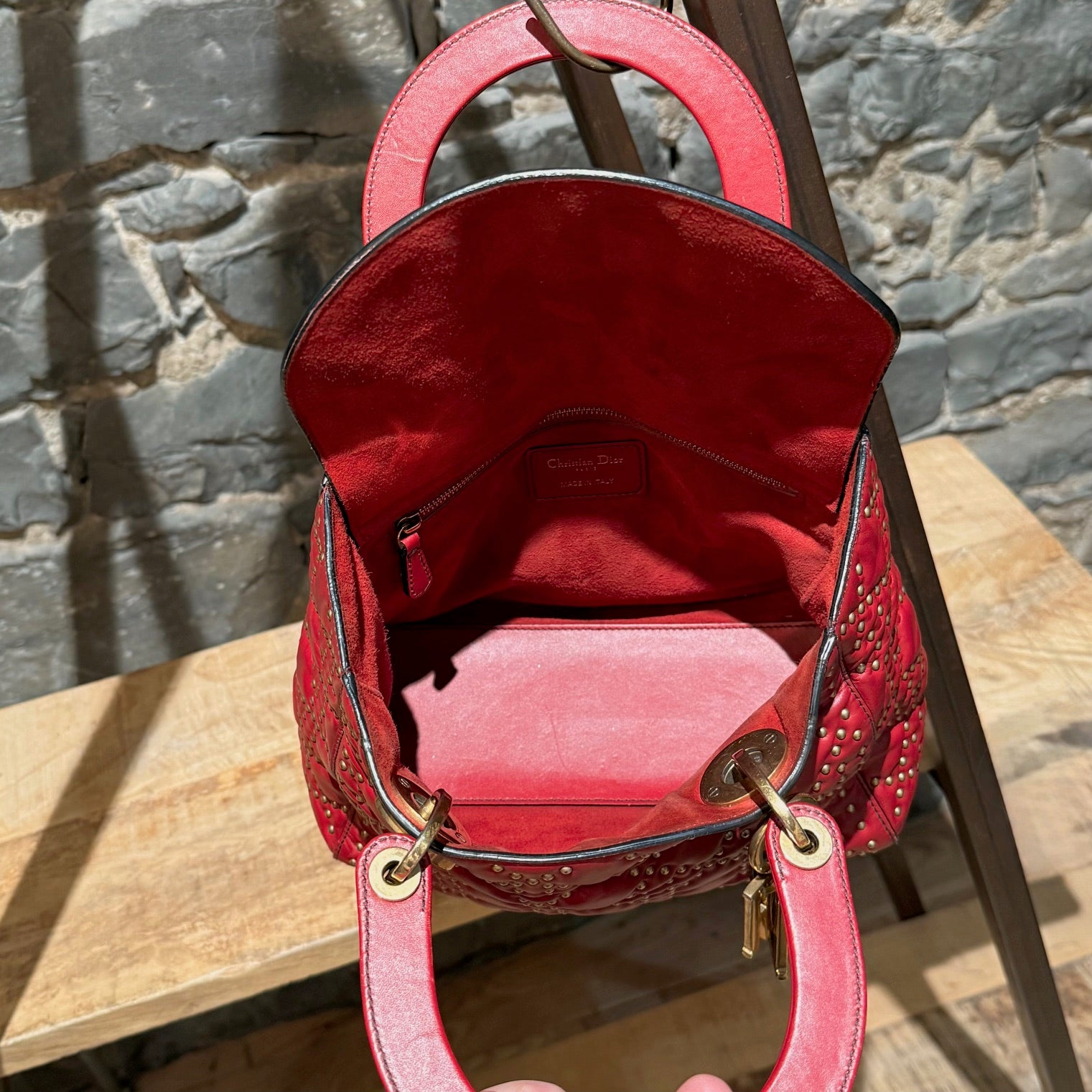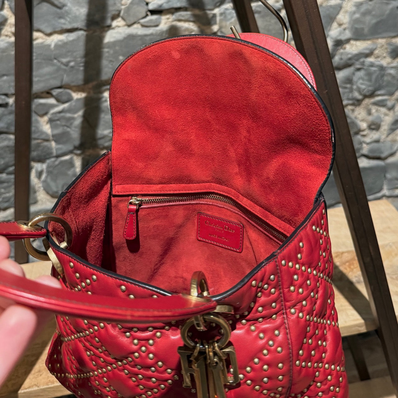From the 2017 collection. Red smooth leather with quilted Cannage stitching and gold-tone stud details across all sides. Relaxed, yet structured silhouette. Dual top handles. Gold-tone branded metal hardware and Dior letter charms. Wide removable leather strap with matching stud pattern. Flap closure at top. Suede-lined interior with zip pocket. Base with four (4) protective metal feet. Made in Italy. Comes as is with Dior authenticity card.