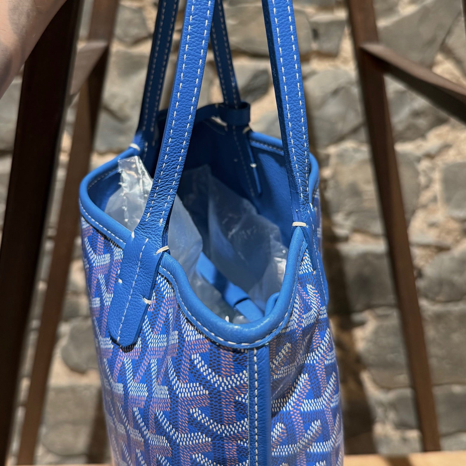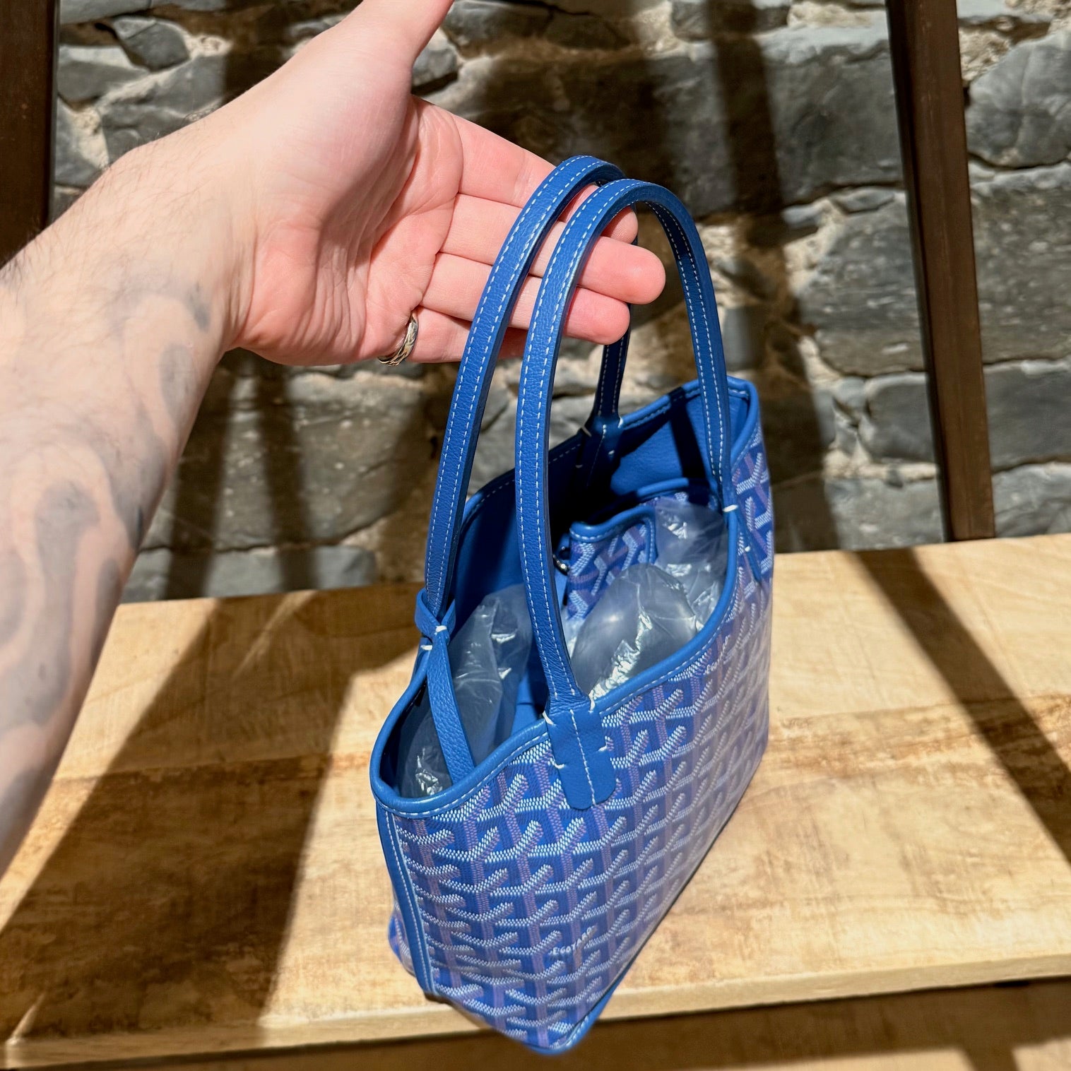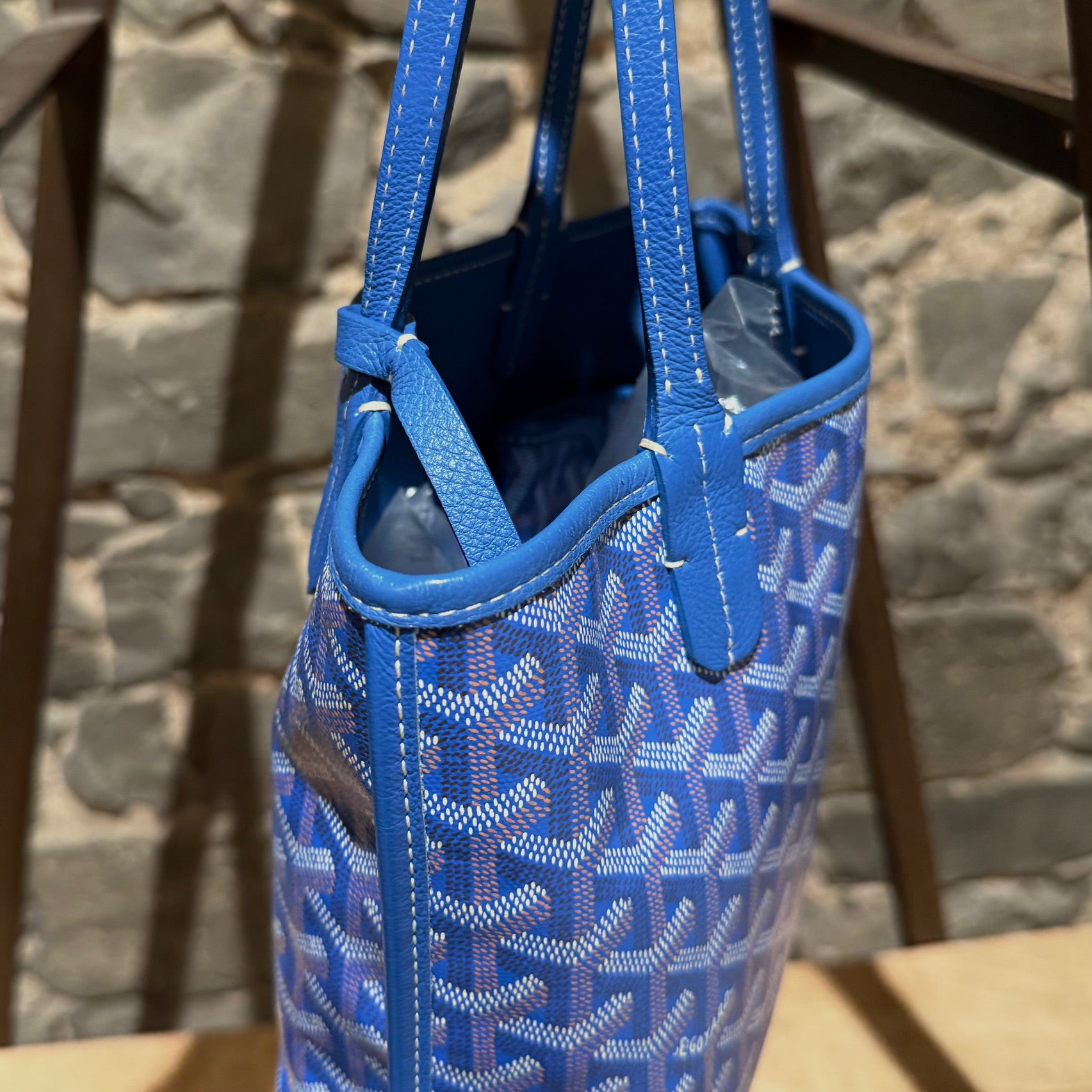 Compact structured silhouette. Open top mini tote bag. Blue Goyardine coated canvas with signature chevron and logo pattern. Tonal leather trim around all edges. Double flat leather handles. Reinforced bottom piping. Smooth blue leather interior. Detachable matching pouch, lined in beige canvas. Branded logo snap closure. Made in France. Comes with Goyard dustbag.