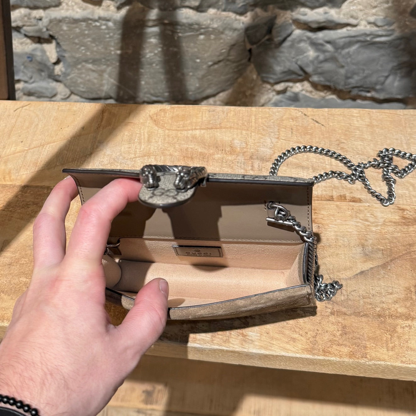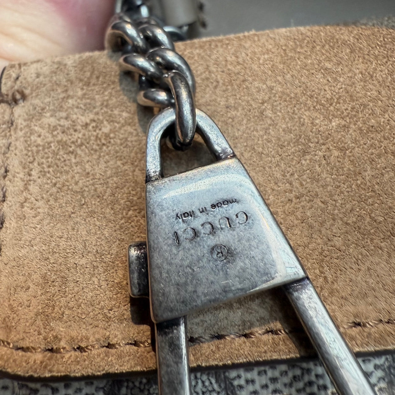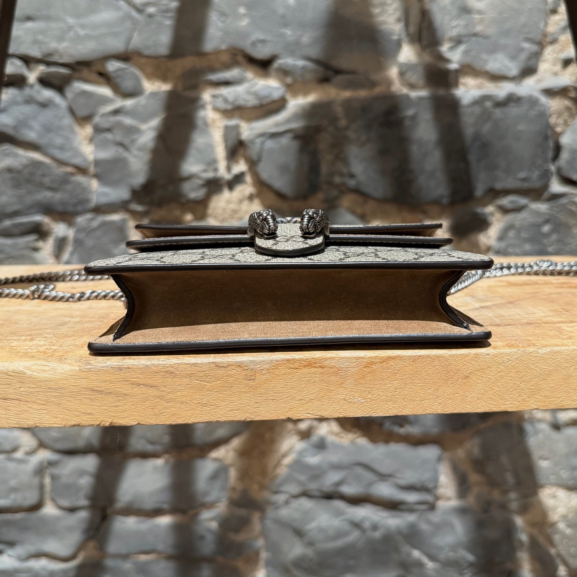 GG Supreme canvas with taupe suede lining and trim. Compact structured silhouette with a flap top closure and antique silver-tone tiger head U-shaped clasp. Interior key ring, that can also be attached to a larger bag. Removable antique silver-tone chain shoulder strap and magnetic snap closure. Branded hardware. Can be worn as a shoulder or crossbody bag. Made in Italy. Comes with original Gucci box, dustbag, care cards, ribbon, and tags.