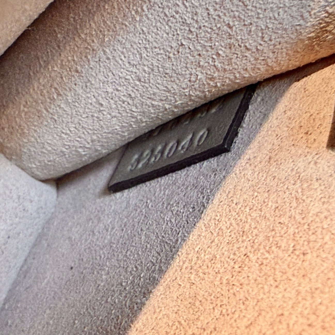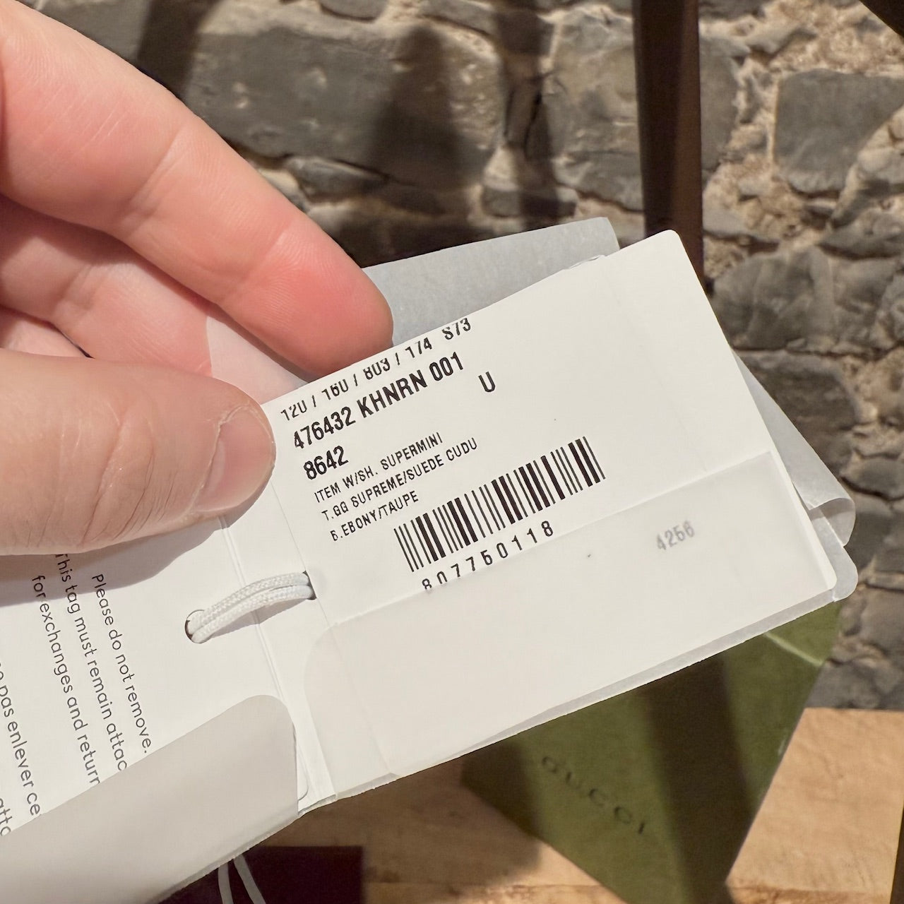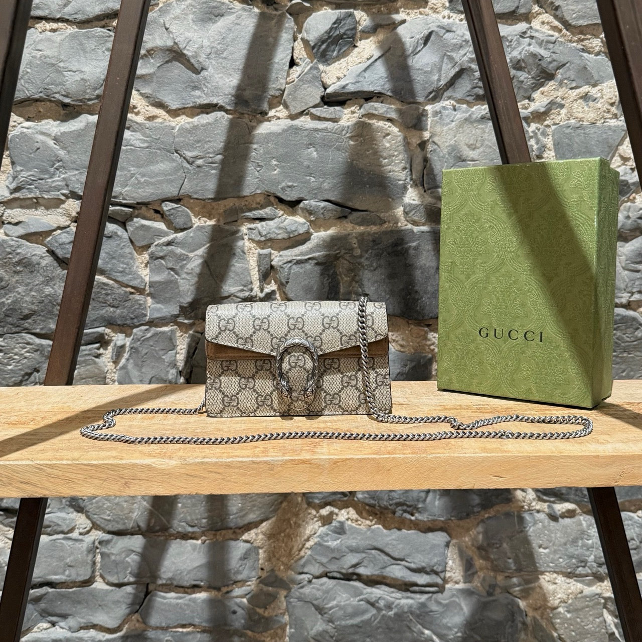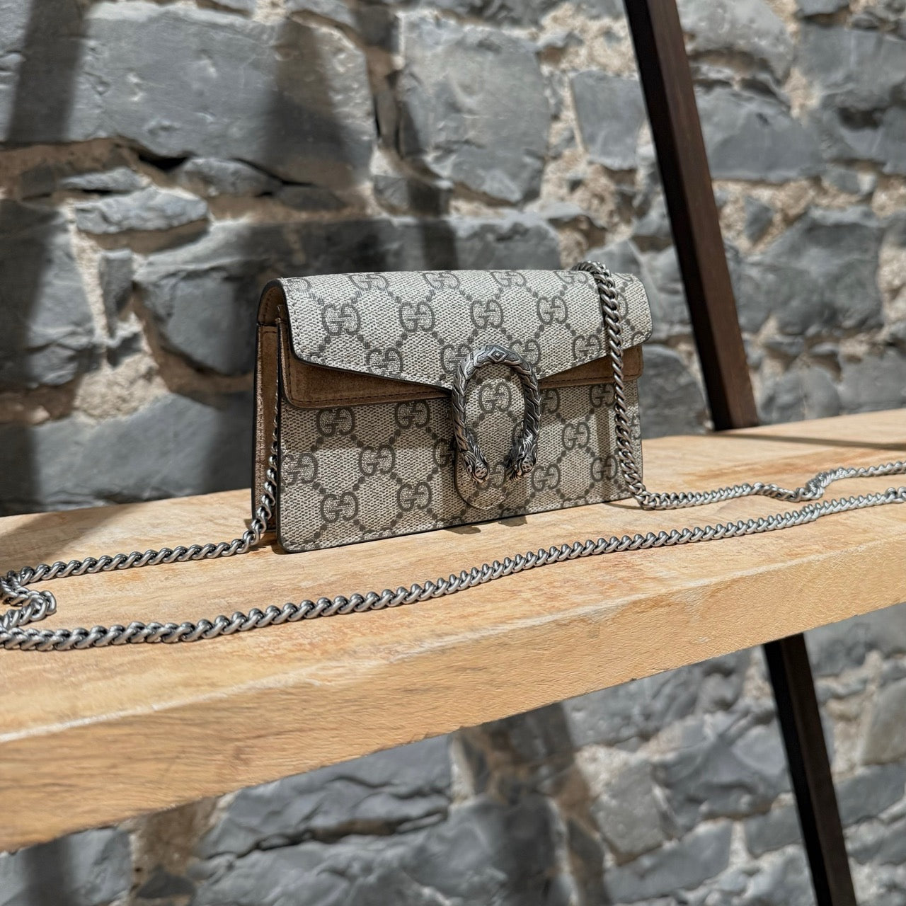 GG Supreme canvas with taupe suede lining and trim. Compact structured silhouette with a flap top closure and antique silver-tone tiger head U-shaped clasp. Interior key ring, that can also be attached to a larger bag. Removable antique silver-tone chain shoulder strap and magnetic snap closure. Branded hardware. Can be worn as a shoulder or crossbody bag. Made in Italy. Comes with original Gucci box, dustbag, care cards, ribbon, and tags.