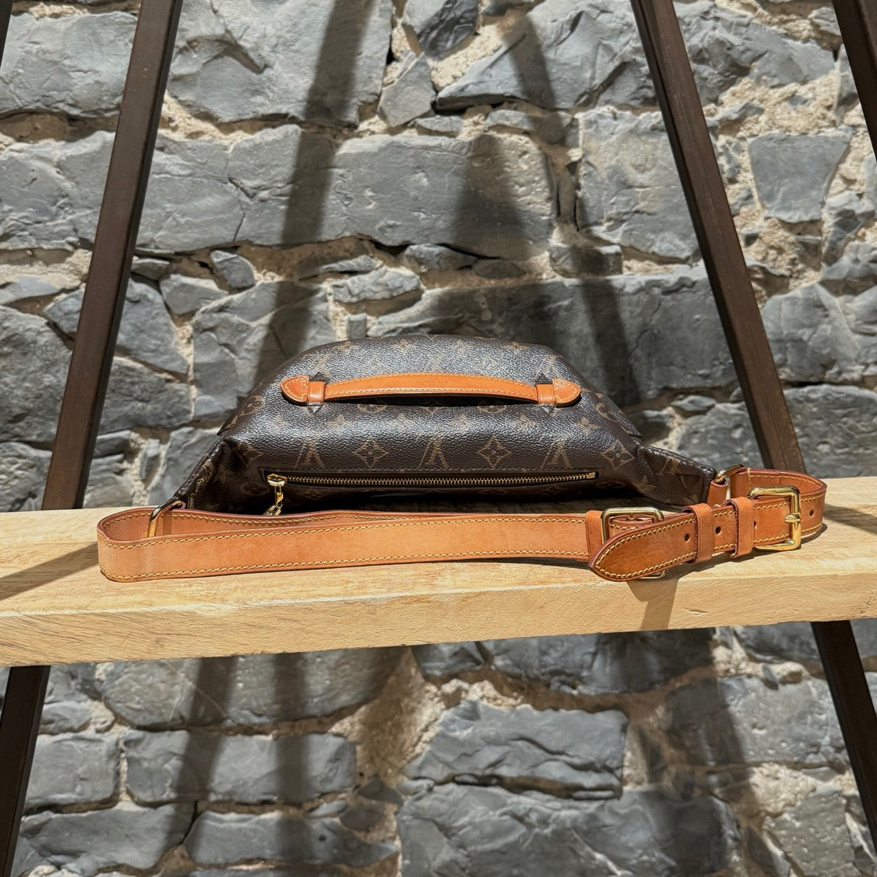 From the 2019 collection. Curved silhouette belt bag. Can we worn accross the body. Monogram coated canvas with natural cowhide leather trim. Branded gold-tone hardware. Front double zipper closure with pulls. Rear zipper pocket. Branded leather top handle. Adjustable leather belt strap with buckle. Black textile interior. Made in France. Comes with a Louis Vuitton dustbag.