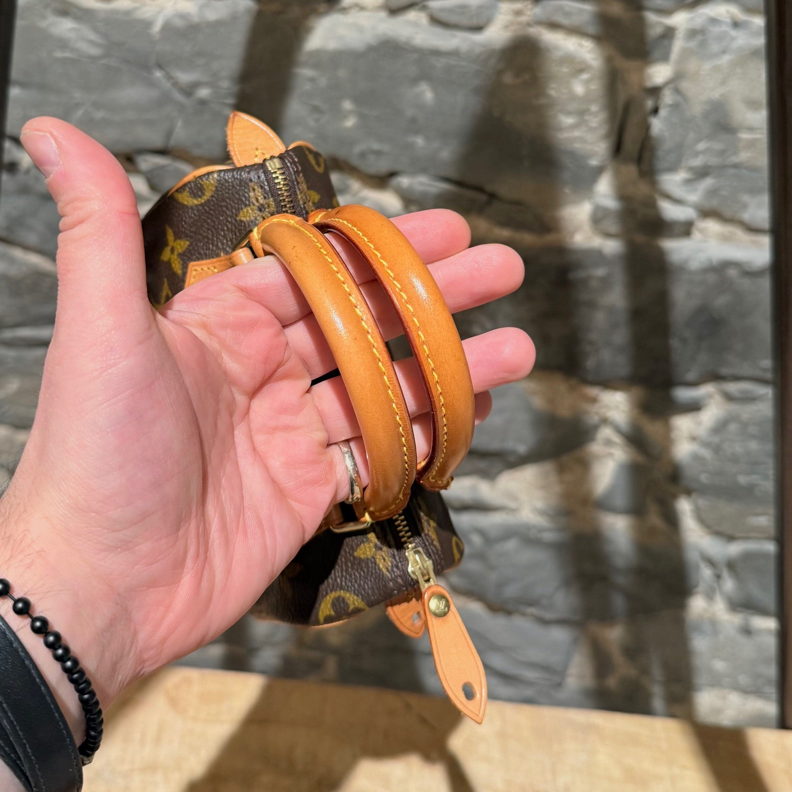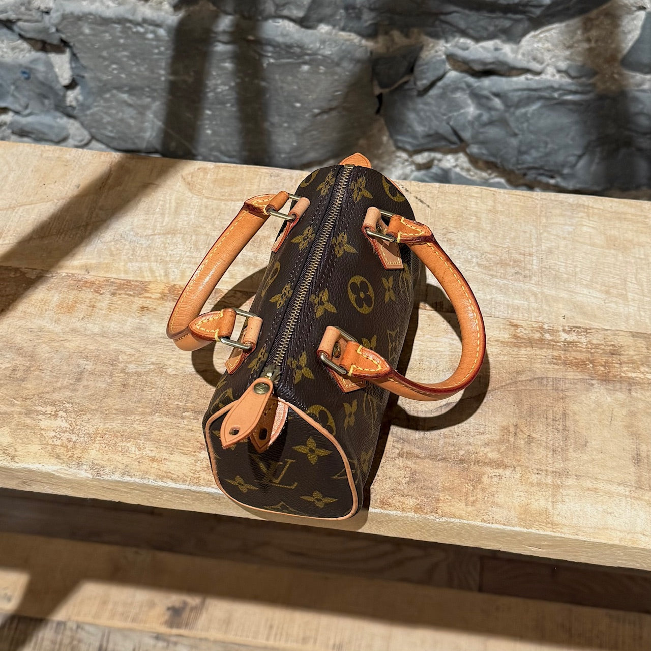 Classic Speedy HL silhouette in mini size. From the 1998 collection. Monogram coated canvas with natural cowhide leather (vachetta) handles, trim, and tabs. Branded gold-tone hardware. Top zipper closure with leather pull tab. Rounded double handles. Brown textile lining. Made in France. Comes with a Louis Vuitton dustbag.
