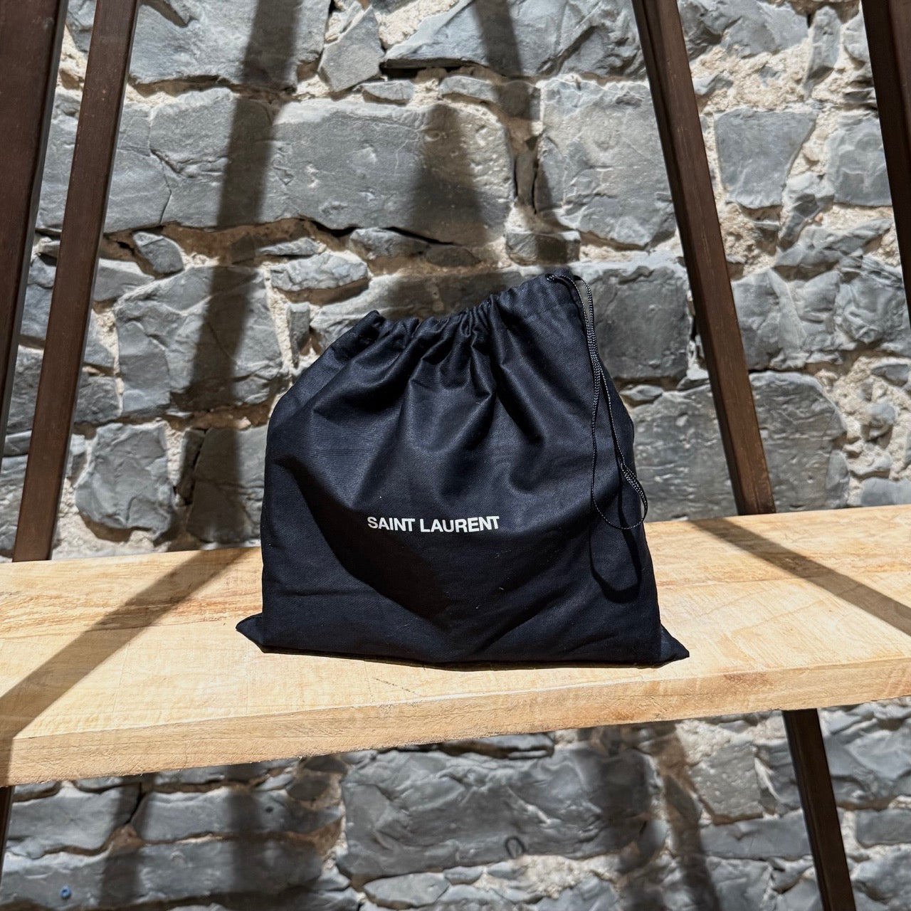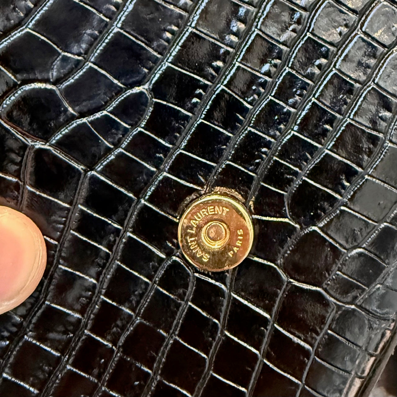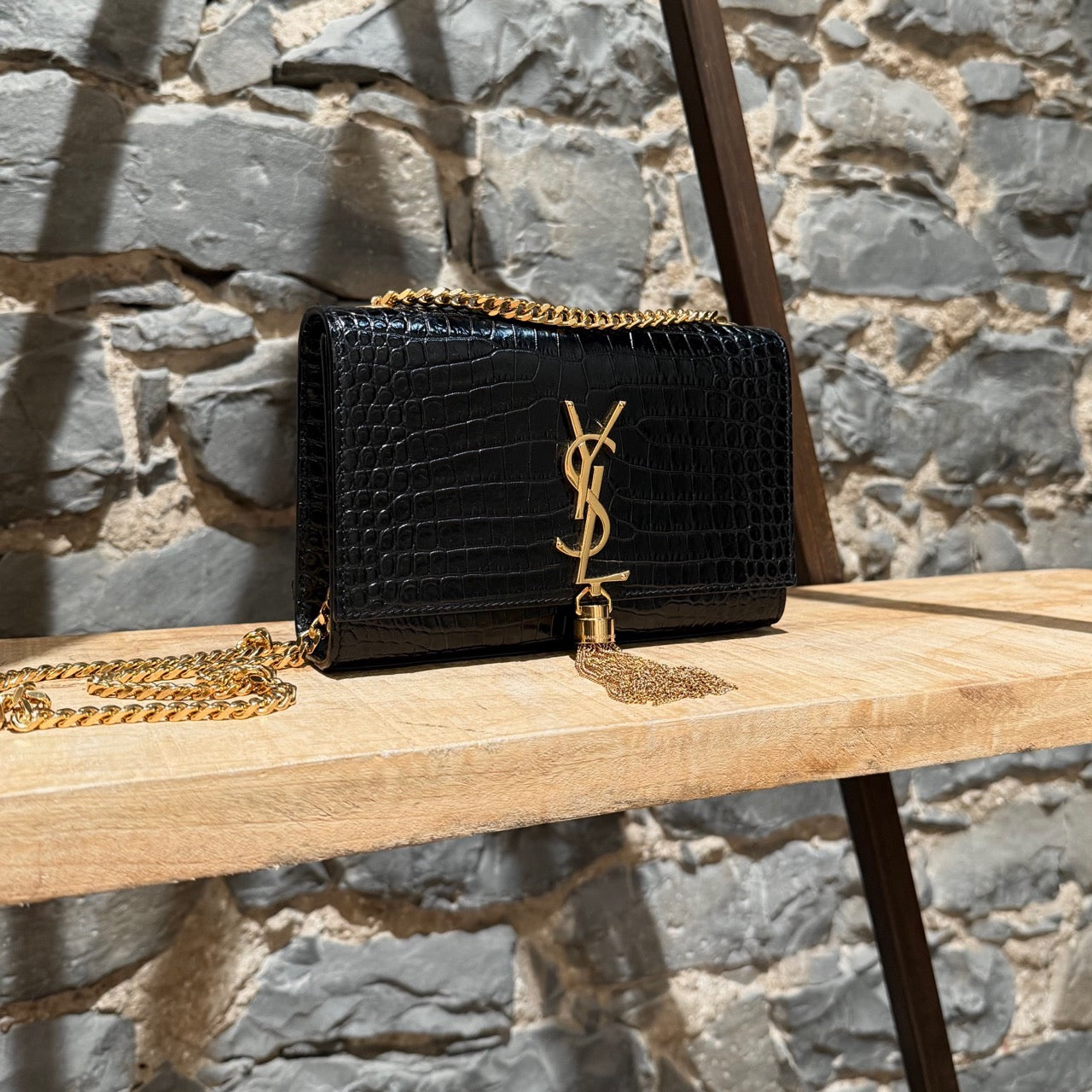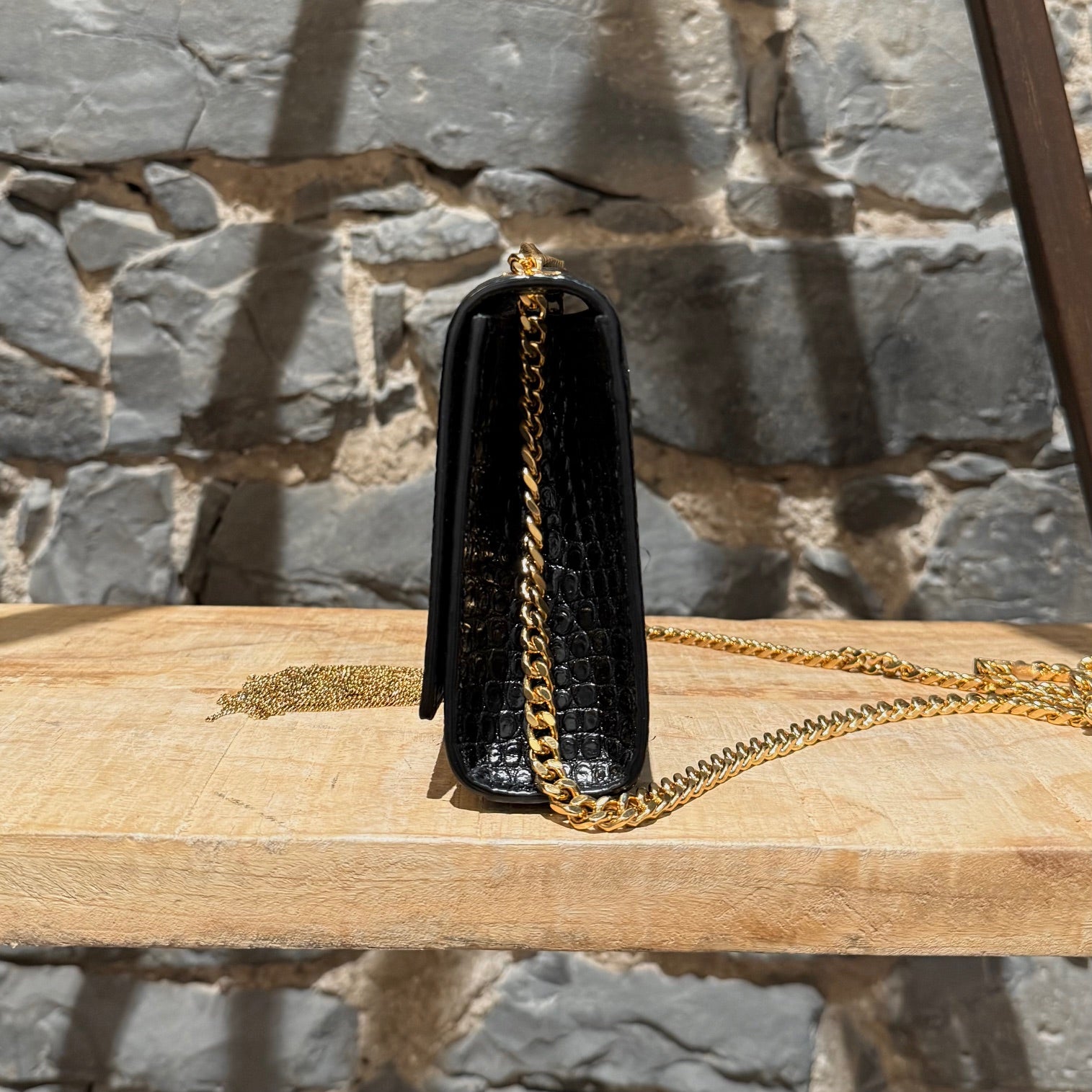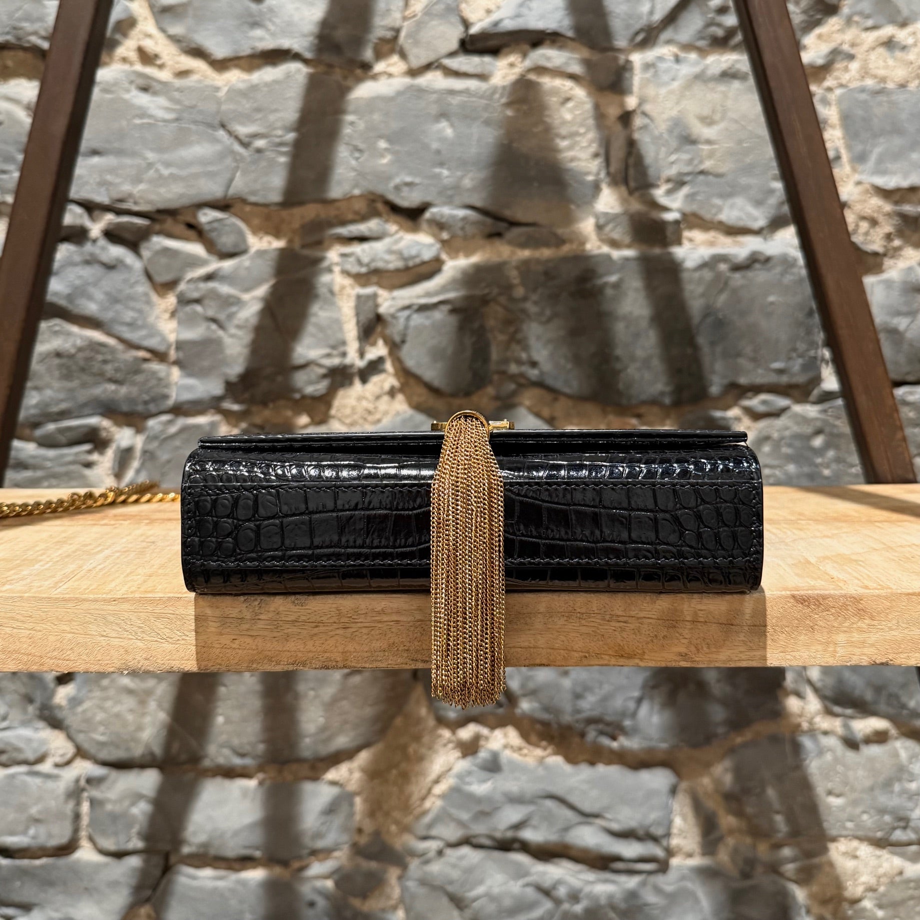 Glossy Croc embossed black leather exterior with structured rectangular silhouette and magnetic flap closure. Branded gold tone hardware. YSL monogram hardware at front with long chain tassel detail. Chain shoulder strap. Single interior compartment with gros grain fabric lining, and flat slip pocket. Made in Italy. Comes with Saint Laurent dustbag.