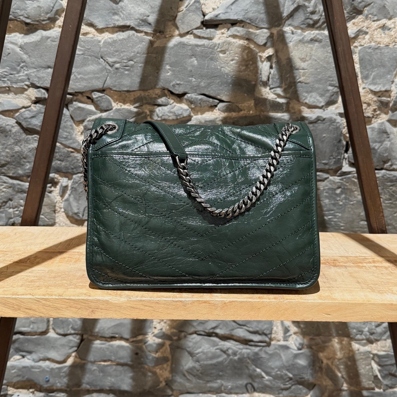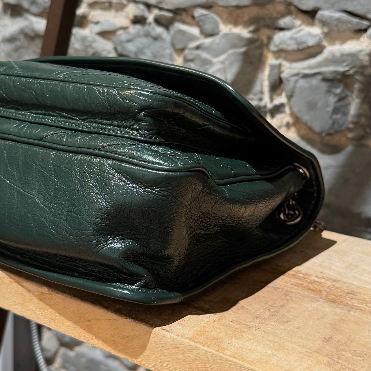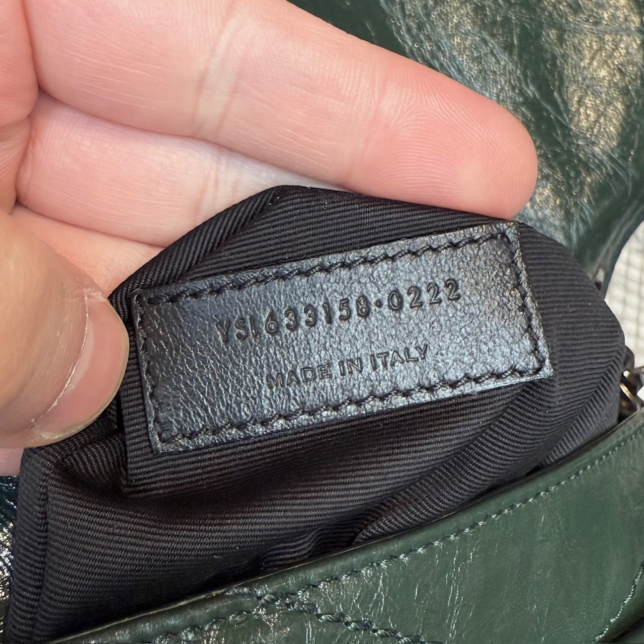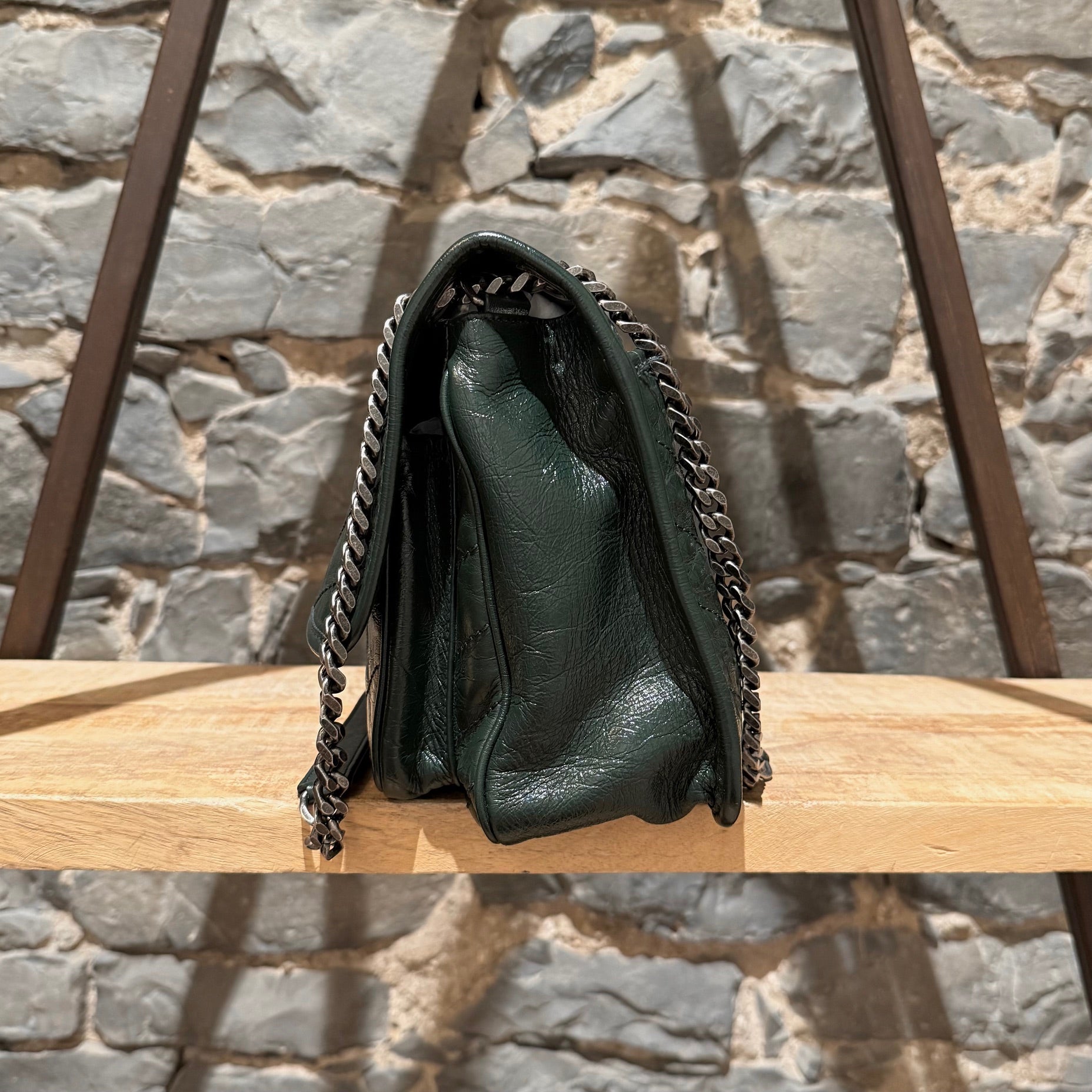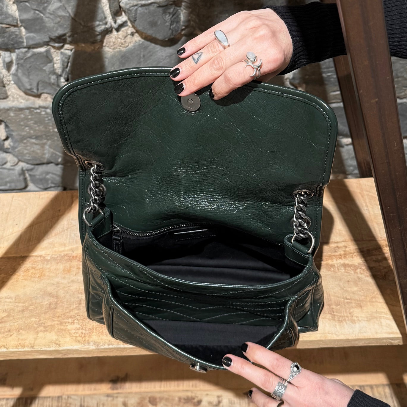 Crinkled "vintage"leather in dark forest green. Flap with magnetic snap closure engraved “Saint Laurent Paris.” Quilted chevron stitching. YSL monogram metal plaque covered in tonal dark green leather. Dark antique silver-tone curb chain strap with leather shoulder pads. Can be worn as a shoulder strap, crossbody, or doubled as dual handles. Black fabric lining. Main compartment with zip pocket and smaller compartment at front under the flap. Exterior back pocket with magnetic closure. Made in Italy. Comes with a Saint Laurent dustbag.