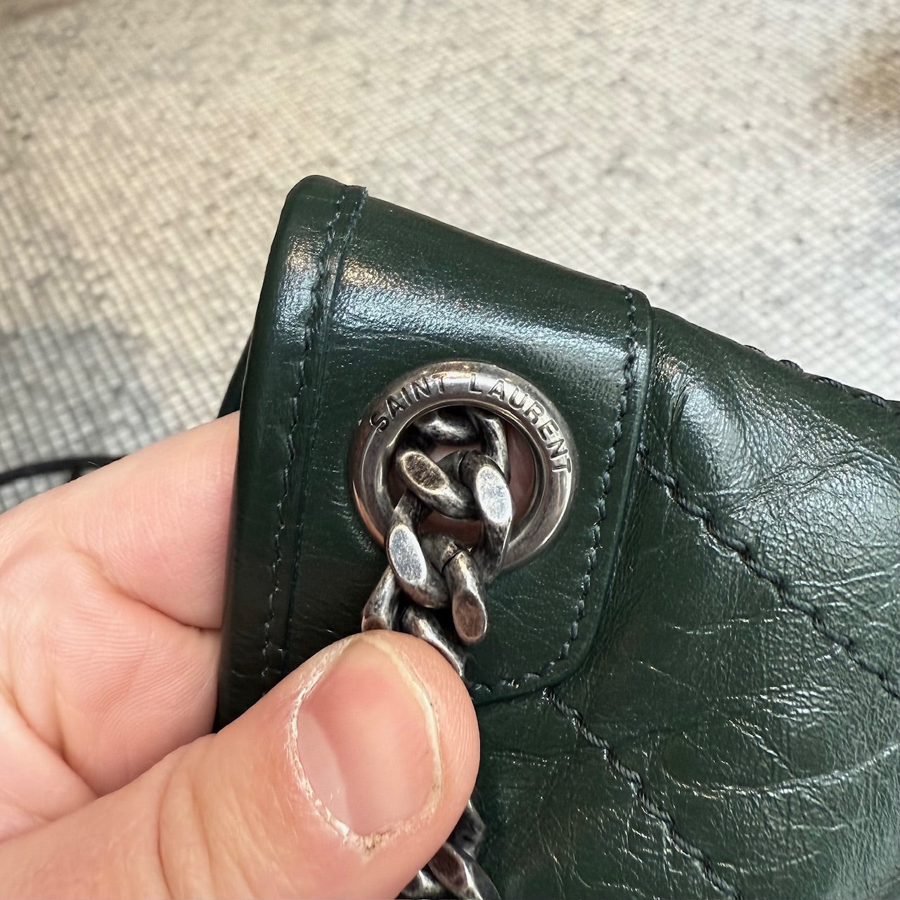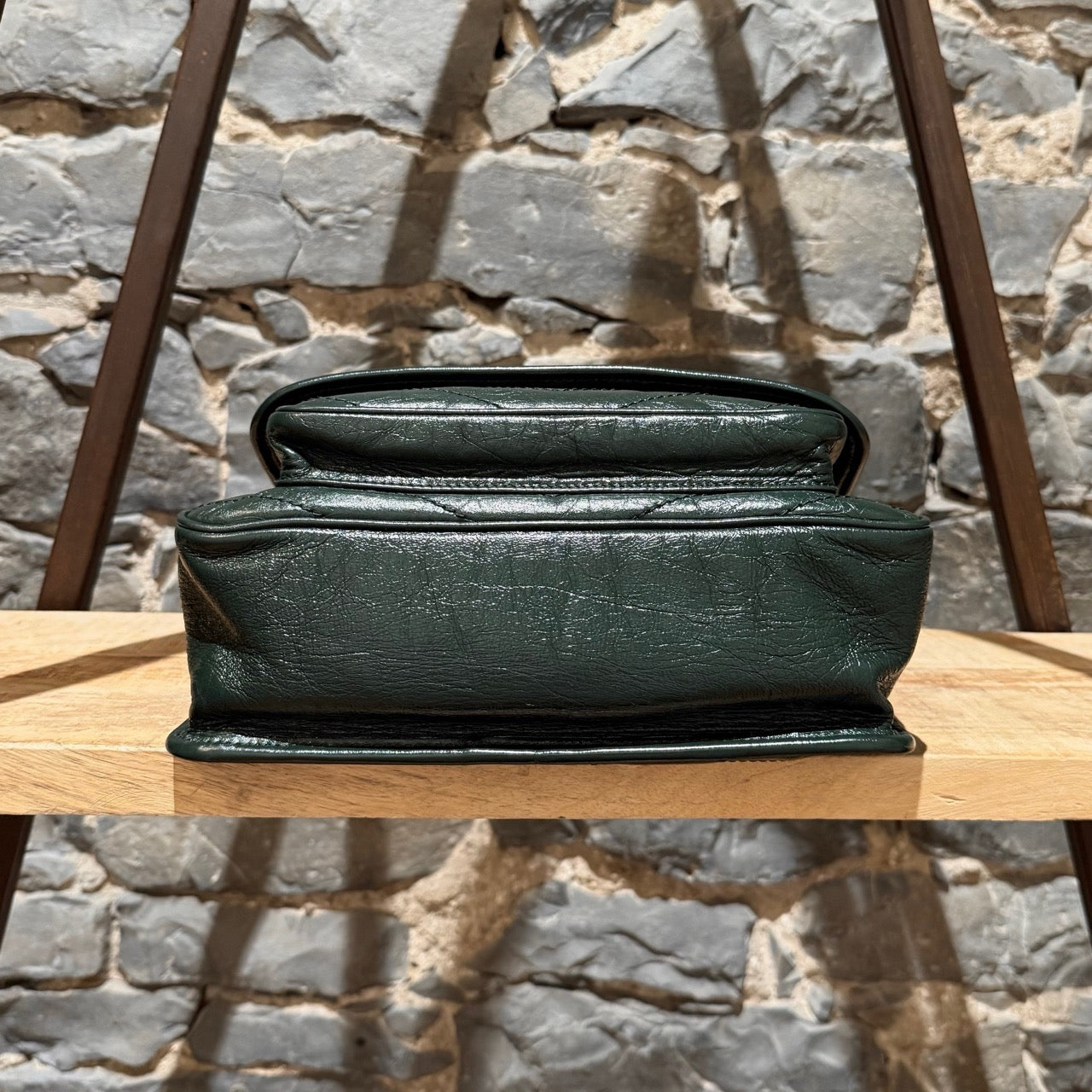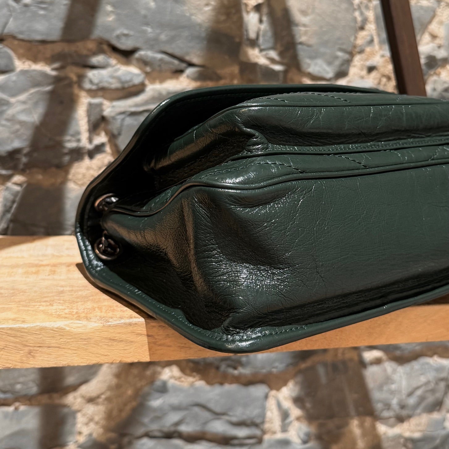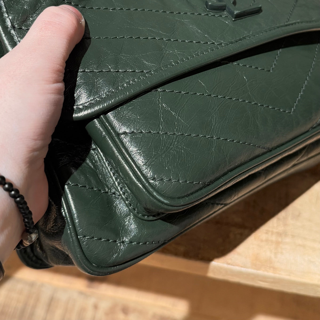 Crinkled "vintage"leather in dark forest green. Flap with magnetic snap closure engraved “Saint Laurent Paris.” Quilted chevron stitching. YSL monogram metal plaque covered in tonal dark green leather. Dark antique silver-tone curb chain strap with leather shoulder pads. Can be worn as a shoulder strap, crossbody, or doubled as dual handles. Black fabric lining. Main compartment with zip pocket and smaller compartment at front under the flap. Exterior back pocket with magnetic closure. Made in Italy. Comes with a Saint Laurent dustbag.