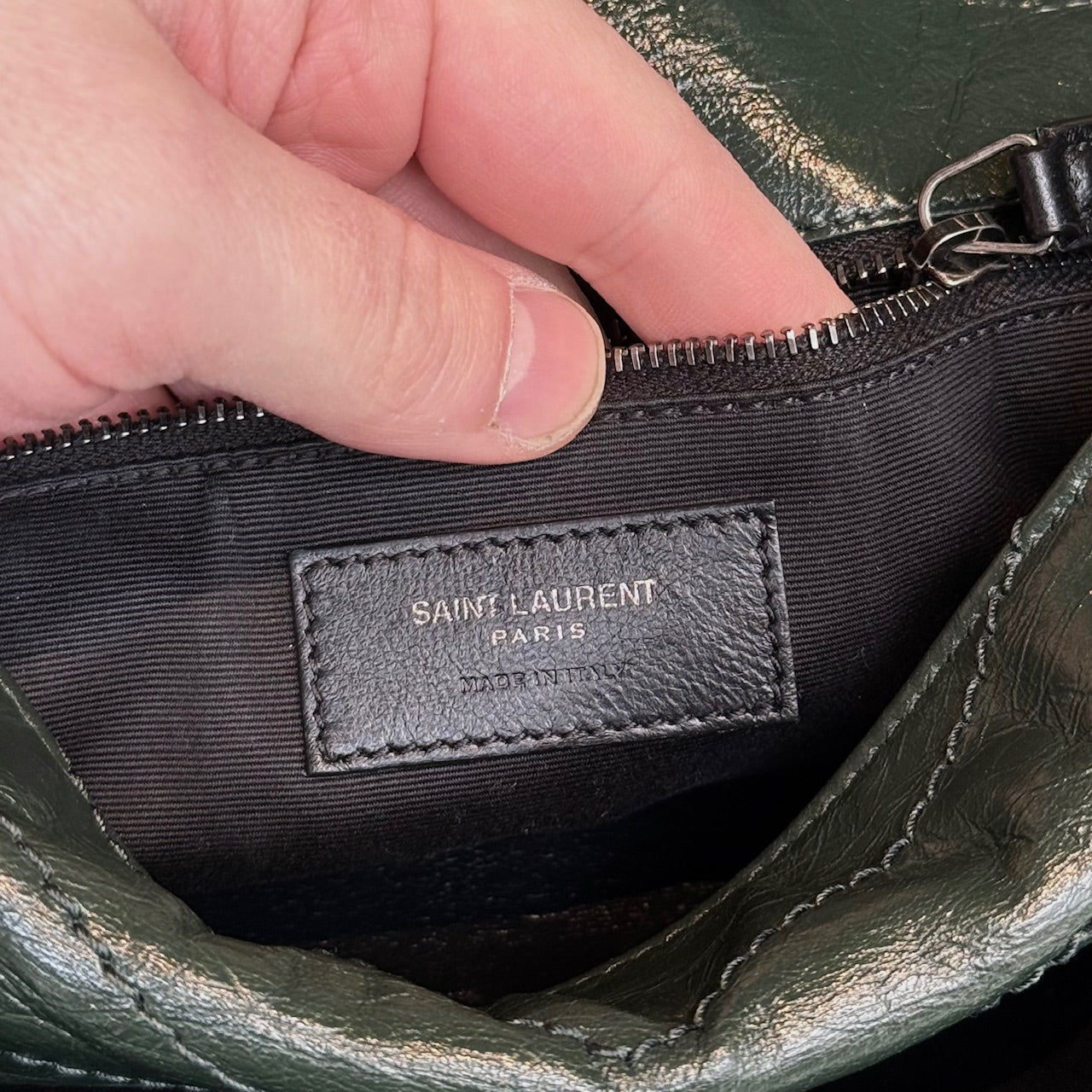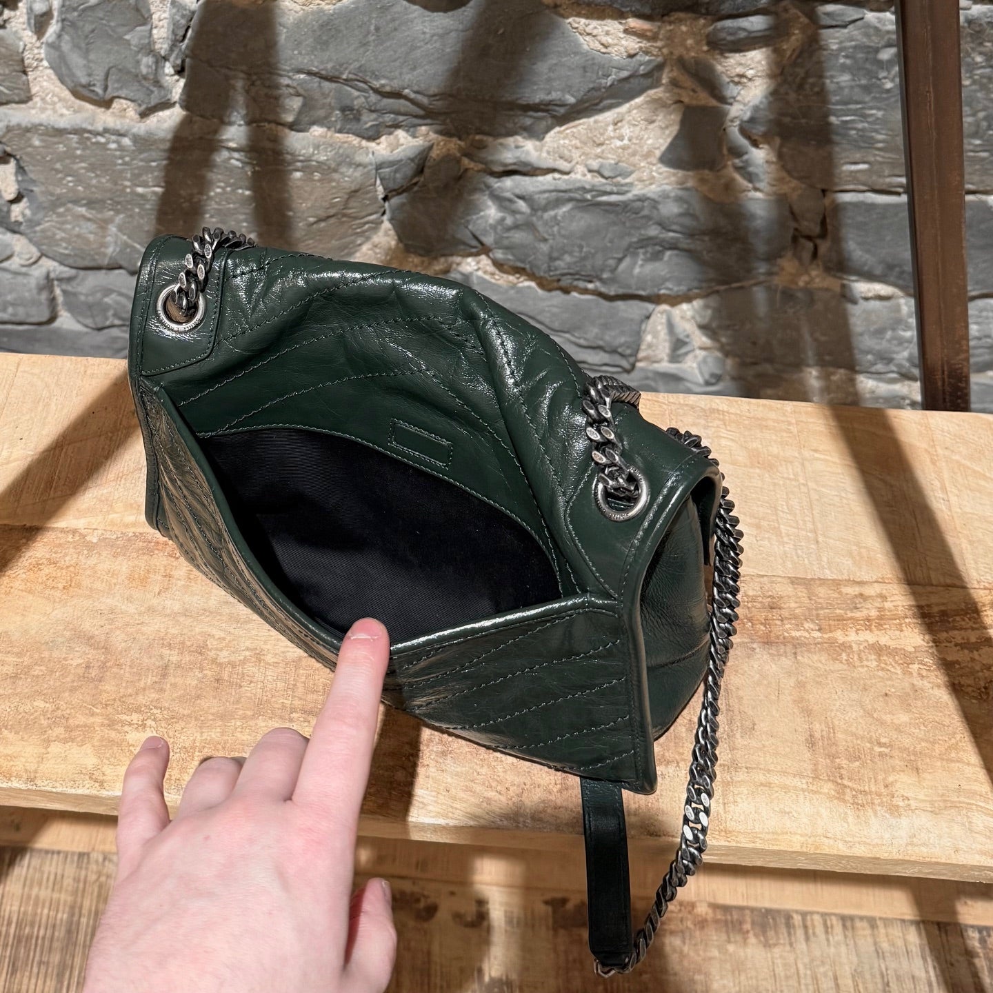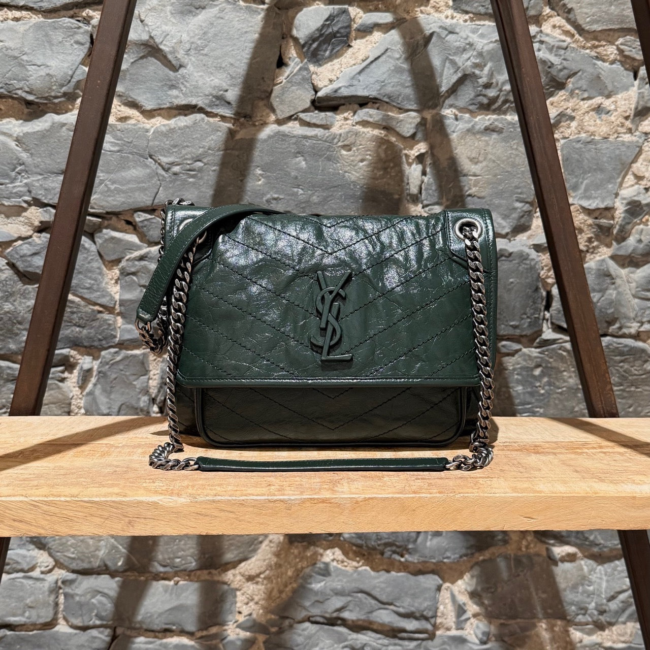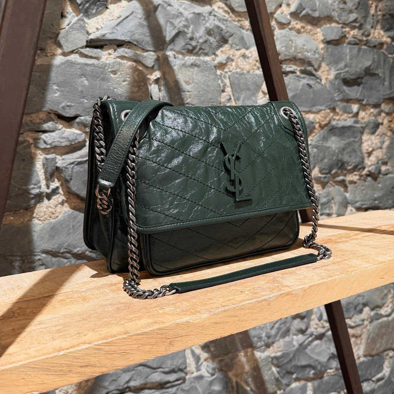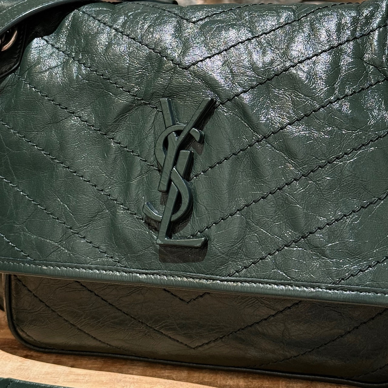 Crinkled "vintage"leather in dark forest green. Flap with magnetic snap closure engraved “Saint Laurent Paris.” Quilted chevron stitching. YSL monogram metal plaque covered in tonal dark green leather. Dark antique silver-tone curb chain strap with leather shoulder pads. Can be worn as a shoulder strap, crossbody, or doubled as dual handles. Black fabric lining. Main compartment with zip pocket and smaller compartment at front under the flap. Exterior back pocket with magnetic closure. Made in Italy. Comes with a Saint Laurent dustbag.