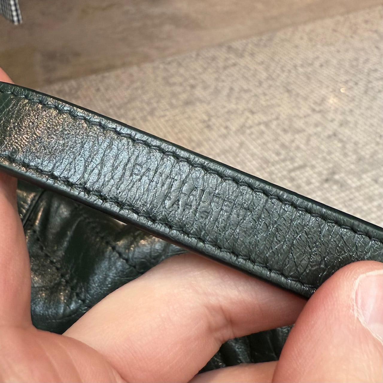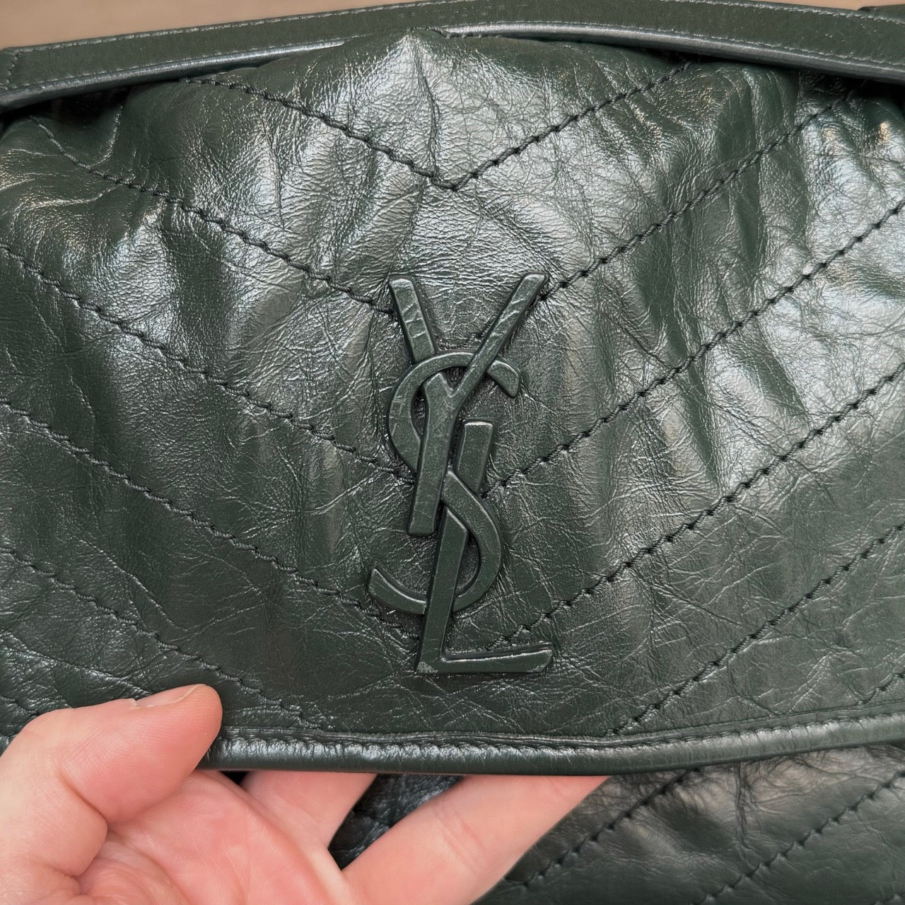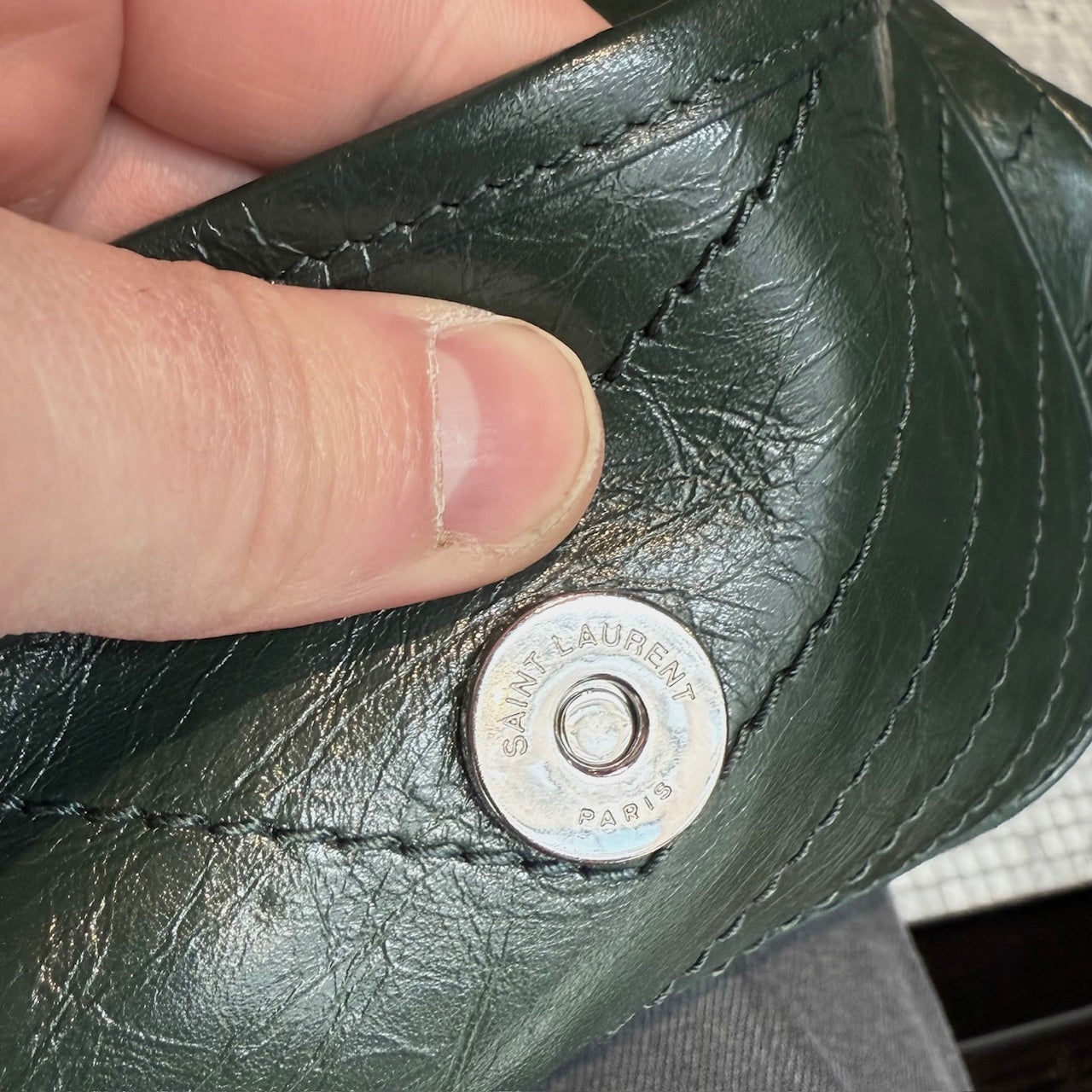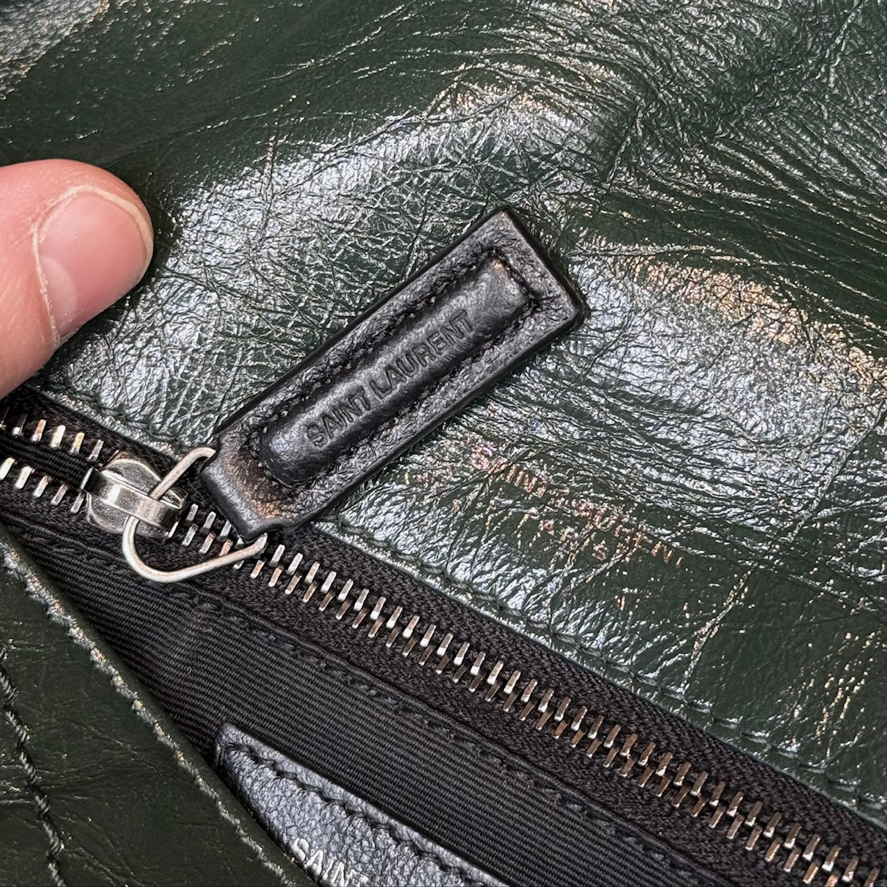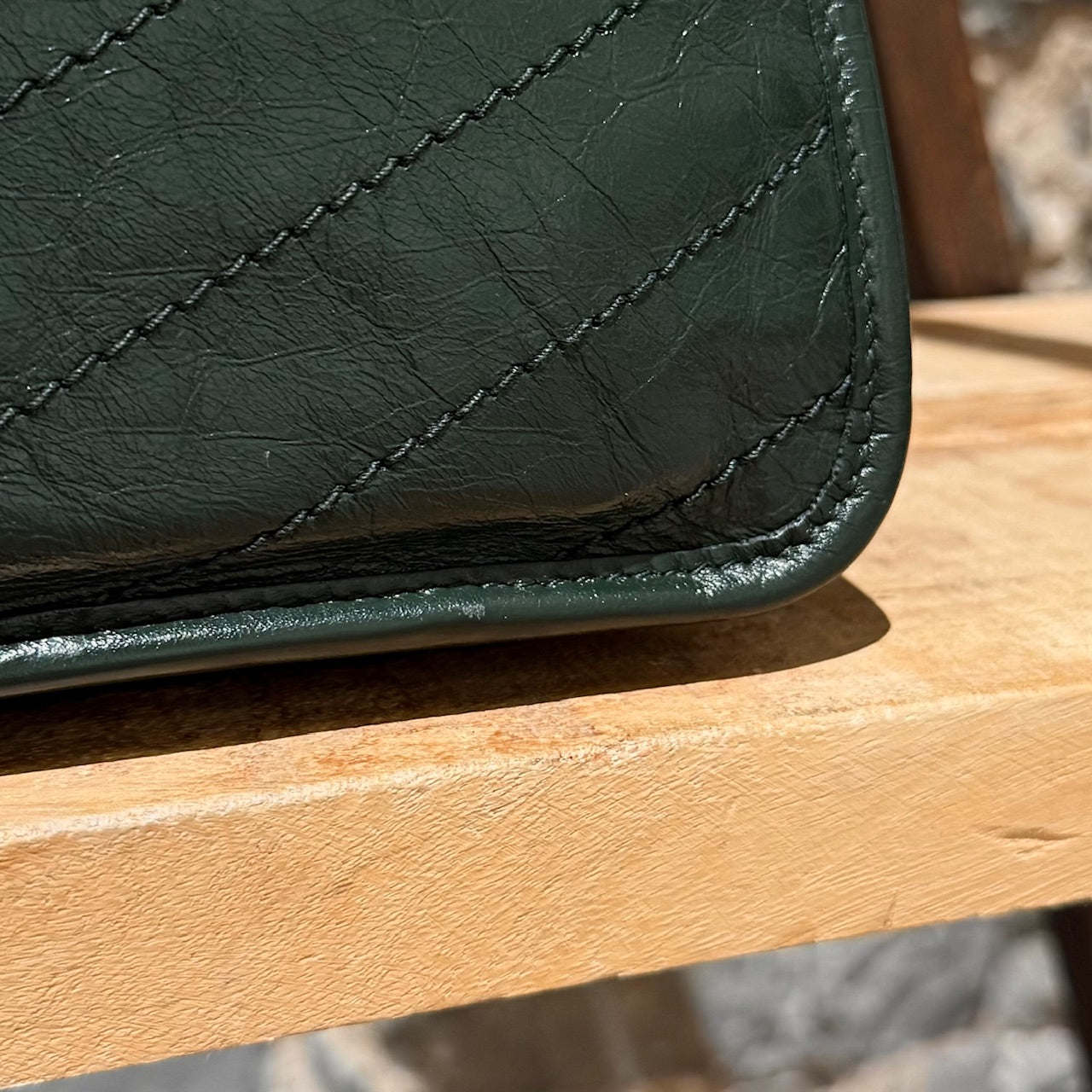 Crinkled "vintage"leather in dark forest green. Flap with magnetic snap closure engraved “Saint Laurent Paris.” Quilted chevron stitching. YSL monogram metal plaque covered in tonal dark green leather. Dark antique silver-tone curb chain strap with leather shoulder pads. Can be worn as a shoulder strap, crossbody, or doubled as dual handles. Black fabric lining. Main compartment with zip pocket and smaller compartment at front under the flap. Exterior back pocket with magnetic closure. Made in Italy. Comes with a Saint Laurent dustbag.
