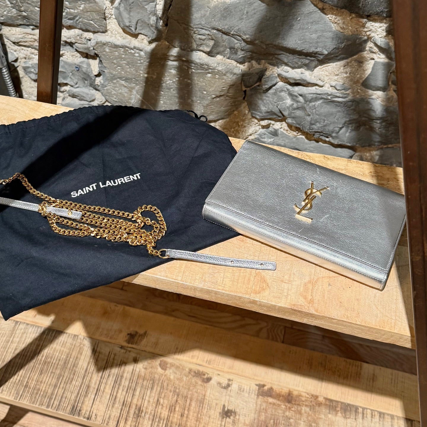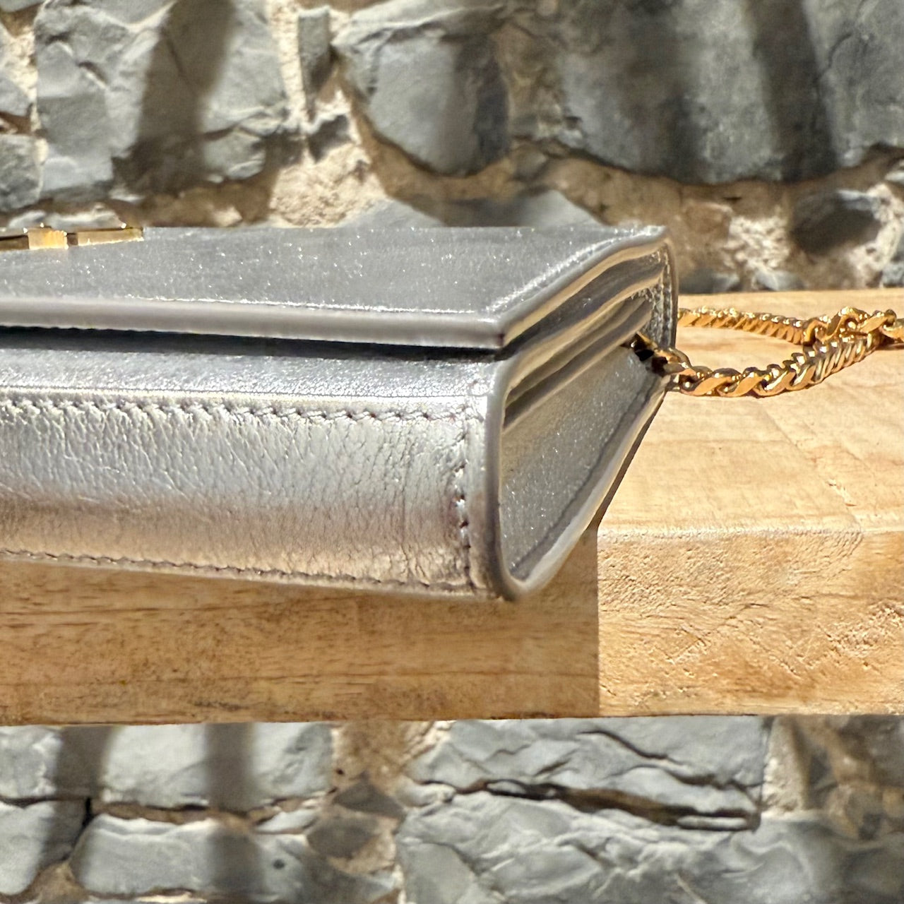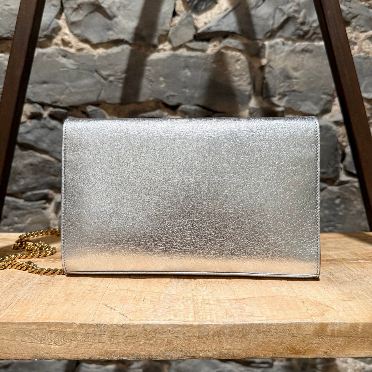 Structured rectangular clutch silhouette with silver metallic leather exterior and YSL monogram hardware at front. Branded gold-tone hardware. Removable chain shoulder strap. Flap closure with snap button. Multiple interior card slots compartments and central zipped pocket. Made in Italy. Comes with Saint Laurent dustbag.