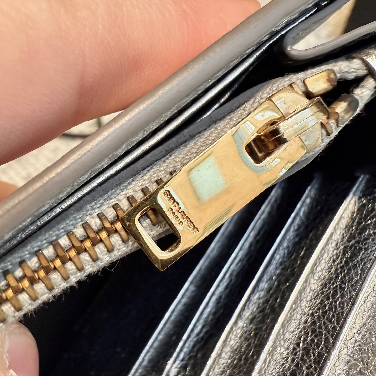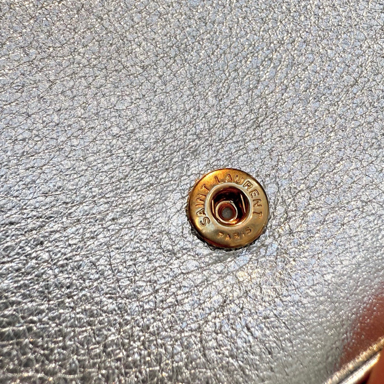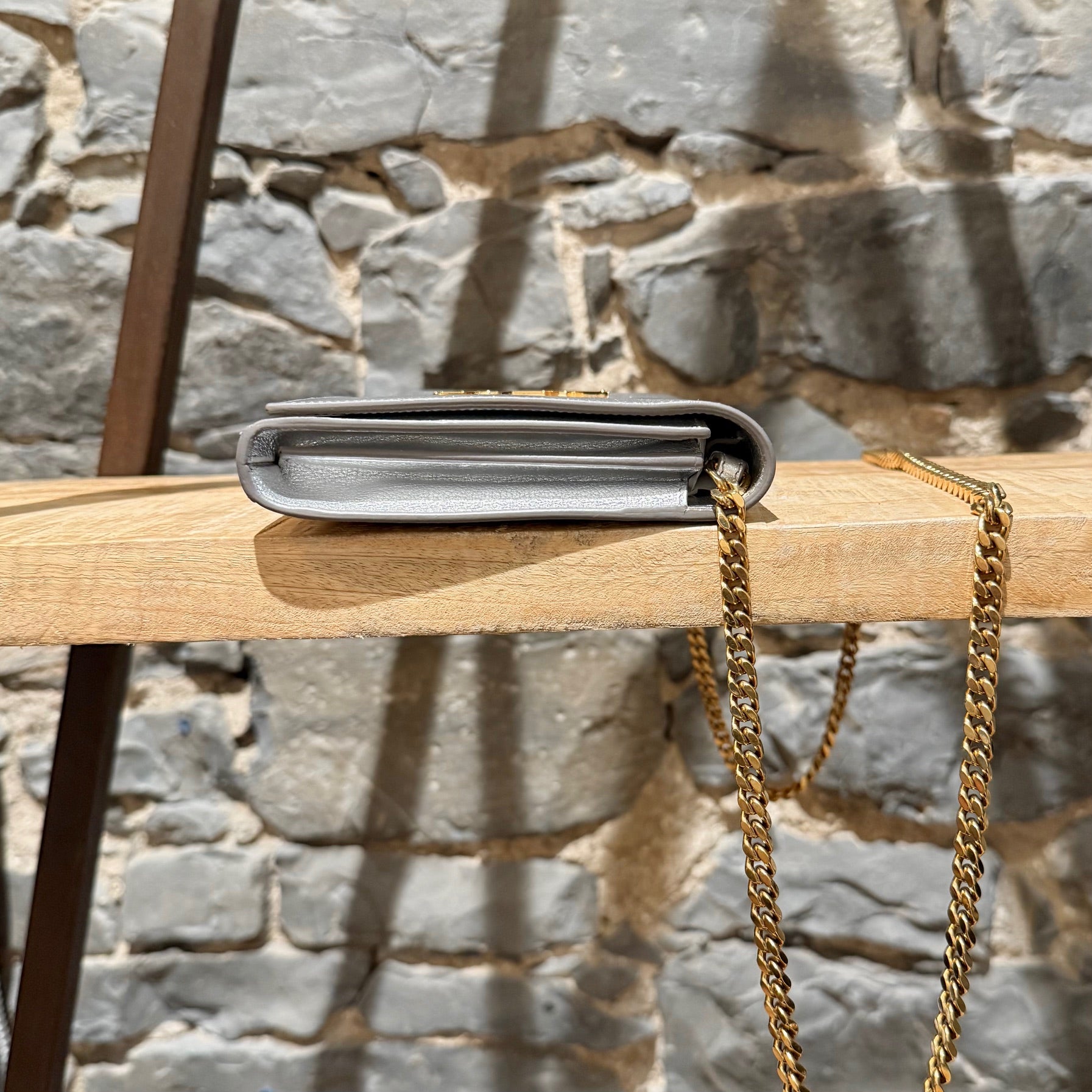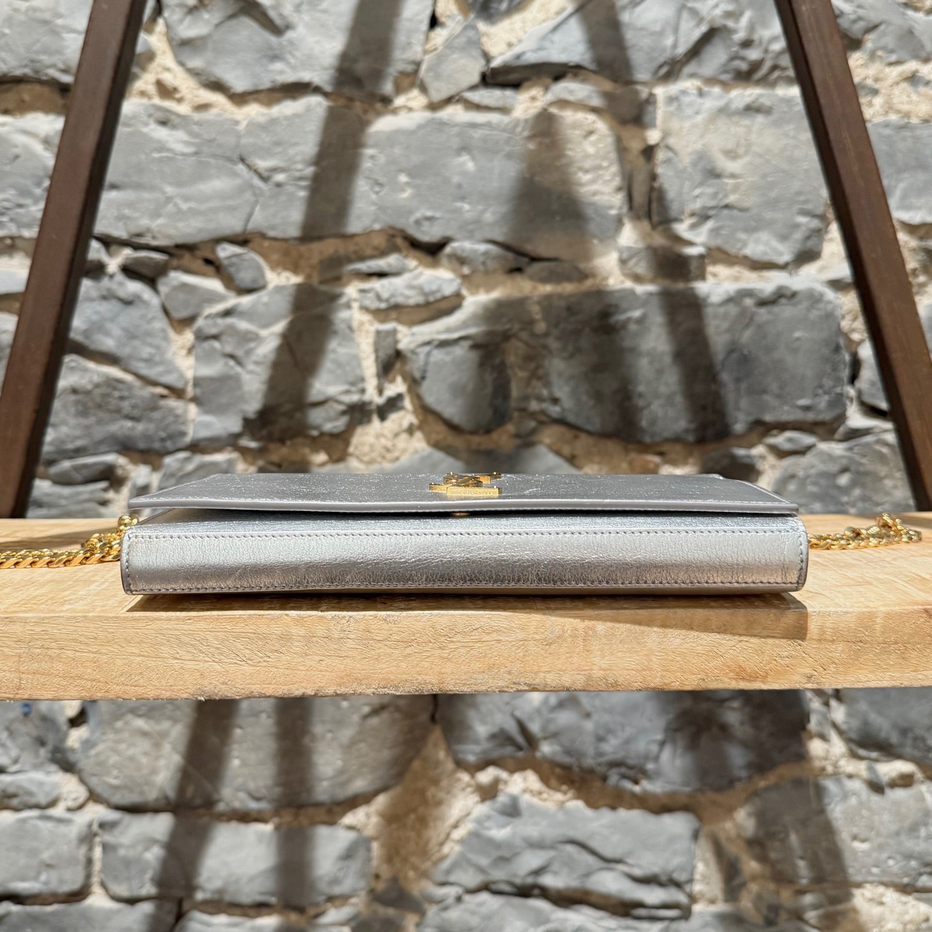 Structured rectangular clutch silhouette with silver metallic leather exterior and YSL monogram hardware at front. Branded gold-tone hardware. Removable chain shoulder strap. Flap closure with snap button. Multiple interior card slots compartments and central zipped pocket. Made in Italy. Comes with Saint Laurent dustbag.