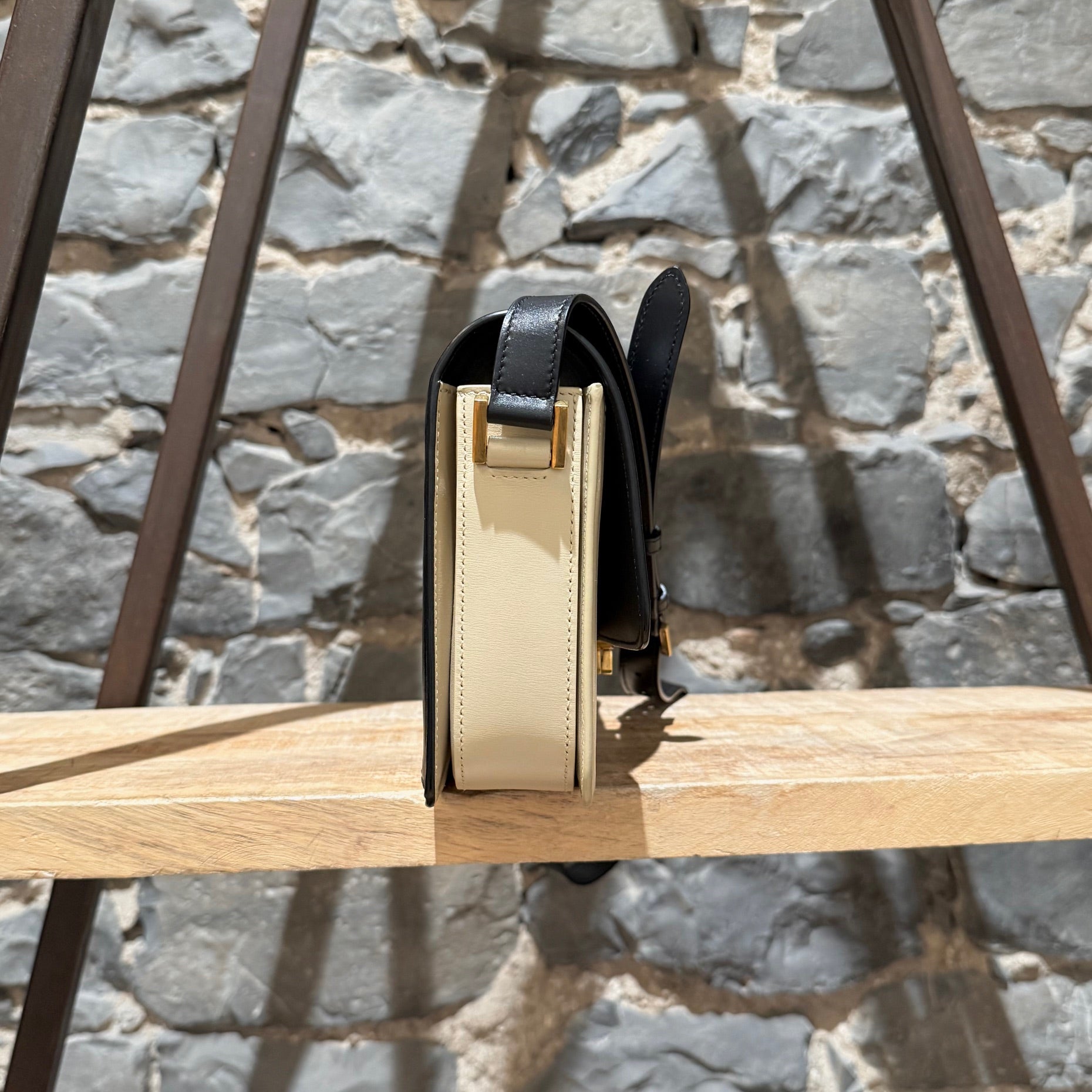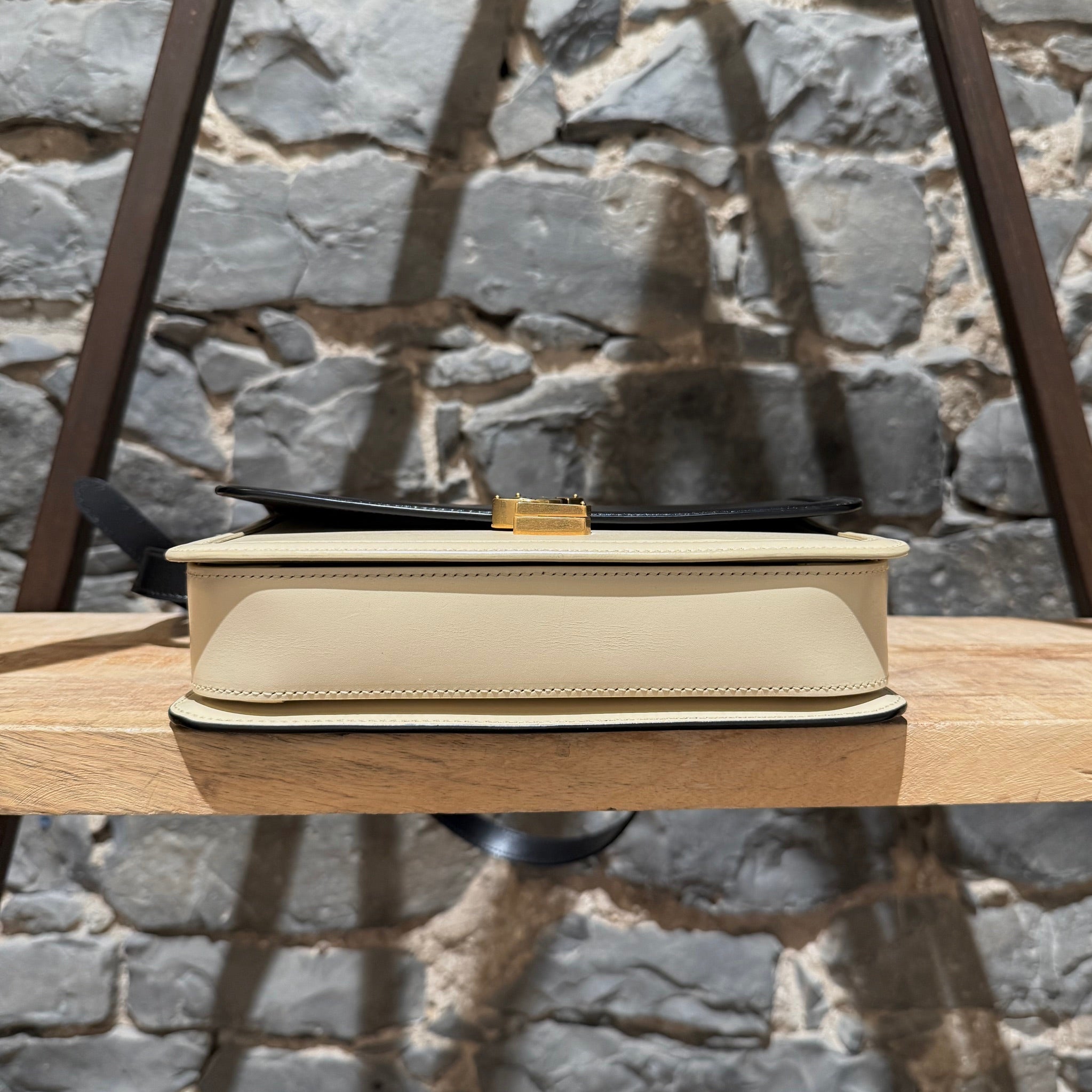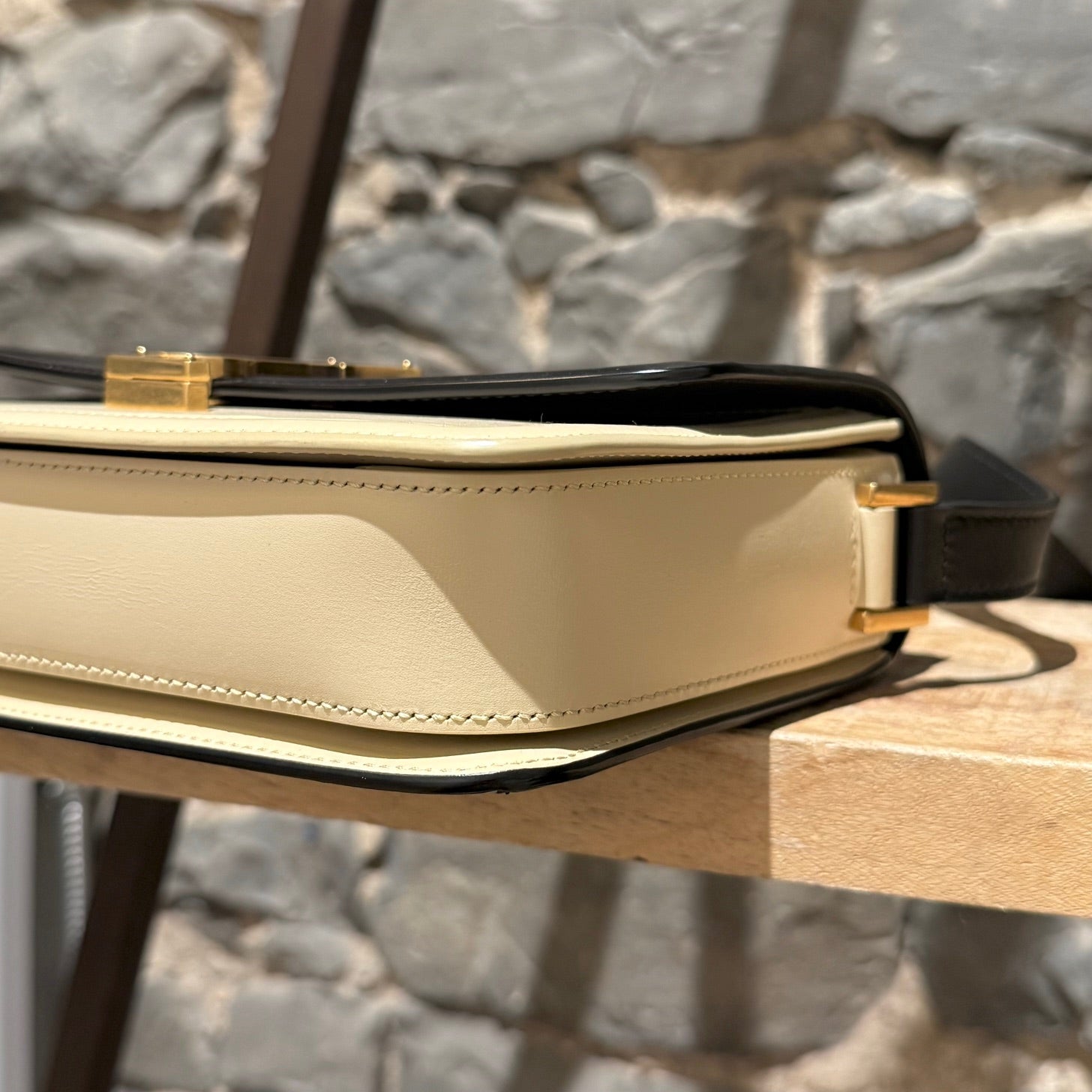 Rectangular medium Solferino in rigid box leather. Two-tone design with black flap and cream body. YSL Cassandre pivot closure in gold-tone metal. Adjustable leather shoulder strap. Black leather lining. One (1) main compartment, one (1) flat pocket, and another smaller compartment at front. Made in Italy. Comes with Saint Laurent dustbag and booklet.