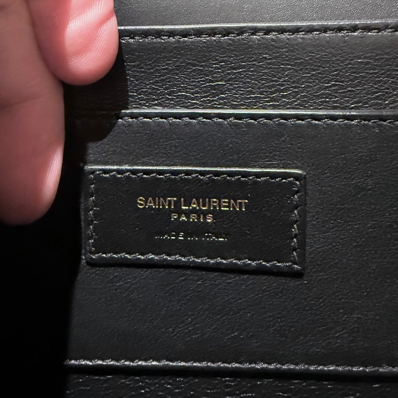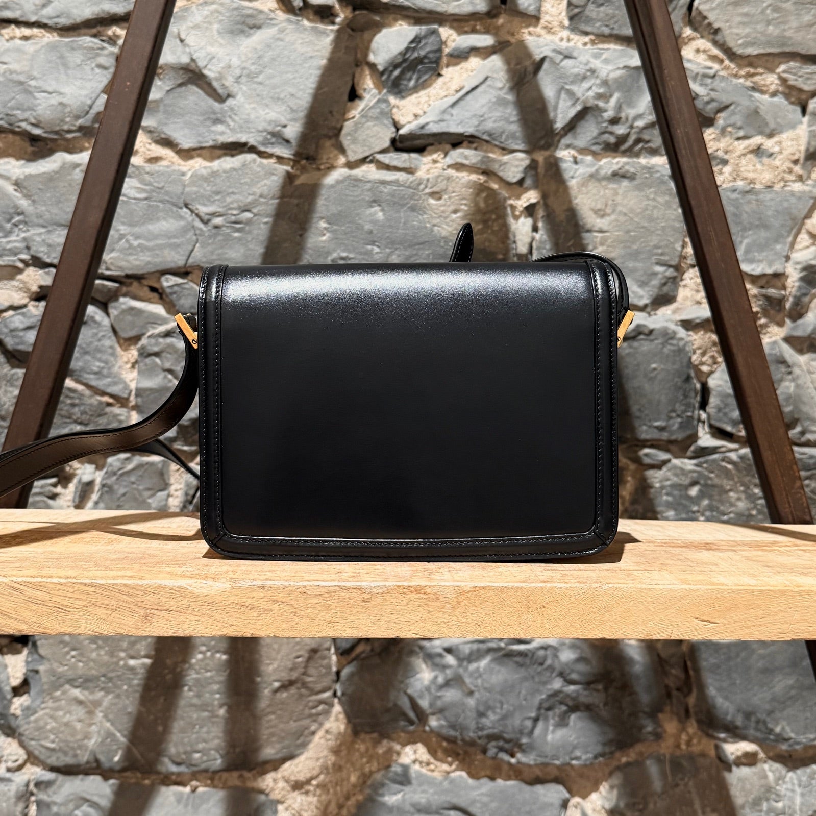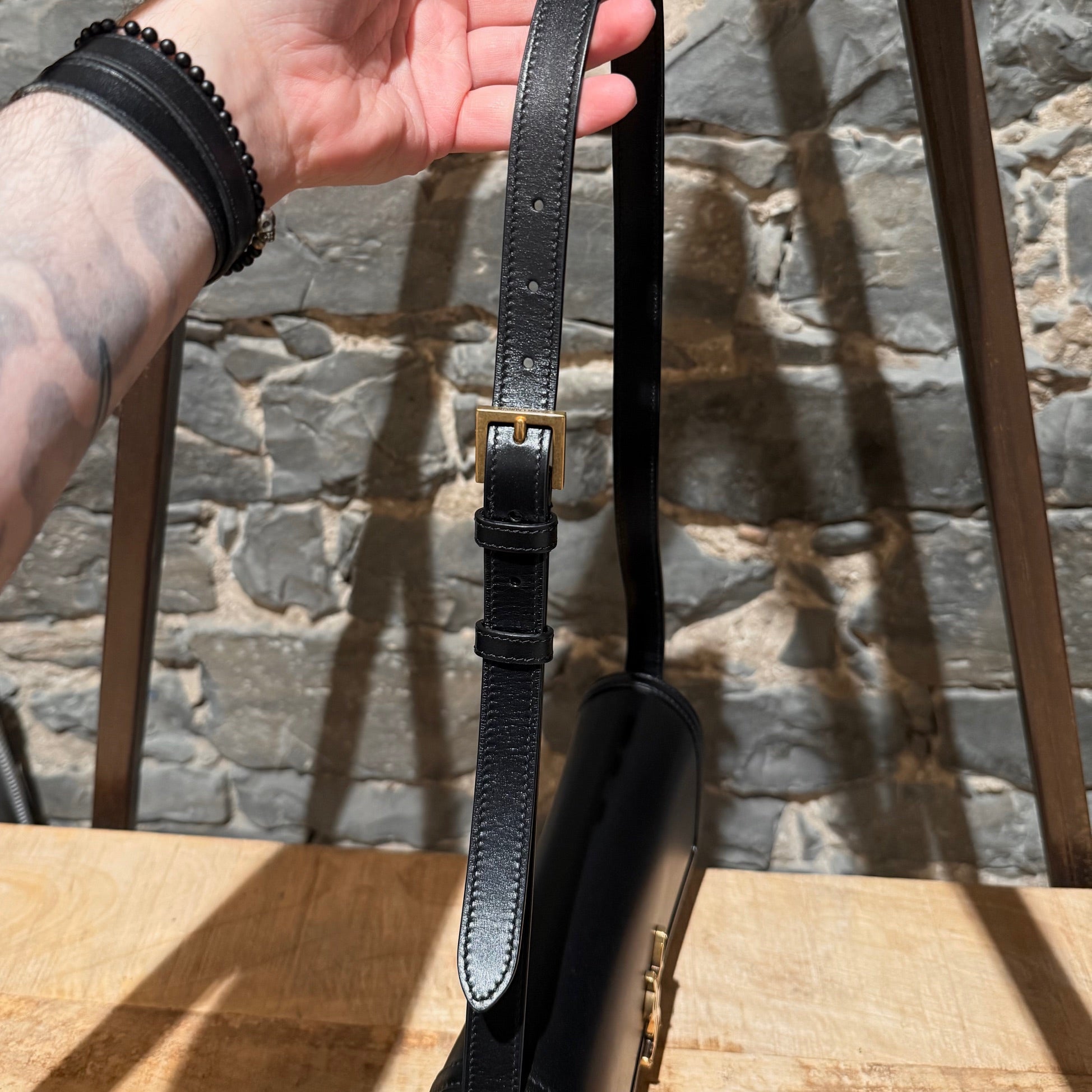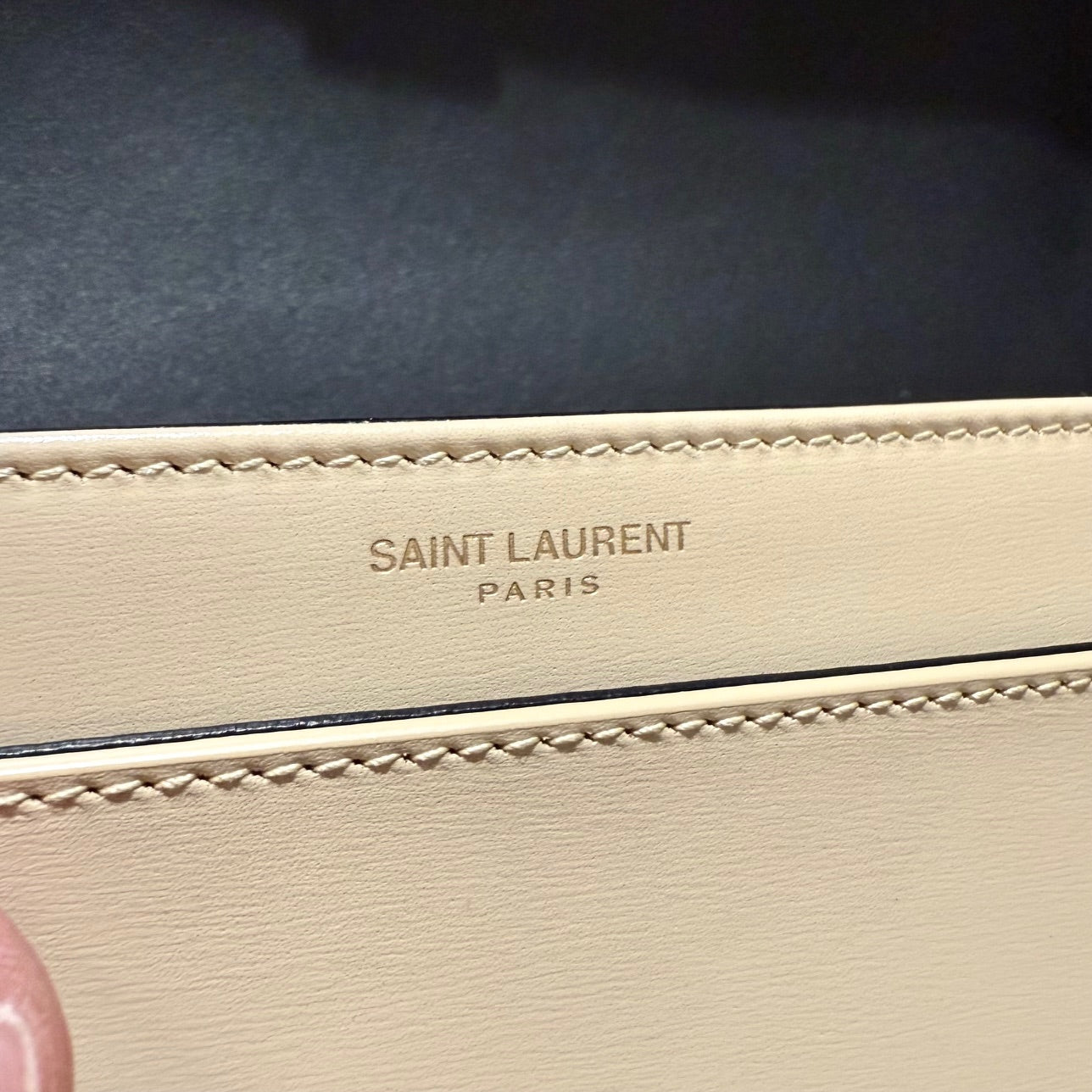 Rectangular medium Solferino in rigid box leather. Two-tone design with black flap and cream body. YSL Cassandre pivot closure in gold-tone metal. Adjustable leather shoulder strap. Black leather lining. One (1) main compartment, one (1) flat pocket, and another smaller compartment at front. Made in Italy. Comes with Saint Laurent dustbag and booklet.
