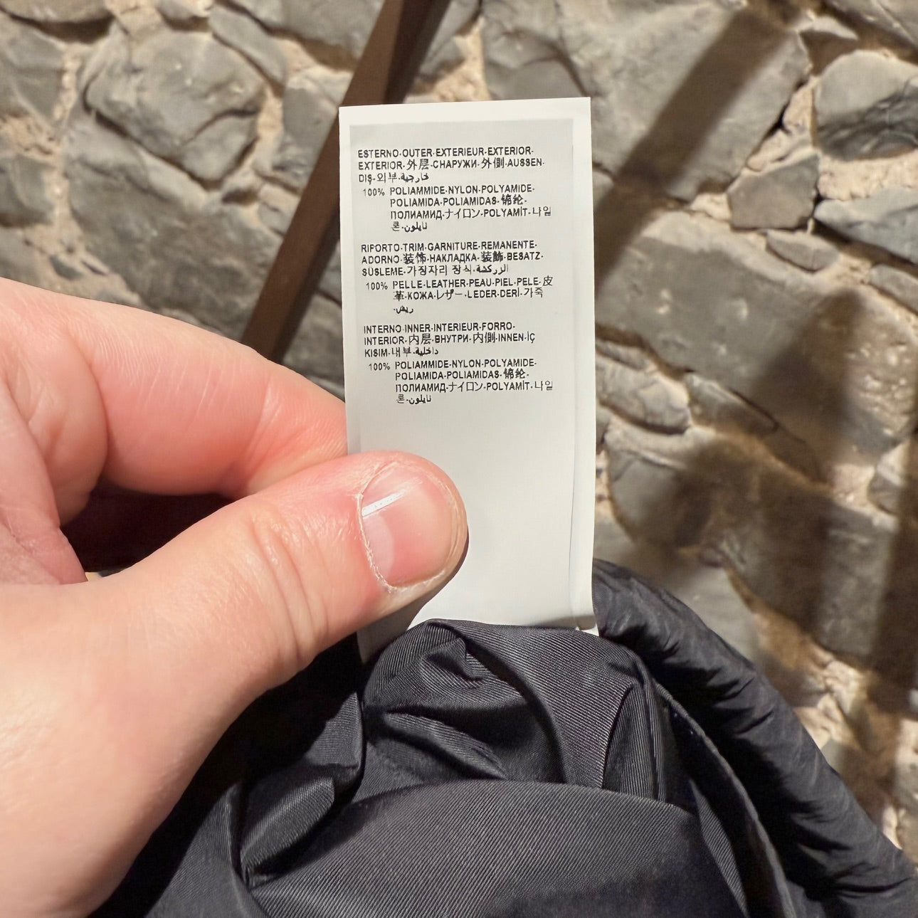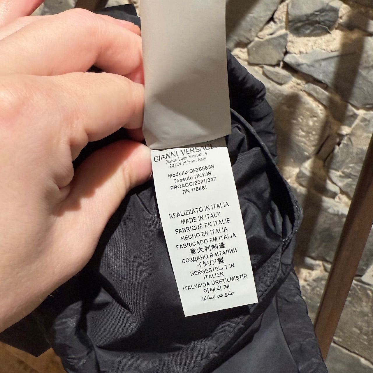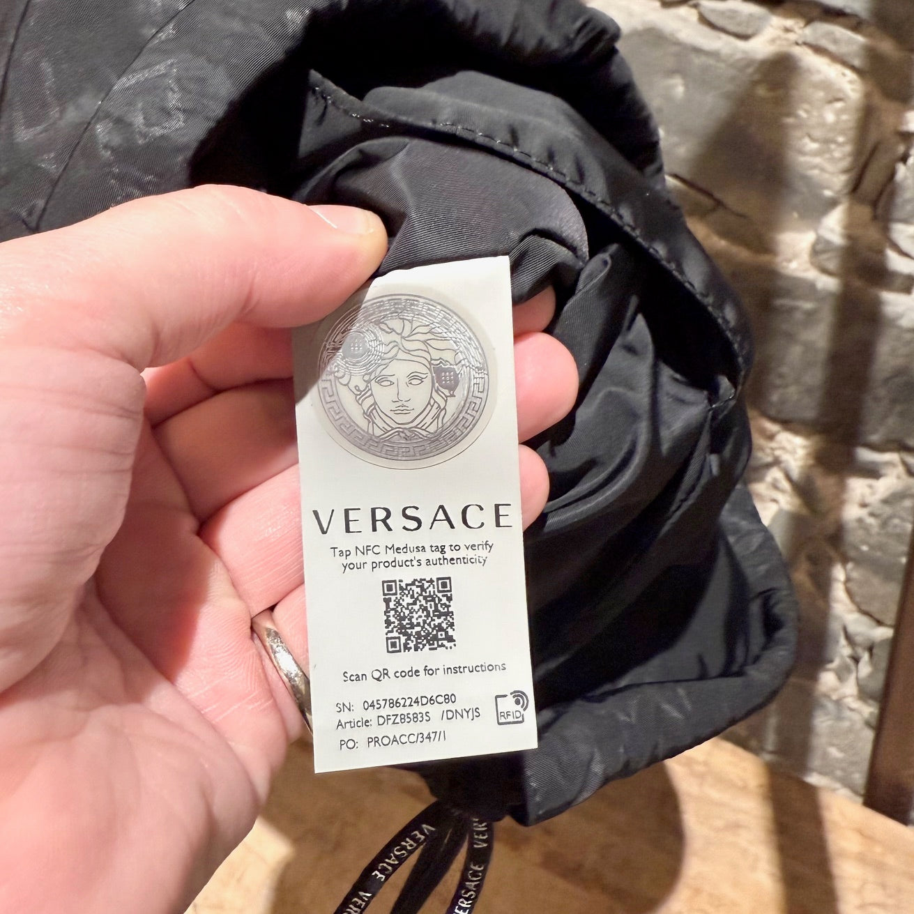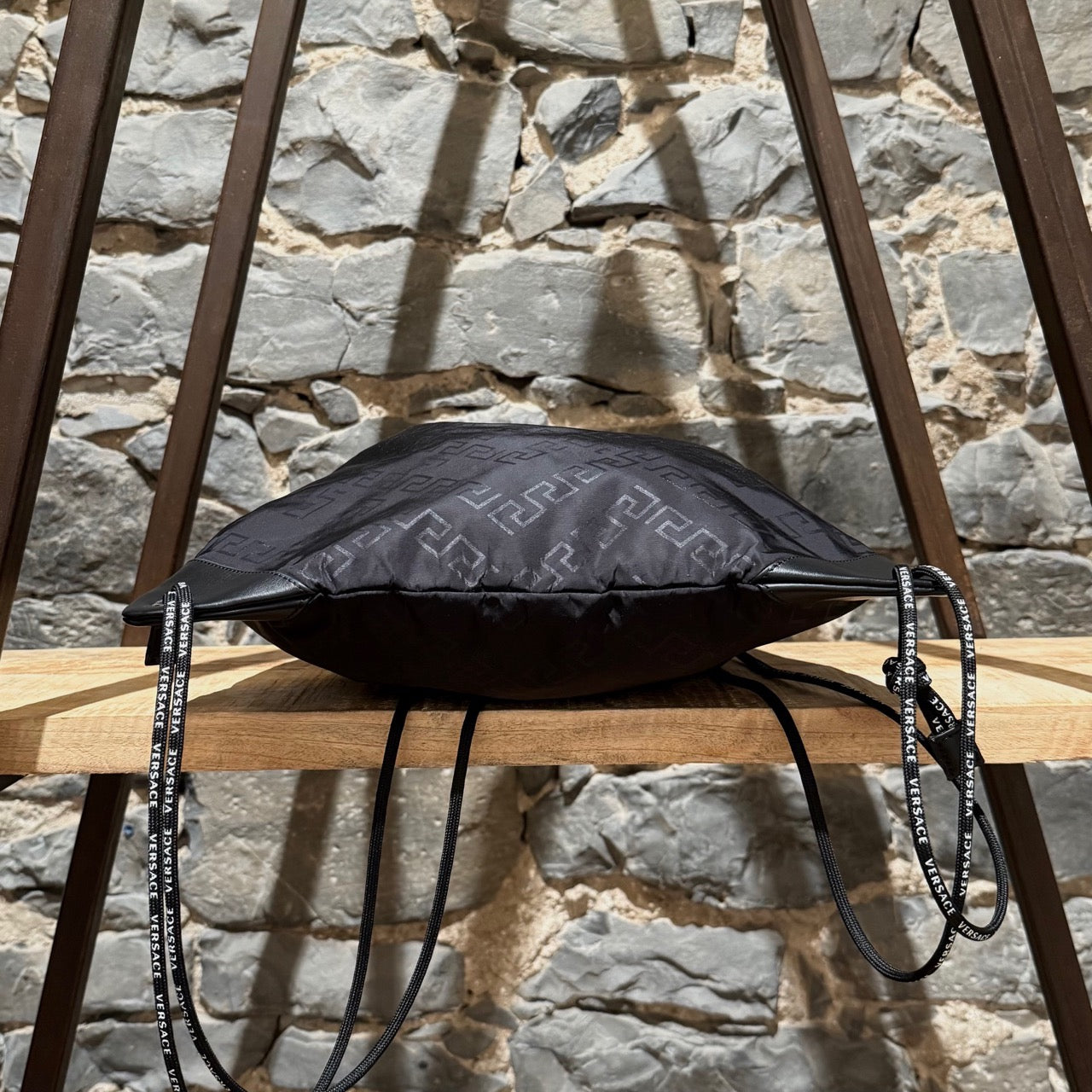 Lightweight black nylon with tonal Greca pattern throughout. Versace logo print at front. Drawstring closure. Two (2) interior slip pockets. Reinforced leather corners with metal grommets. Adjustable drawstring cords with Versace logo text. Made in Italy. Comes as is.