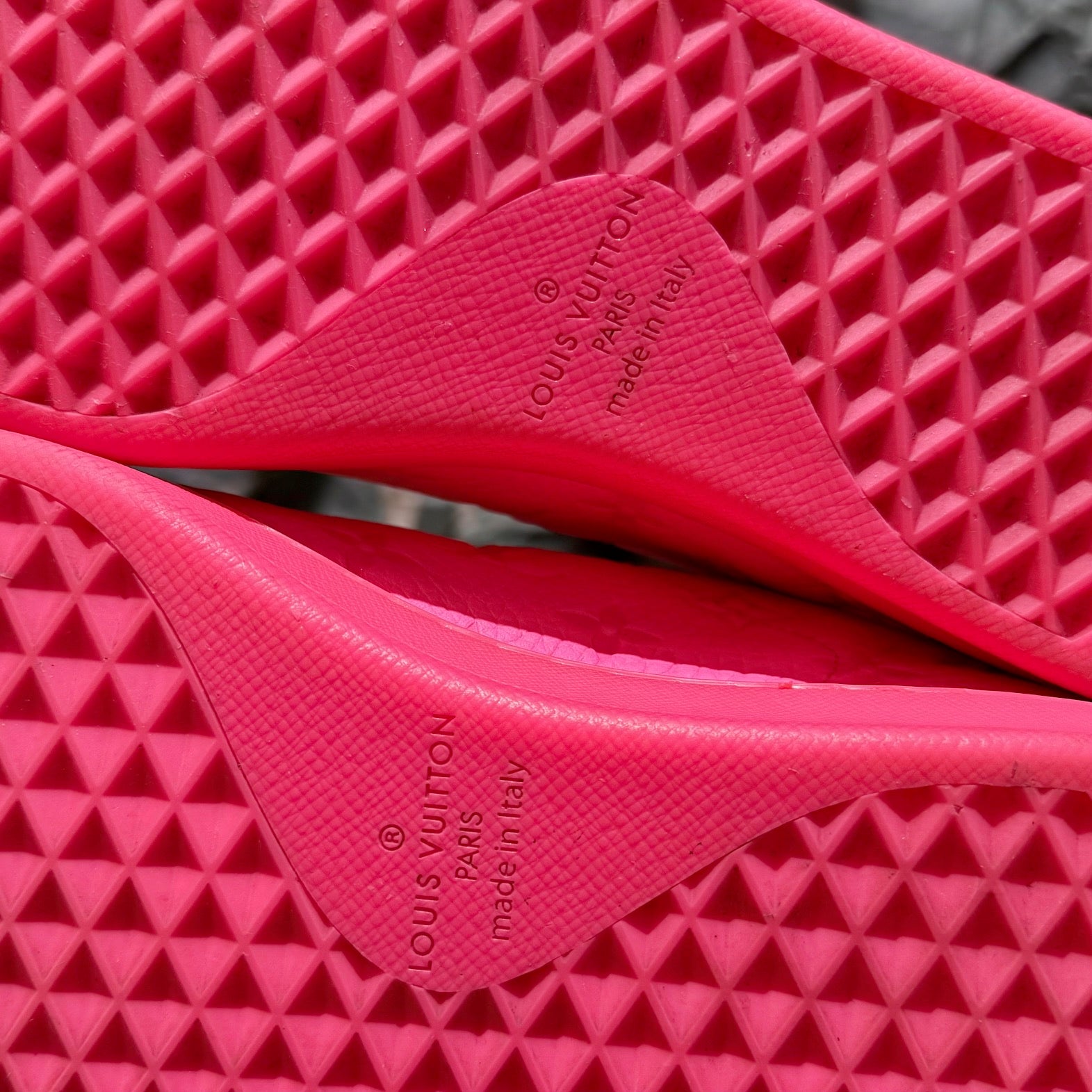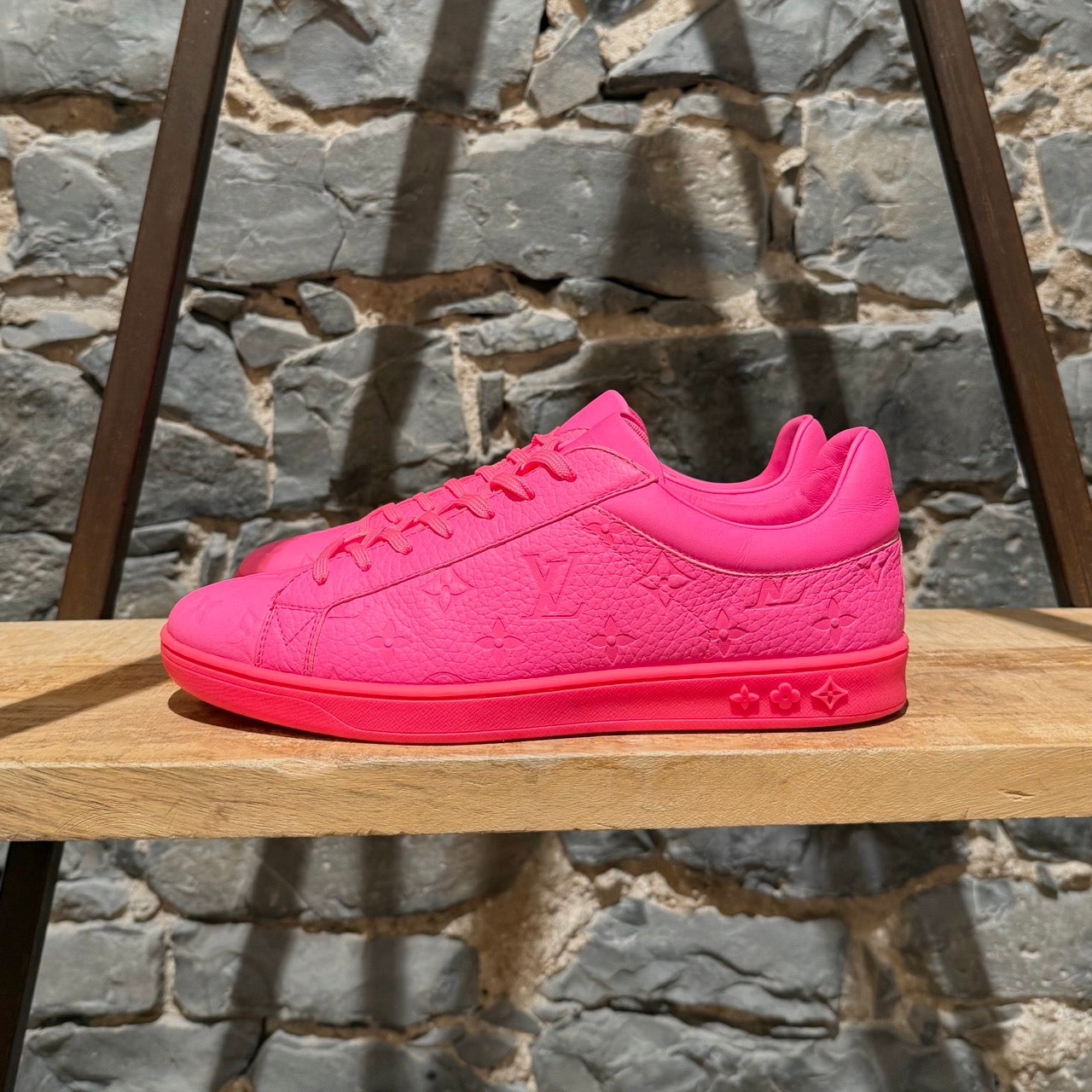 Supple pink leather upper with embossed Monogram pattern. Round toe and padded collar. Louis Vuitton Paris stamp at tongue and back heel. Matching tonal laces. Removable branded fabric insole. Rubber outsole with textured tread and Monogram flower details. Textile lining. Made in Italy. Come with a Louis Vuitton dustbag.