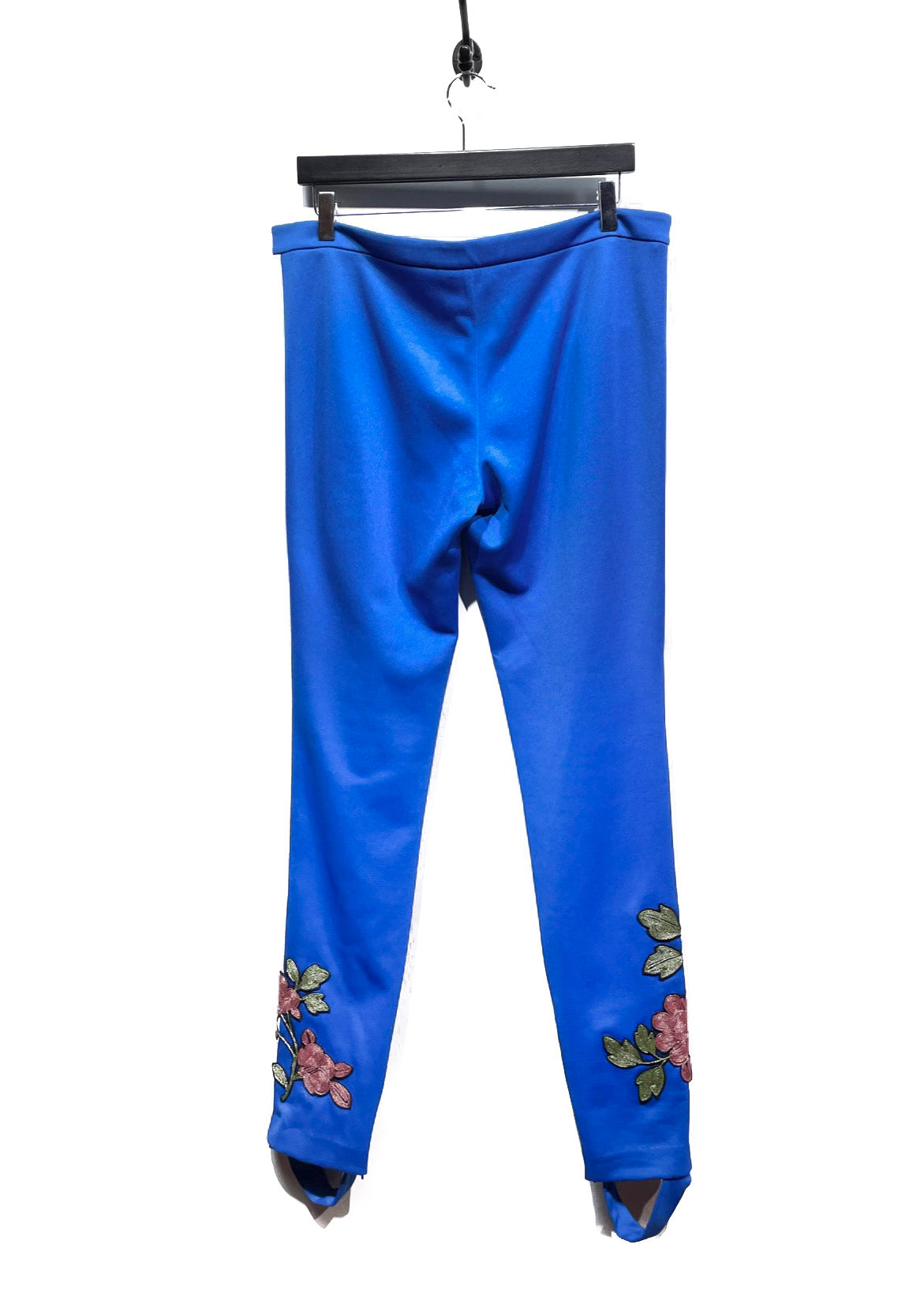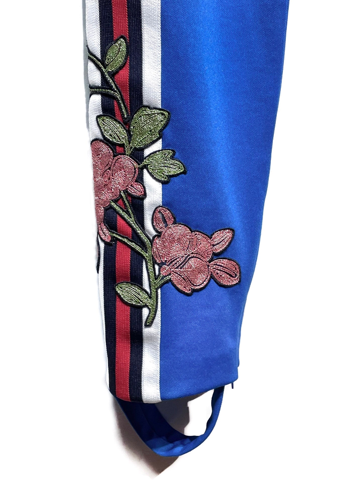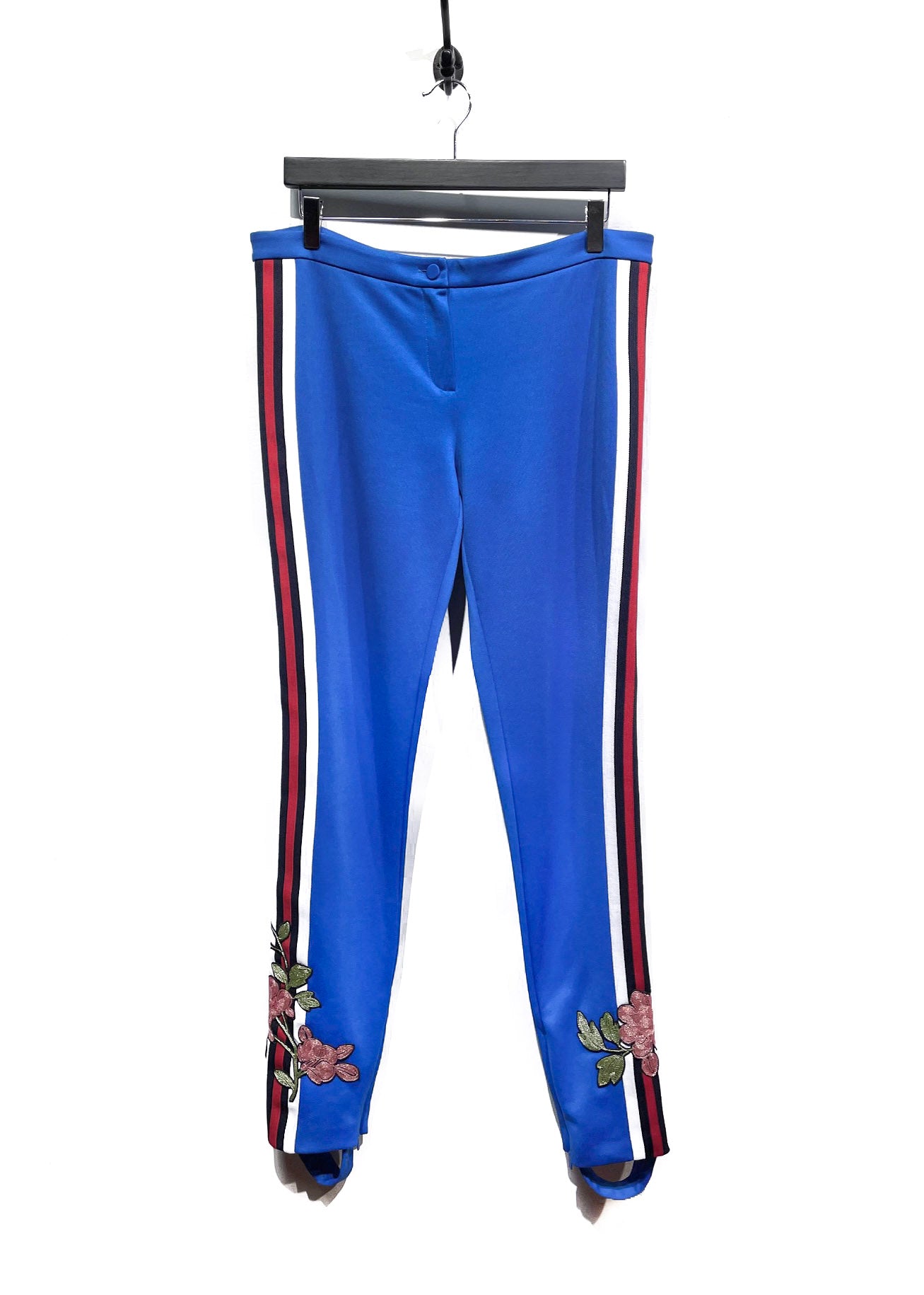 Mid-rise waist. Polyester blend. White, navy and red wed trim at sides. Floral embroideries in pink and green. Stirrup straps at hem. Hidden zip at leg opening. Front zip closure with button. Logo engraved on hardware. Made in Italy.