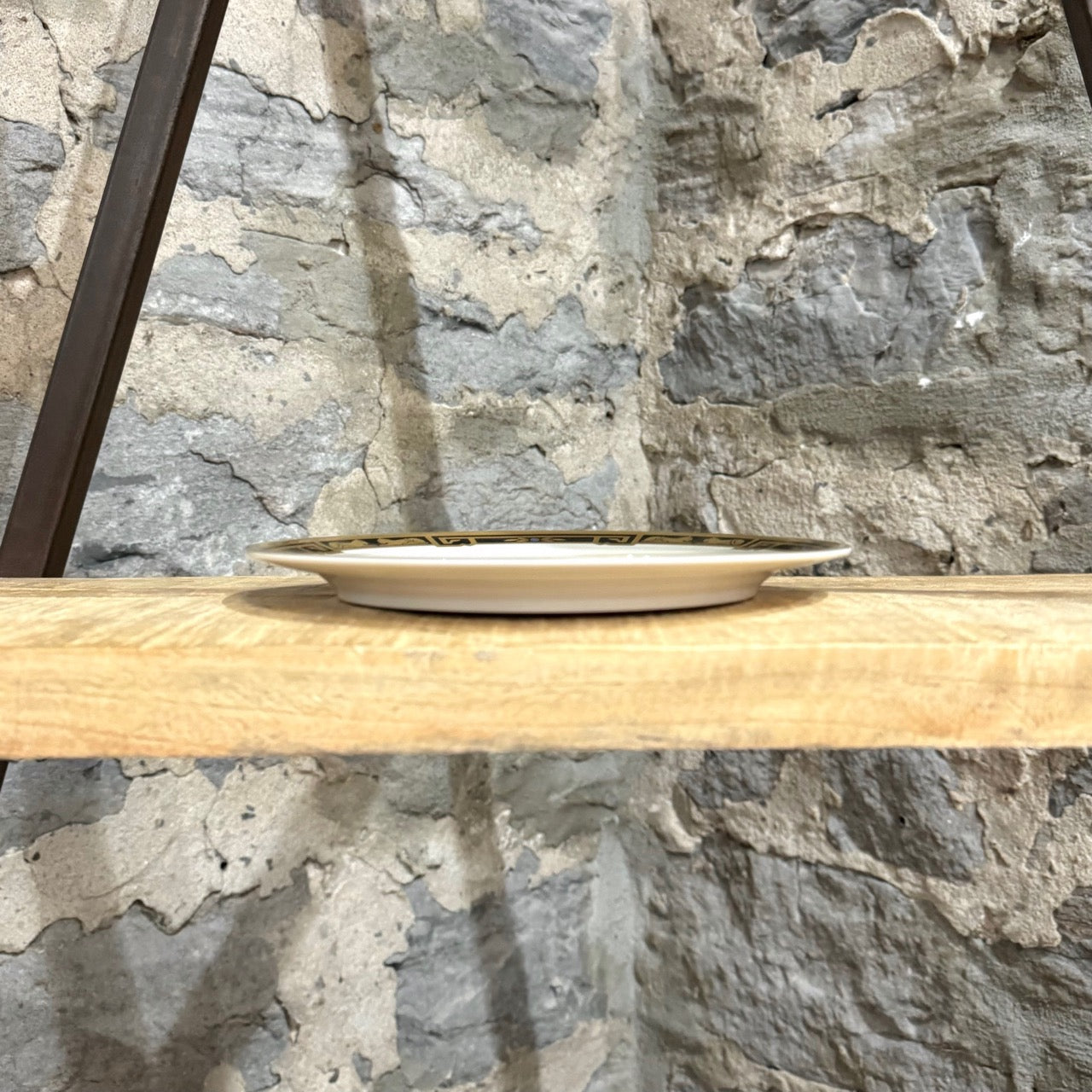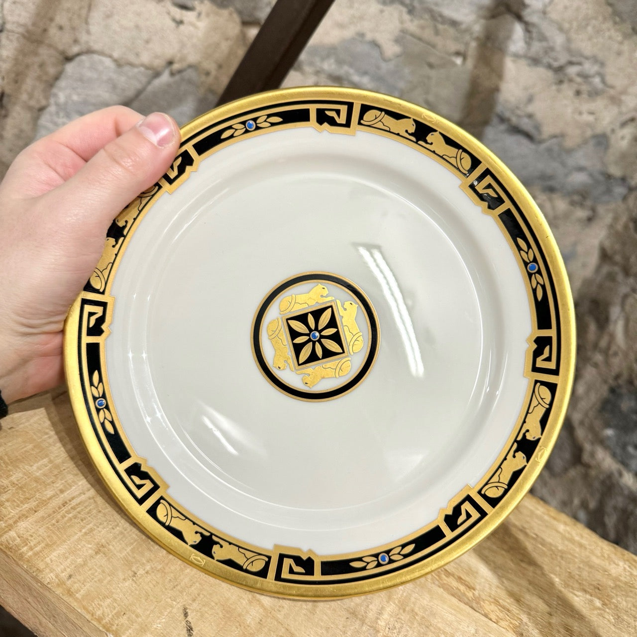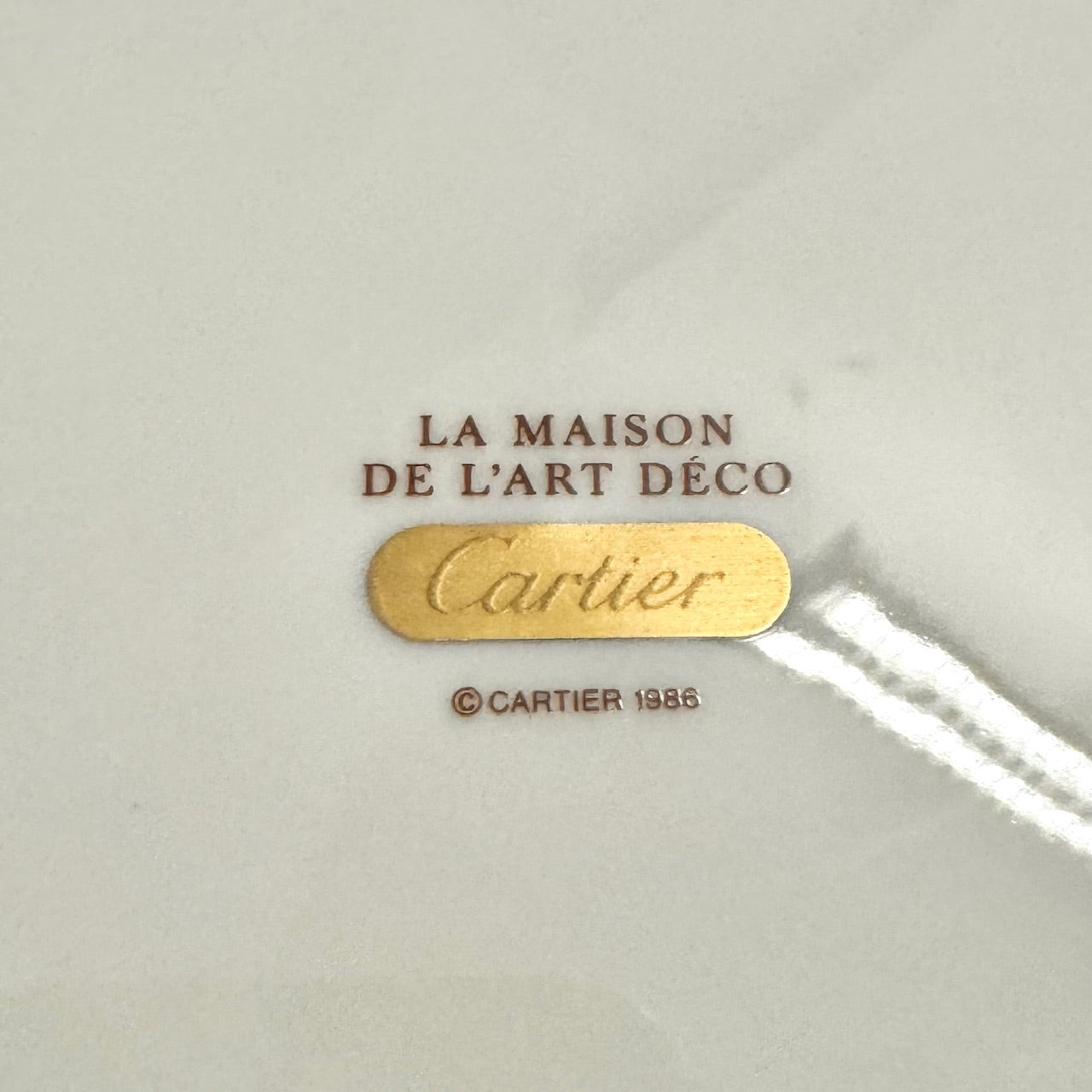 White/ivory porcelain service plate. Gold and black pattern. Cartier signature print at back. Come as is.