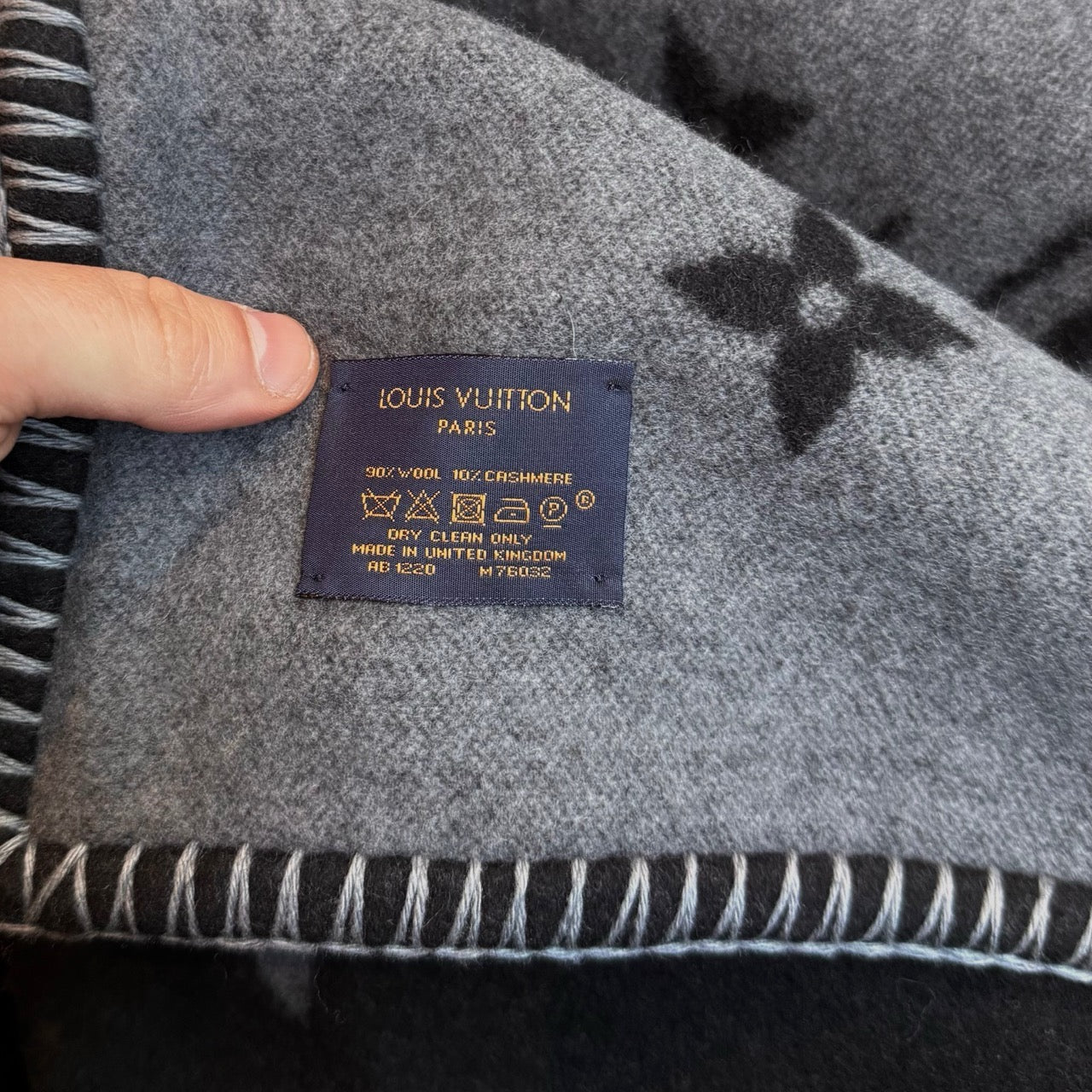 Rectangular blanket in a soft wool and cashmere blend, showcasing Louis Vuitton’s Neo Monogram Eclipse pattern in black and grey on plain background. Inverted colours on each side. Stitched edges. Made in the UK. Comes with Louis Vuitton box, original tag and receipt.