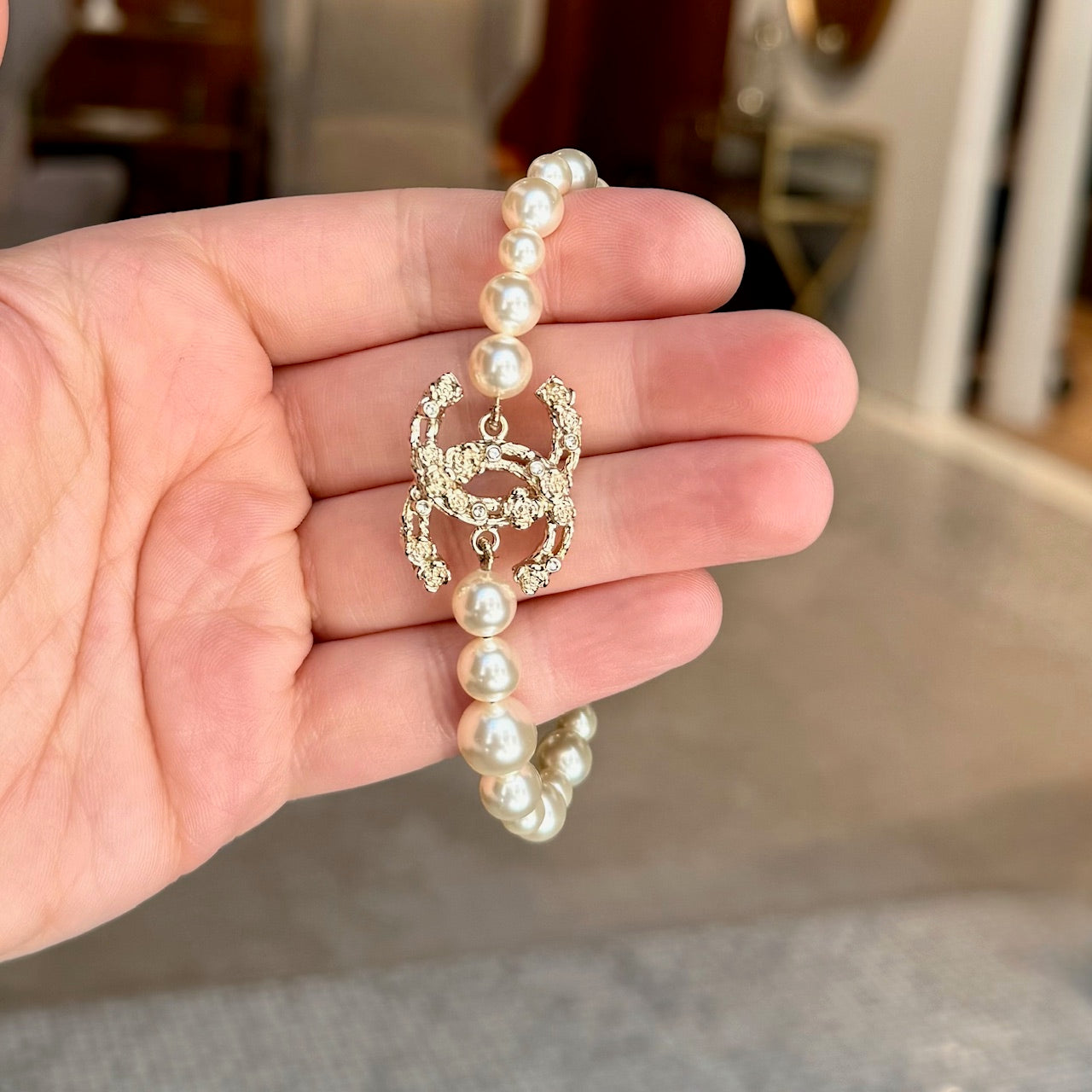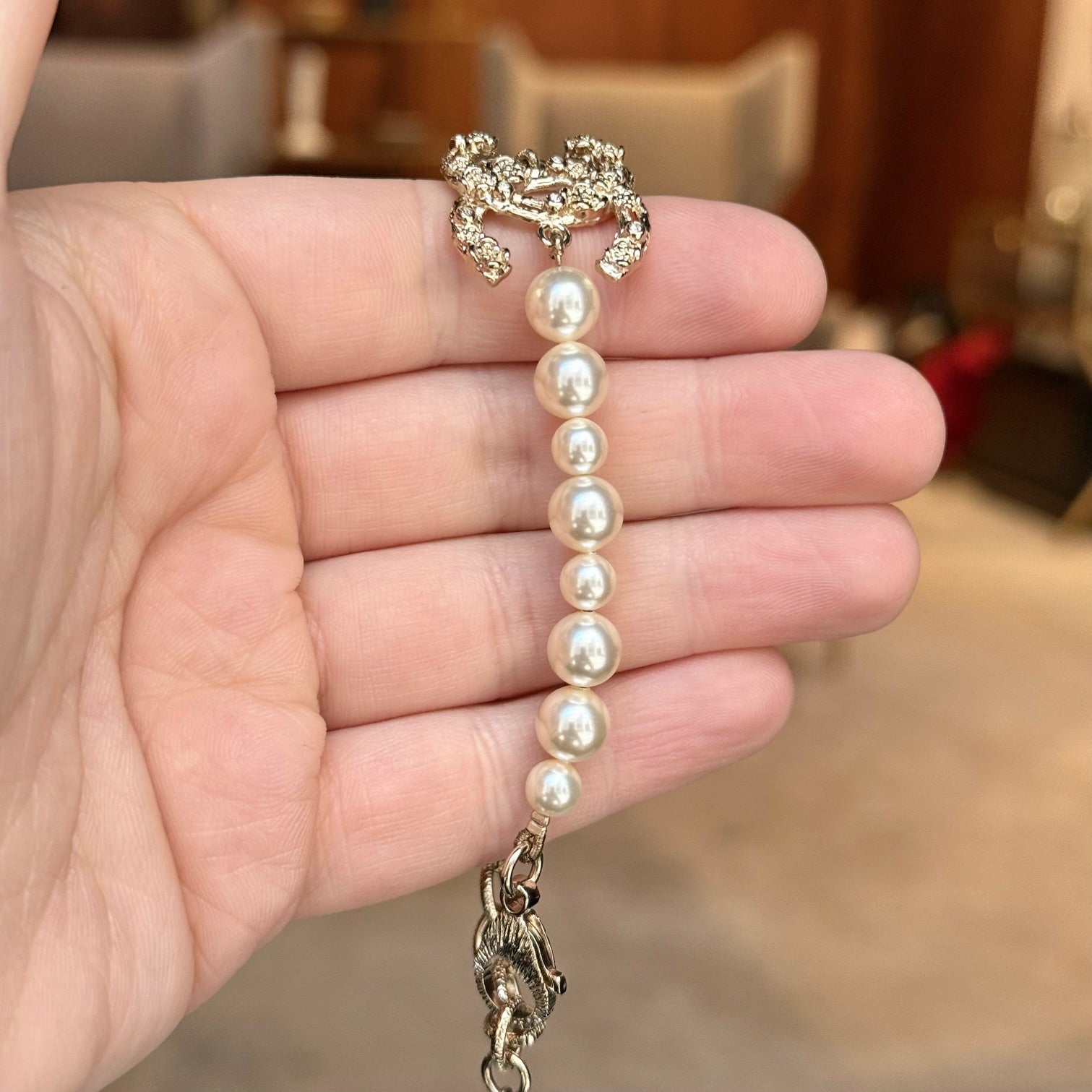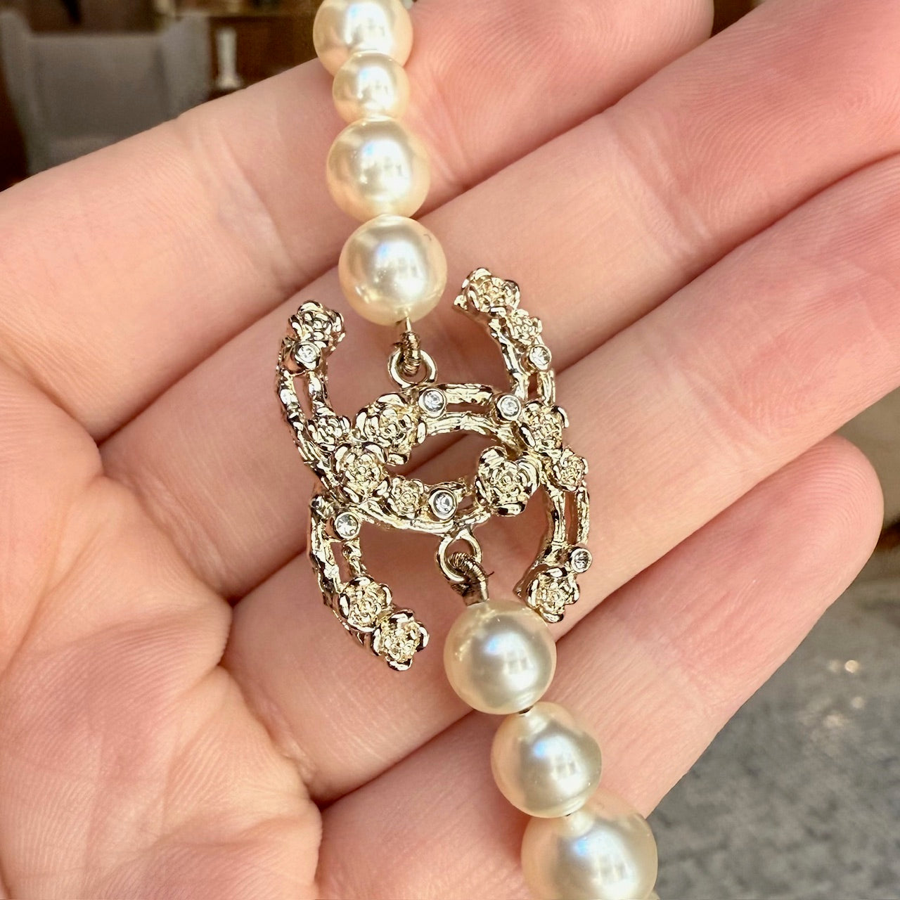 From the Chanel 2022 Cruise collection. Strand of faux white pearls in various sizes. Central interlocking CC charm station in textured gold-tone metal with camellia relief and crystal accents. Adjustable lobster clasp with short link chain for adjustable fit. Single faux pearl charm. Made in Italy. Comes as is.