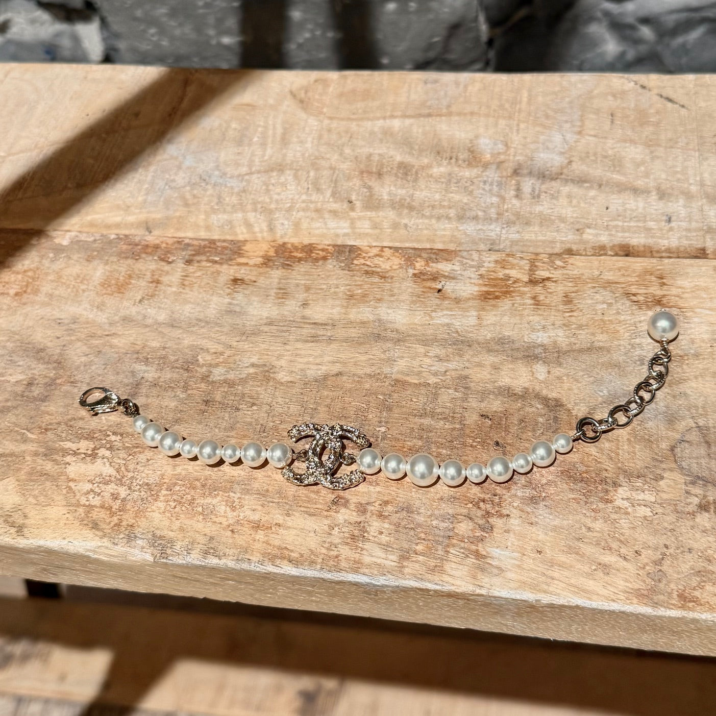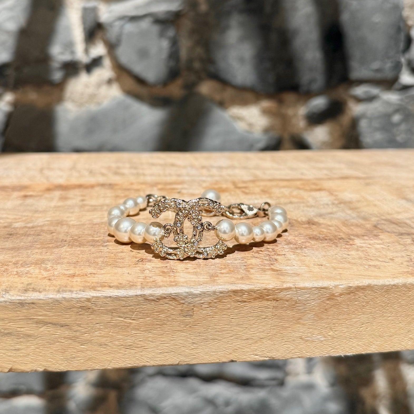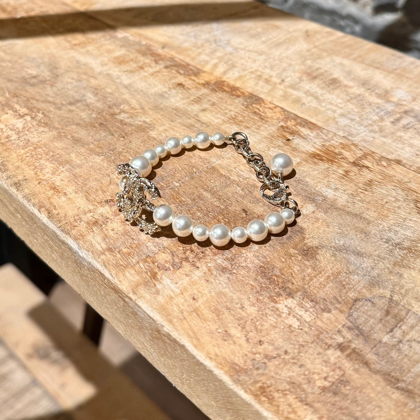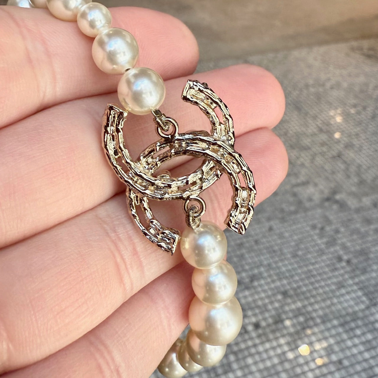 From the Chanel 2022 Cruise collection. Strand of faux white pearls in various sizes. Central interlocking CC charm station in textured gold-tone metal with camellia relief and crystal accents. Adjustable lobster clasp with short link chain for adjustable fit. Single faux pearl charm. Made in Italy. Comes as is.
