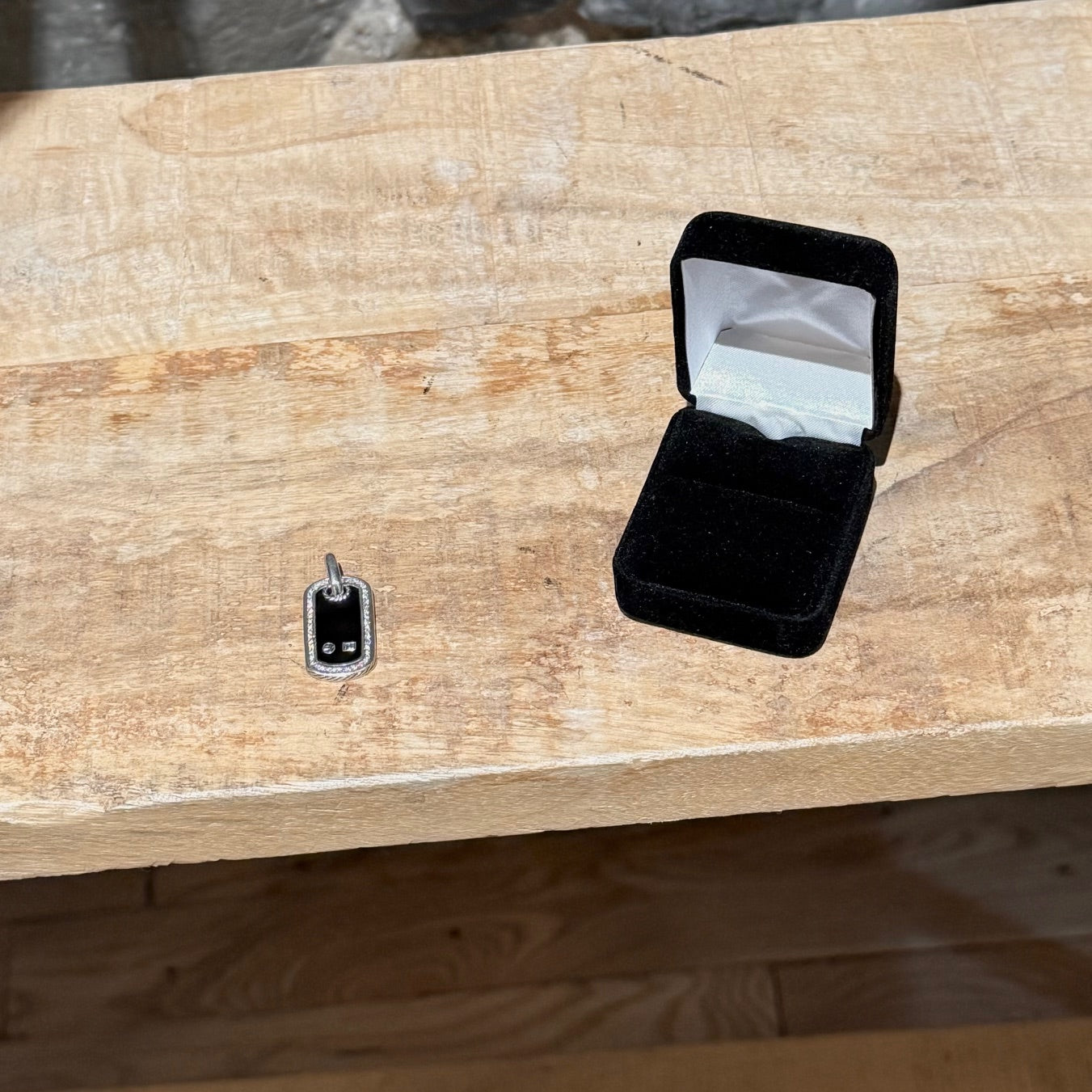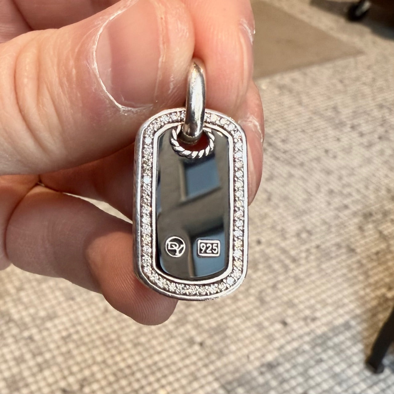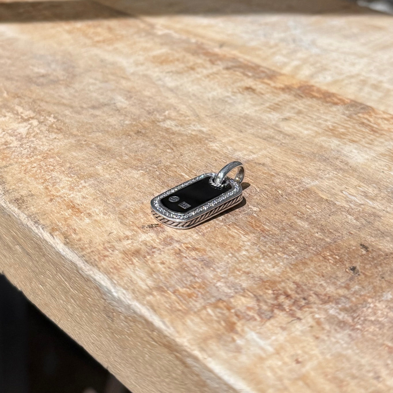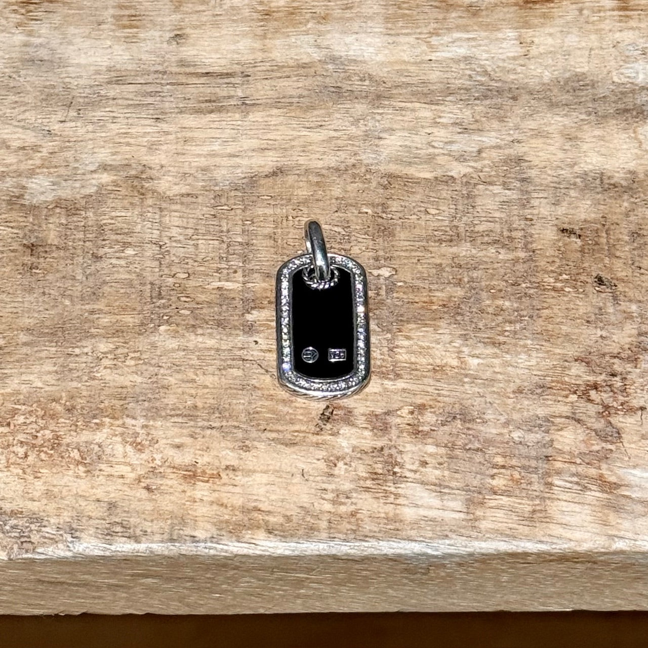 Curved rectangular dog tag pendant with high-polish black onyx inlay. Bezel-set clear diamond pavé frame. Smooth polished sterling silver. Cable detail at the bail and sides. Fixed oval jump ring. Plain back. Signed David Yurman hallmark and engraved 925. Comes with a complimentary case.