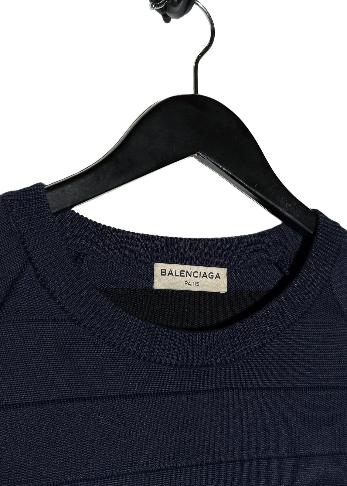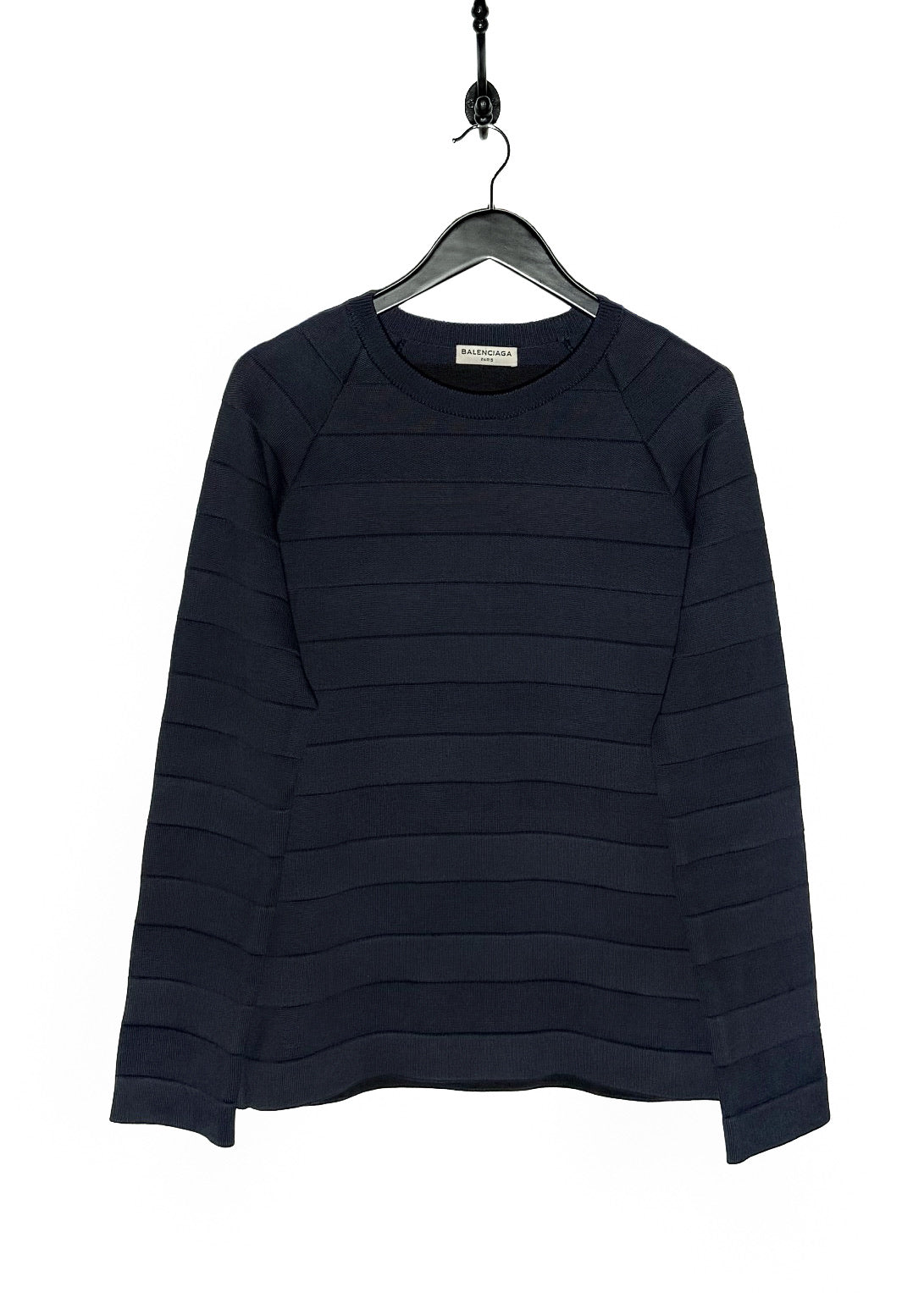 From the 2014 collection. Mid-weight semi stiff knit. Horizontal ribbed bands across the body and sleeves, giving a superposition effect. Classic crew neckline with ribbed finish. Raglan-style long sleeves. Straight hem. Made in Italy.