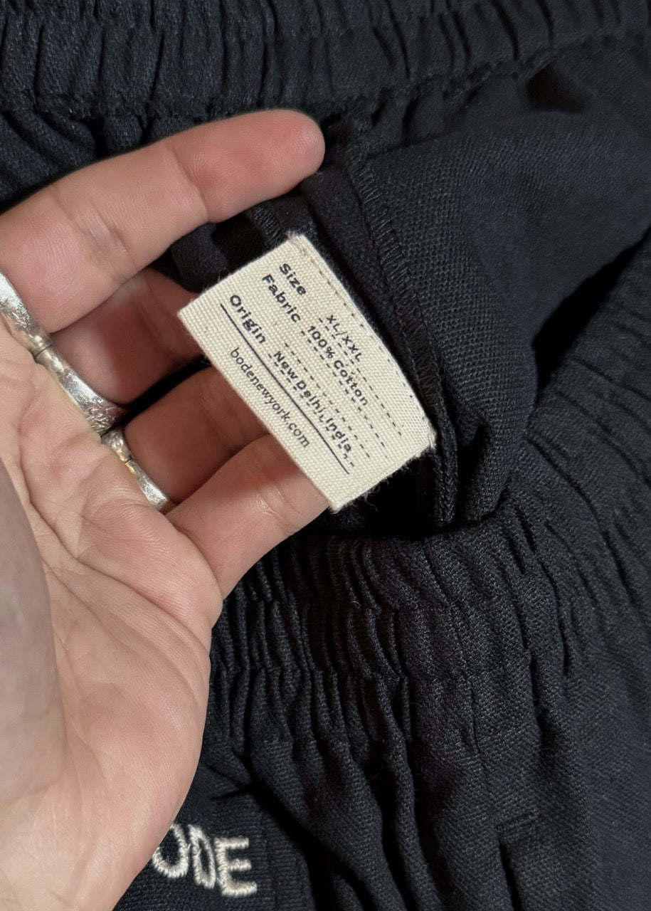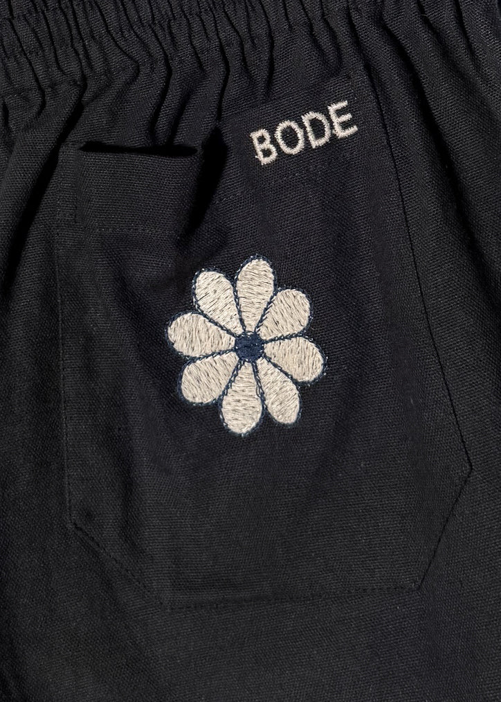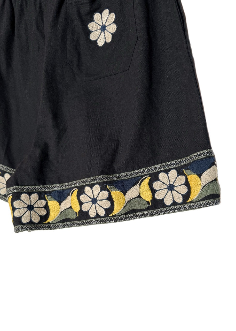 Black cotton with vibrant embroidered floral trims at the hems. Relaxed silhouette. Features an elastic waistband, a single patch pocket at the back with a floral embroidery. Made in New Delhi.