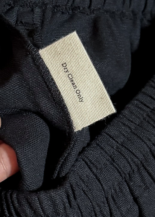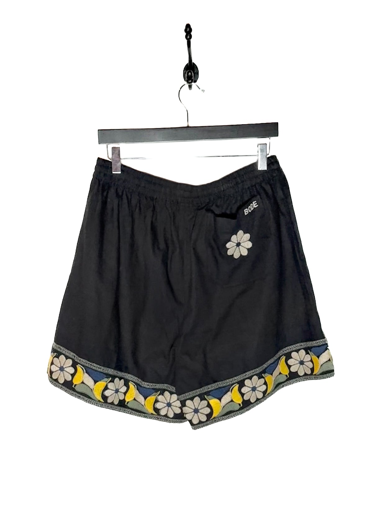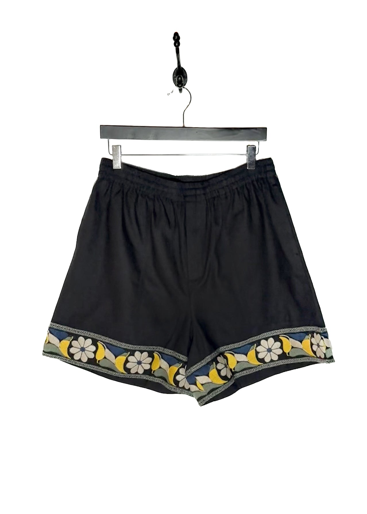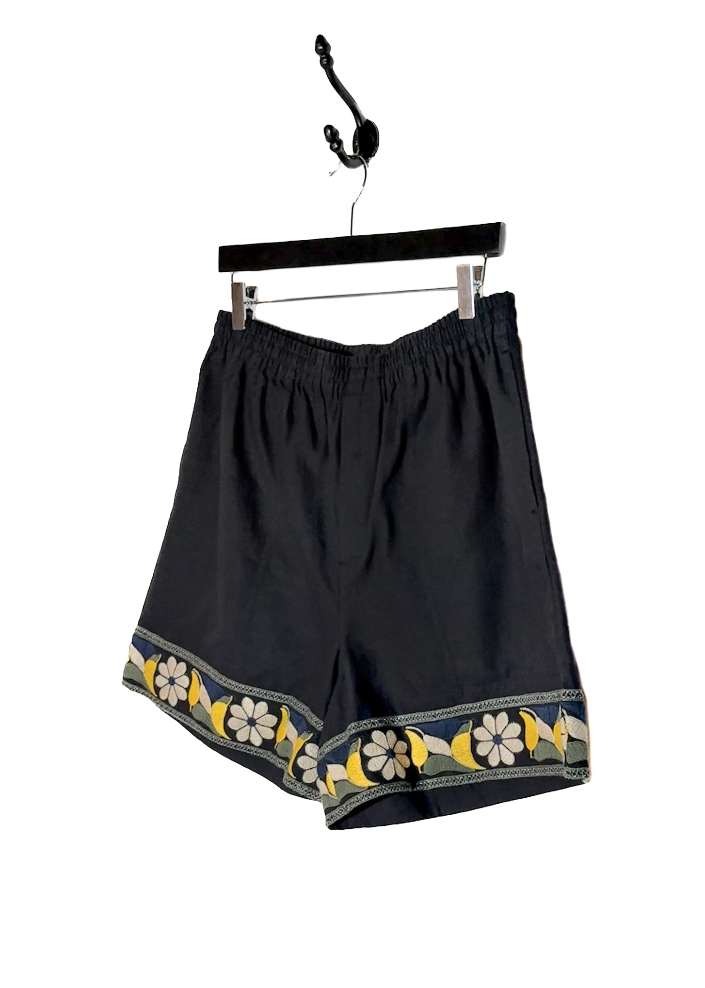 Black cotton with vibrant embroidered floral trims at the hems. Relaxed silhouette. Features an elastic waistband, a single patch pocket at the back with a floral embroidery. Made in New Delhi.