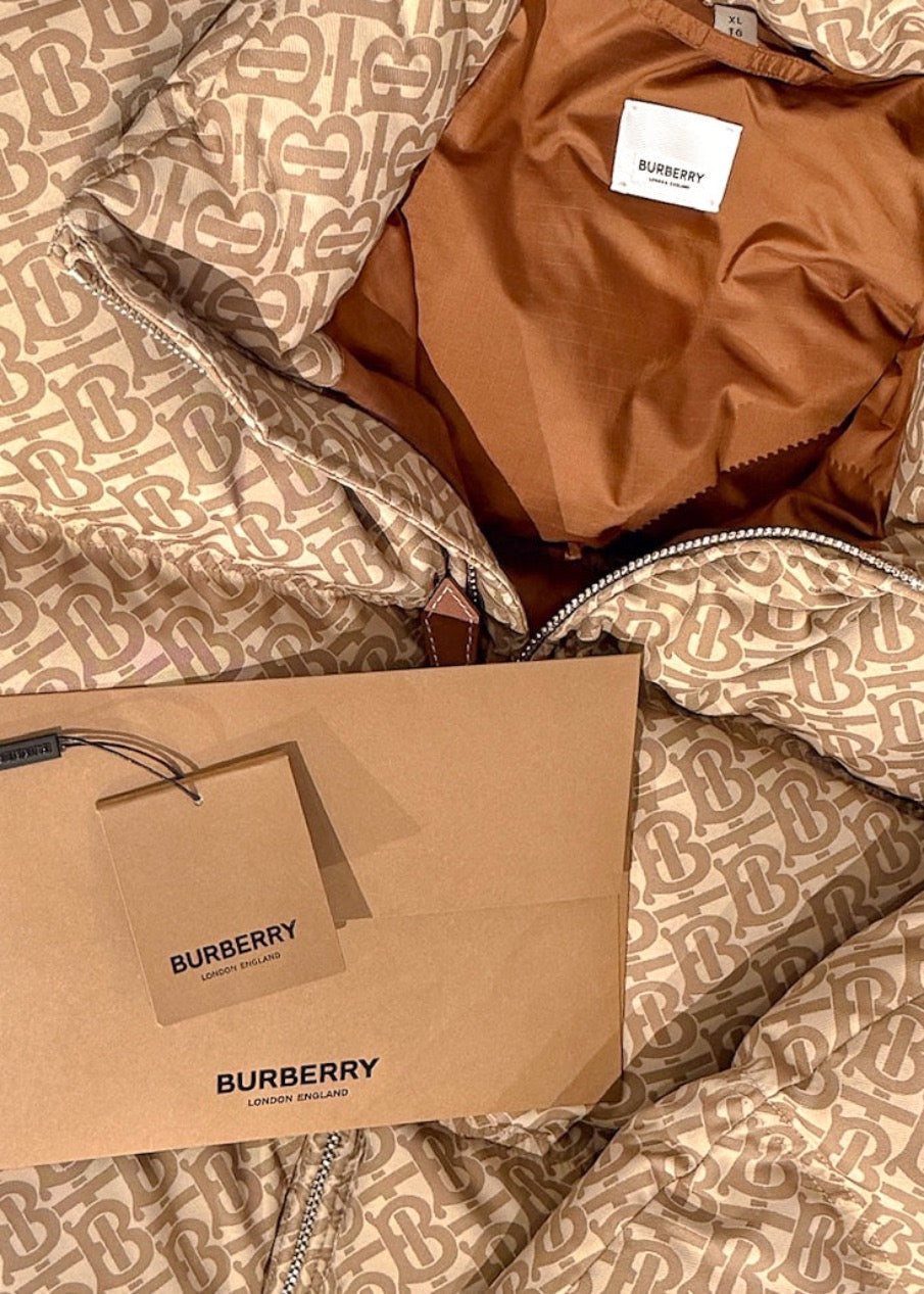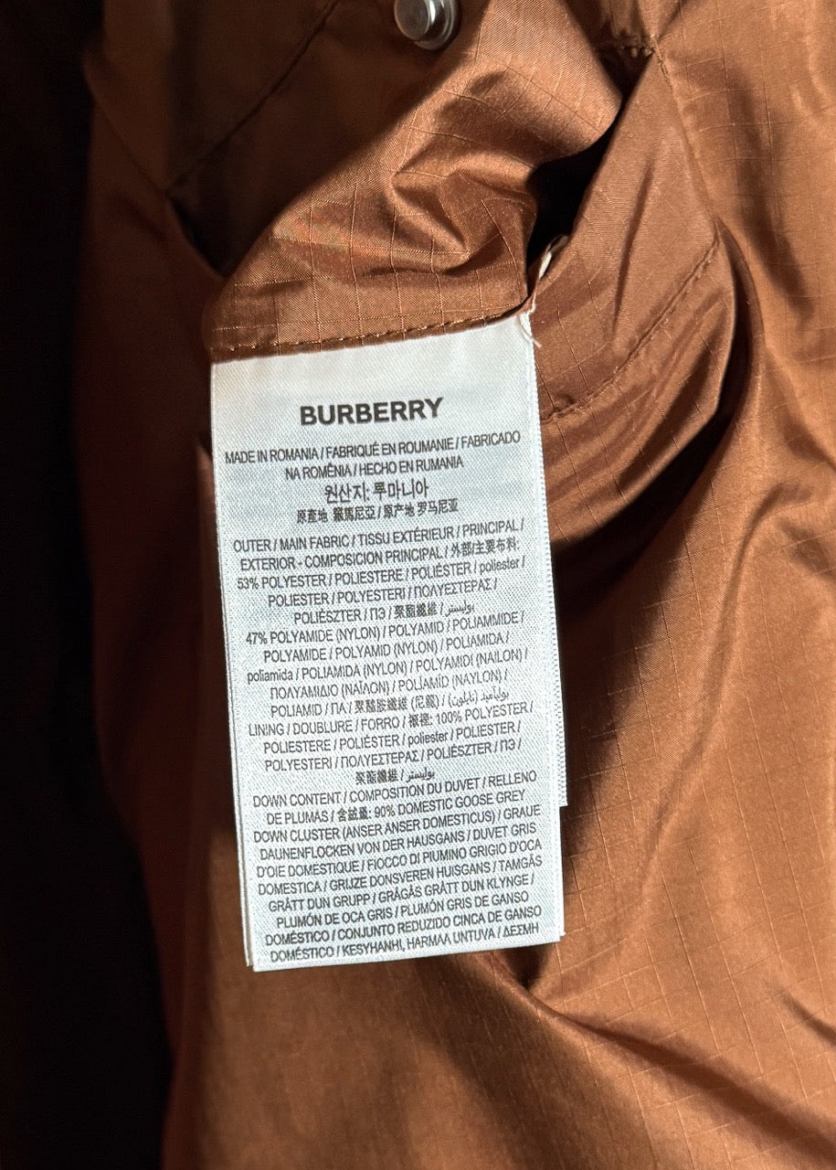 Short coat in technical quilted jacquard blend featuring an allover Burberry’s Thomas Burberry Monogram motif in warm beige tones. Down filled quilted puffer. High stand collar. Two-way front zip closure. Branded hardware. Two (2) front zip pockets. Brown leather pull tabs at zippers. Adjustable drawcord at hem. Lined in smooth brown tear-resistant polyester. Made in Romania. Comes with the original tag and receipt.