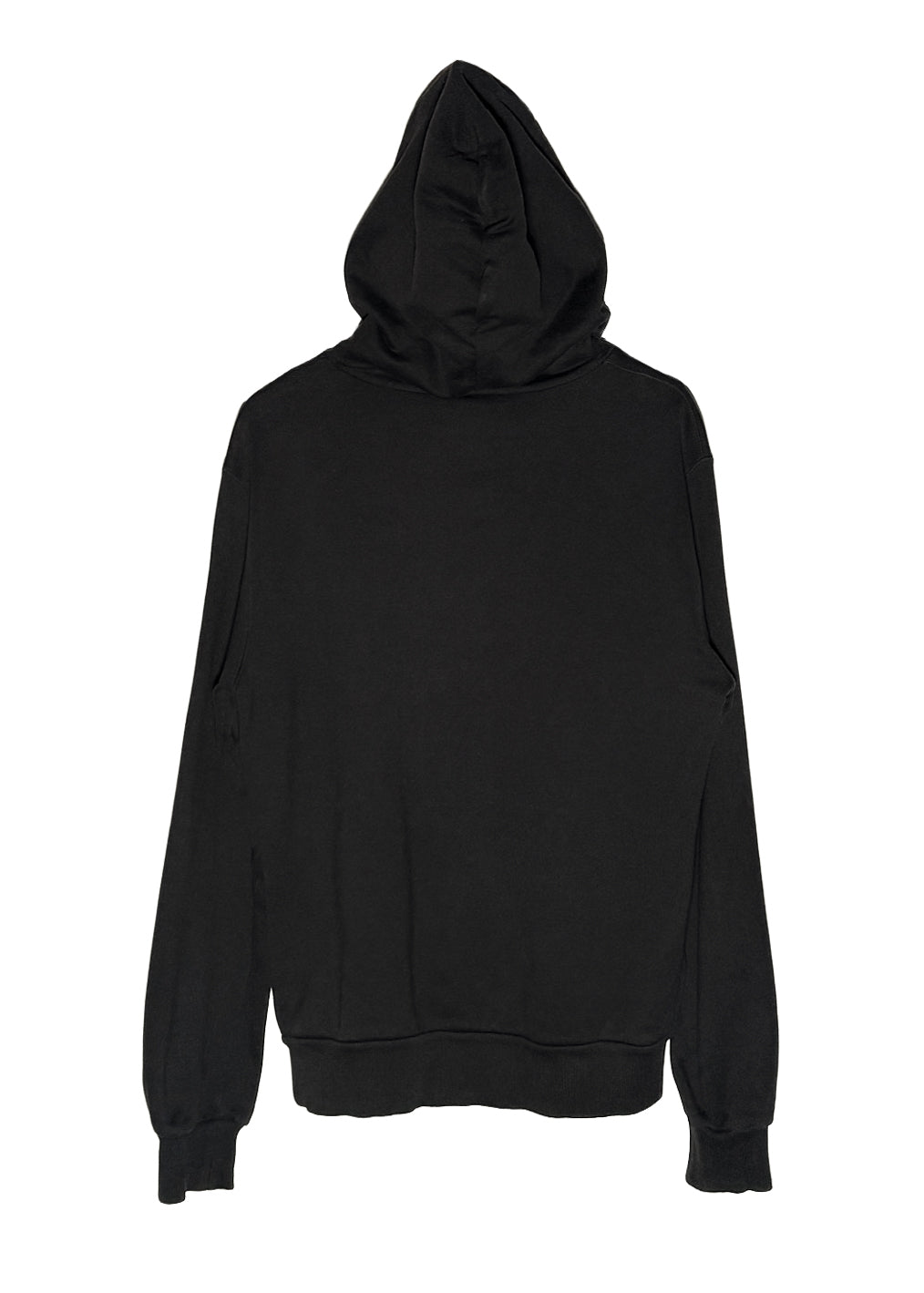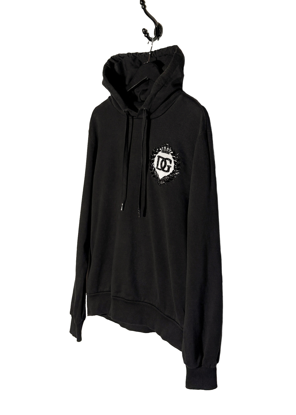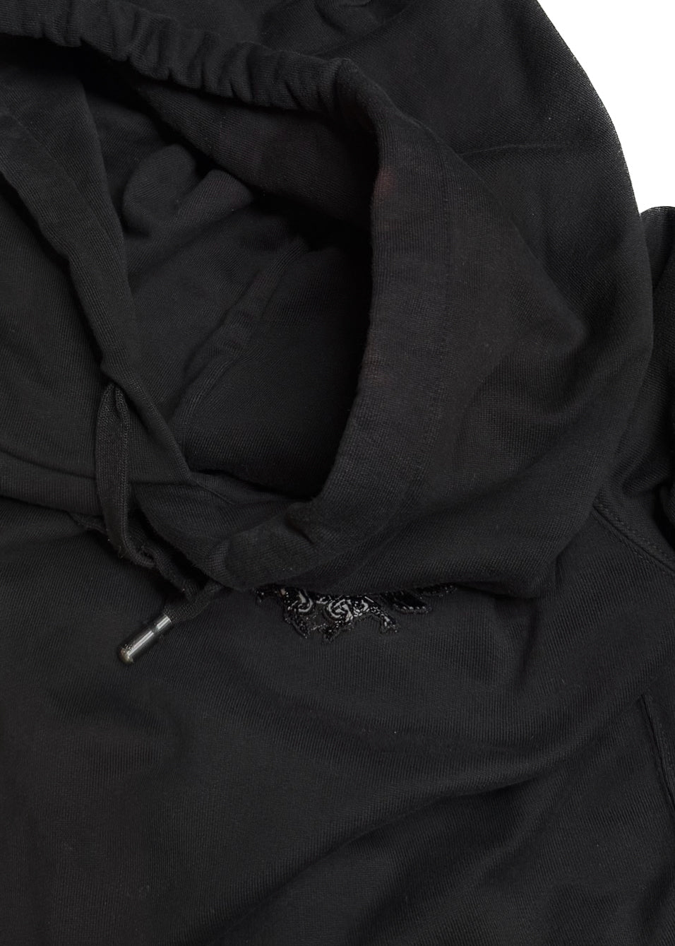 Soft black cotton jersey. Features a drawstring hood with branded metal aglets and eyelets. Front heraldic crest logo patch embroidered in black beading on white thread. Black crown motif. Ribbed cuffs and hem. Classic fit. Made in Italy.