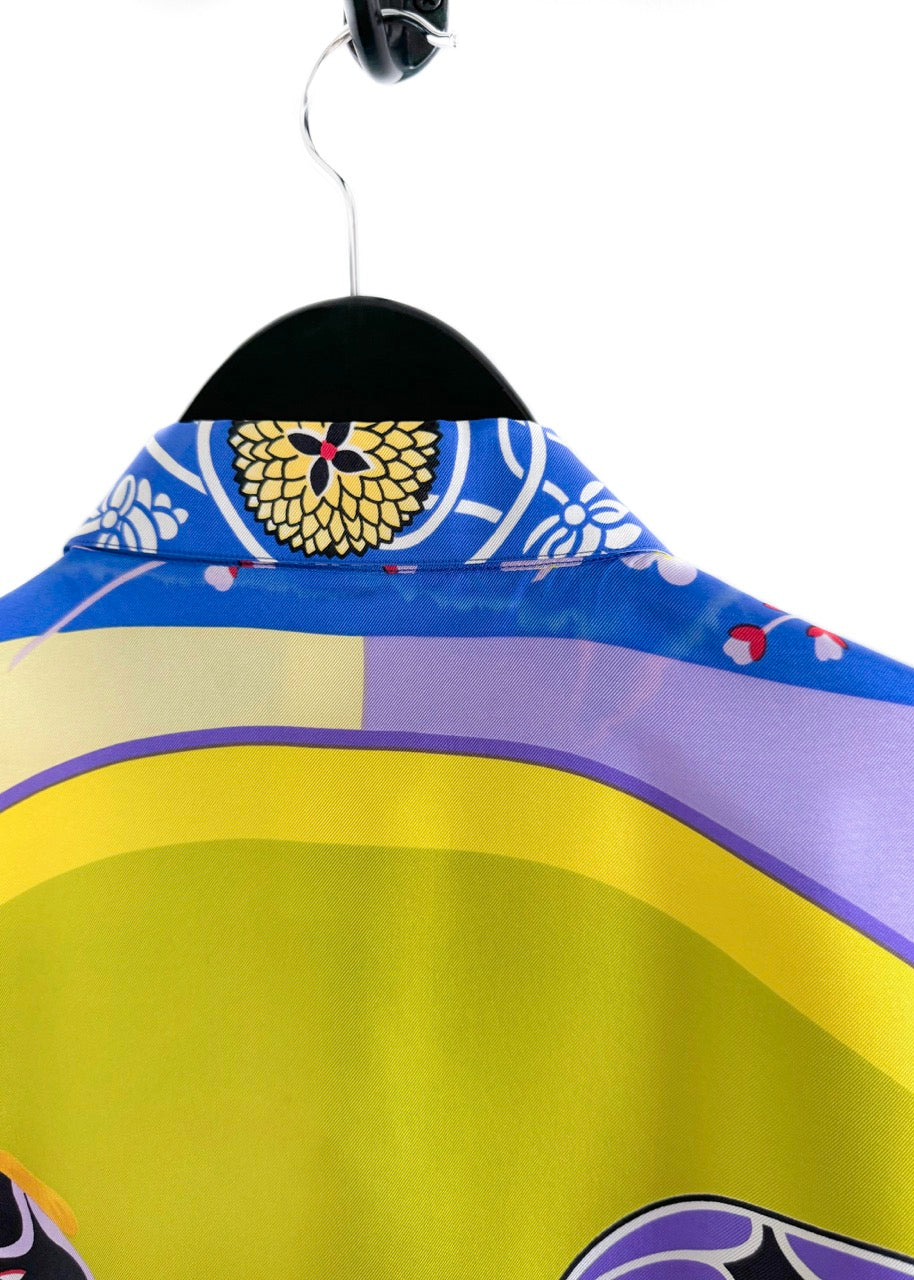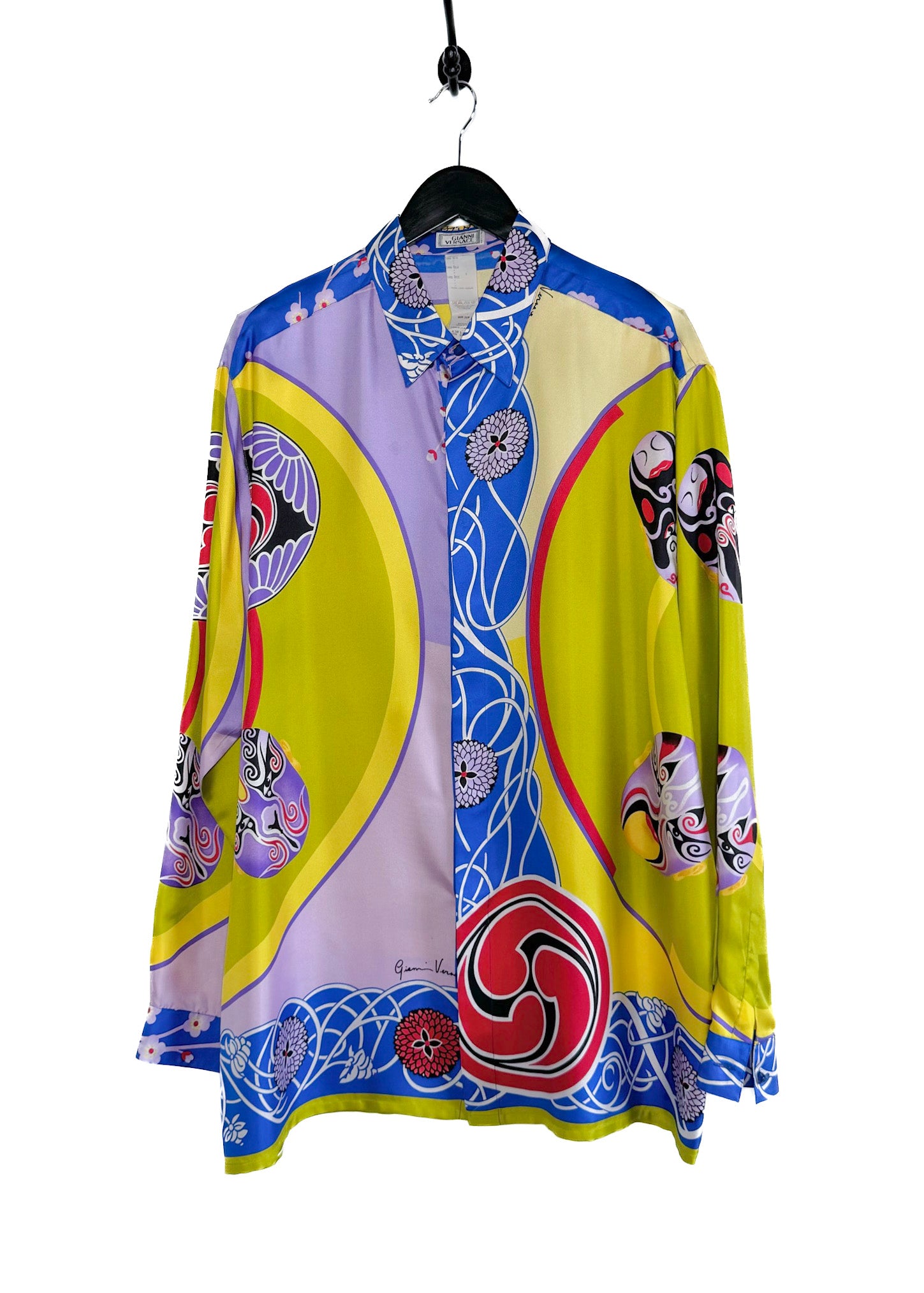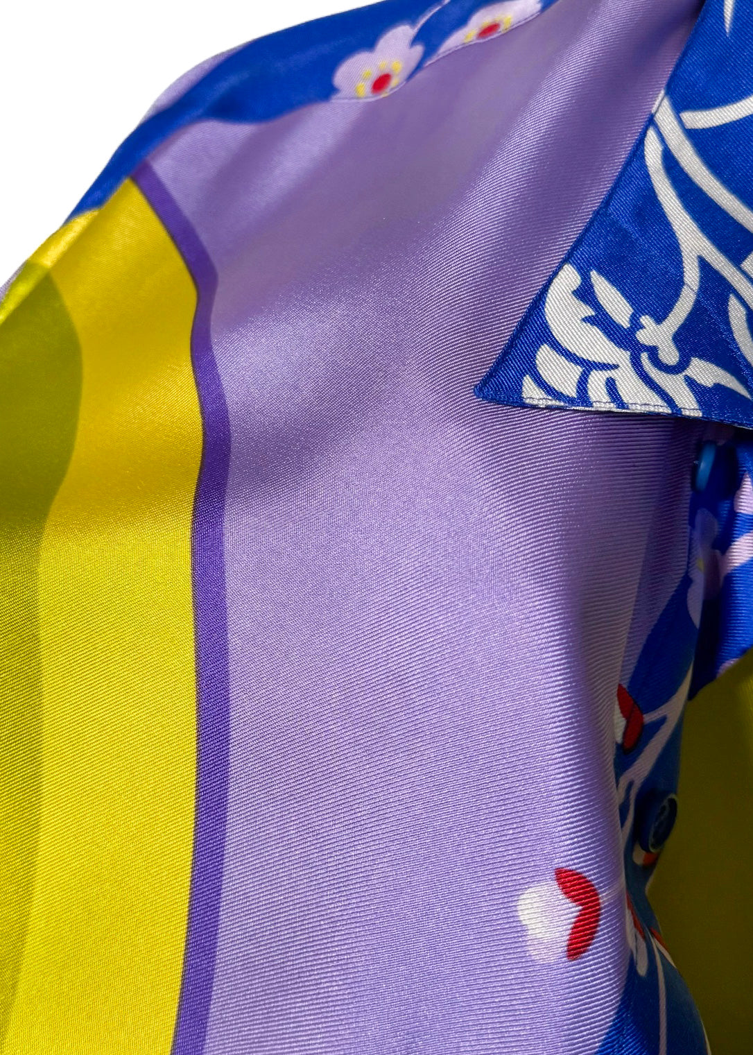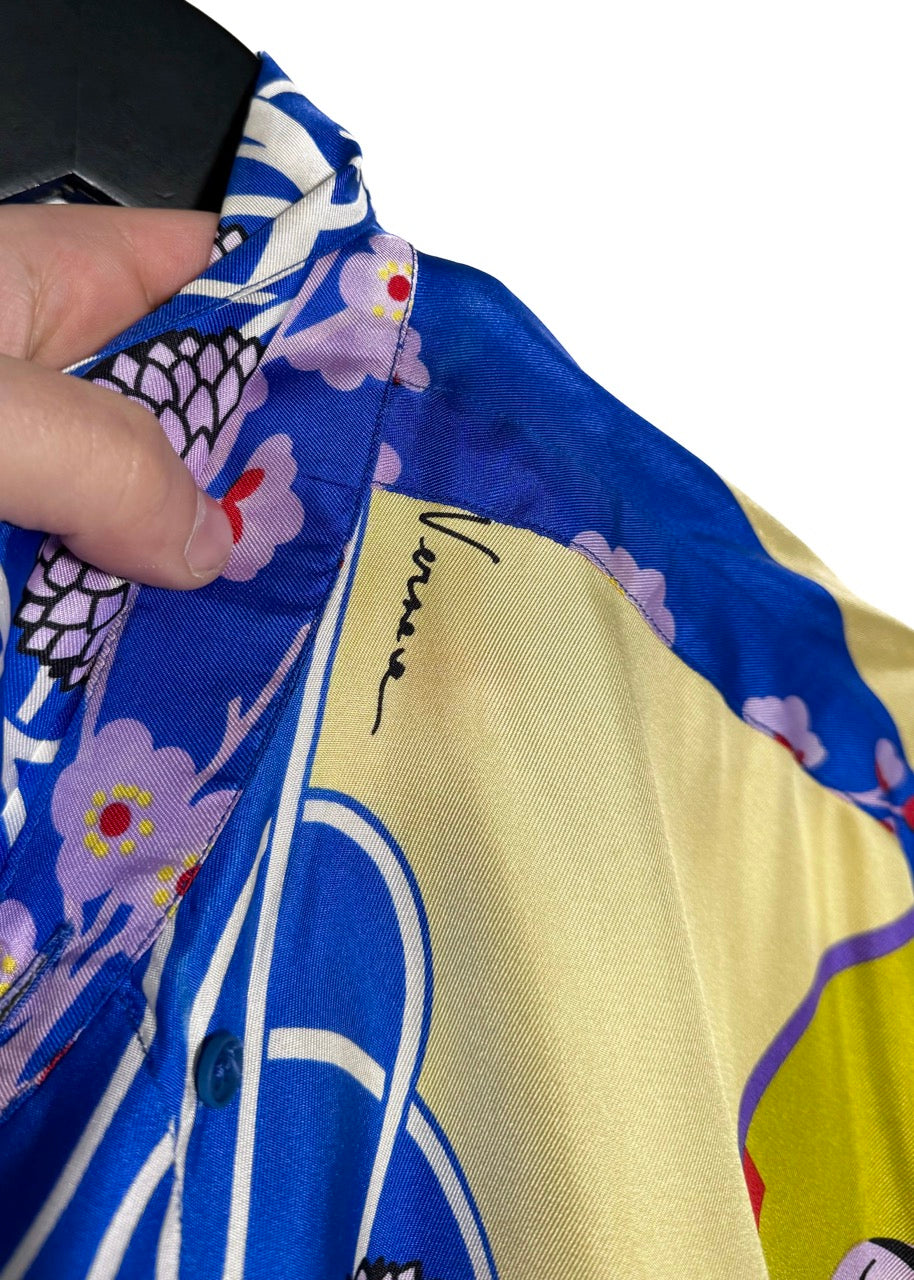 Yellow, blue, black, purple, red and white prints throughout. Blue medusa buttons. Front button closure. Long sleeves. Spread collar. Made in Italy.
