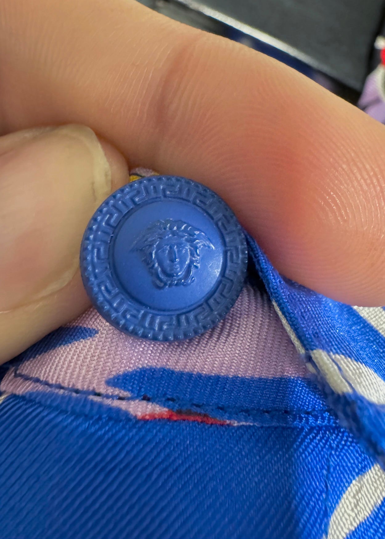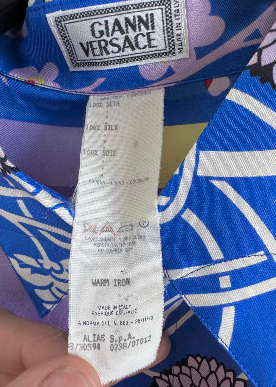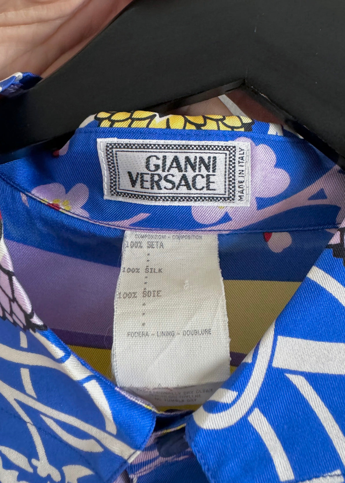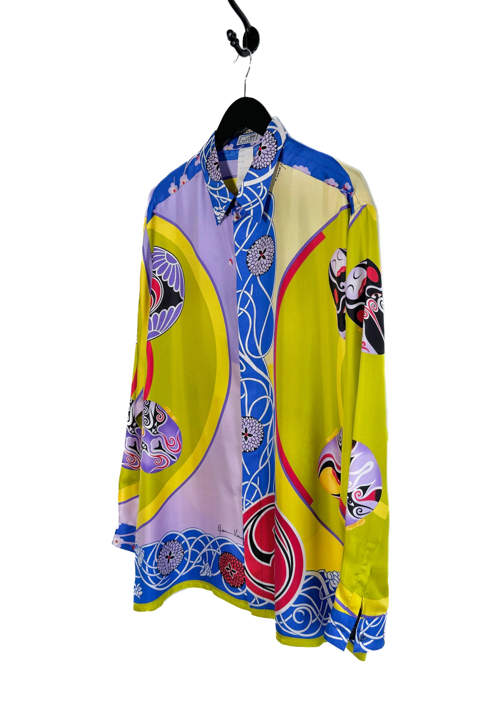 Yellow, blue, black, purple, red and white prints throughout. Blue medusa buttons. Front button closure. Long sleeves. Spread collar. Made in Italy.