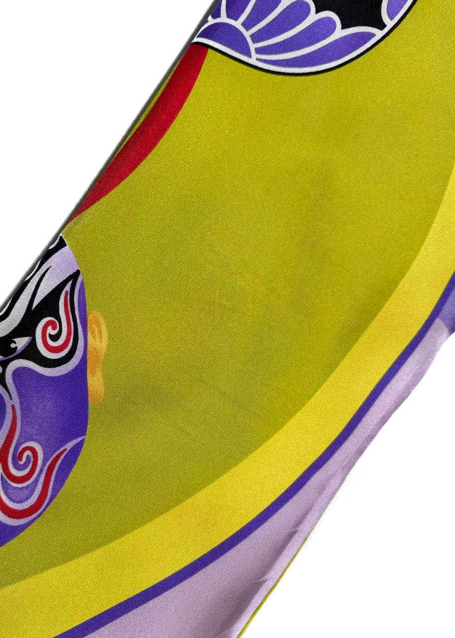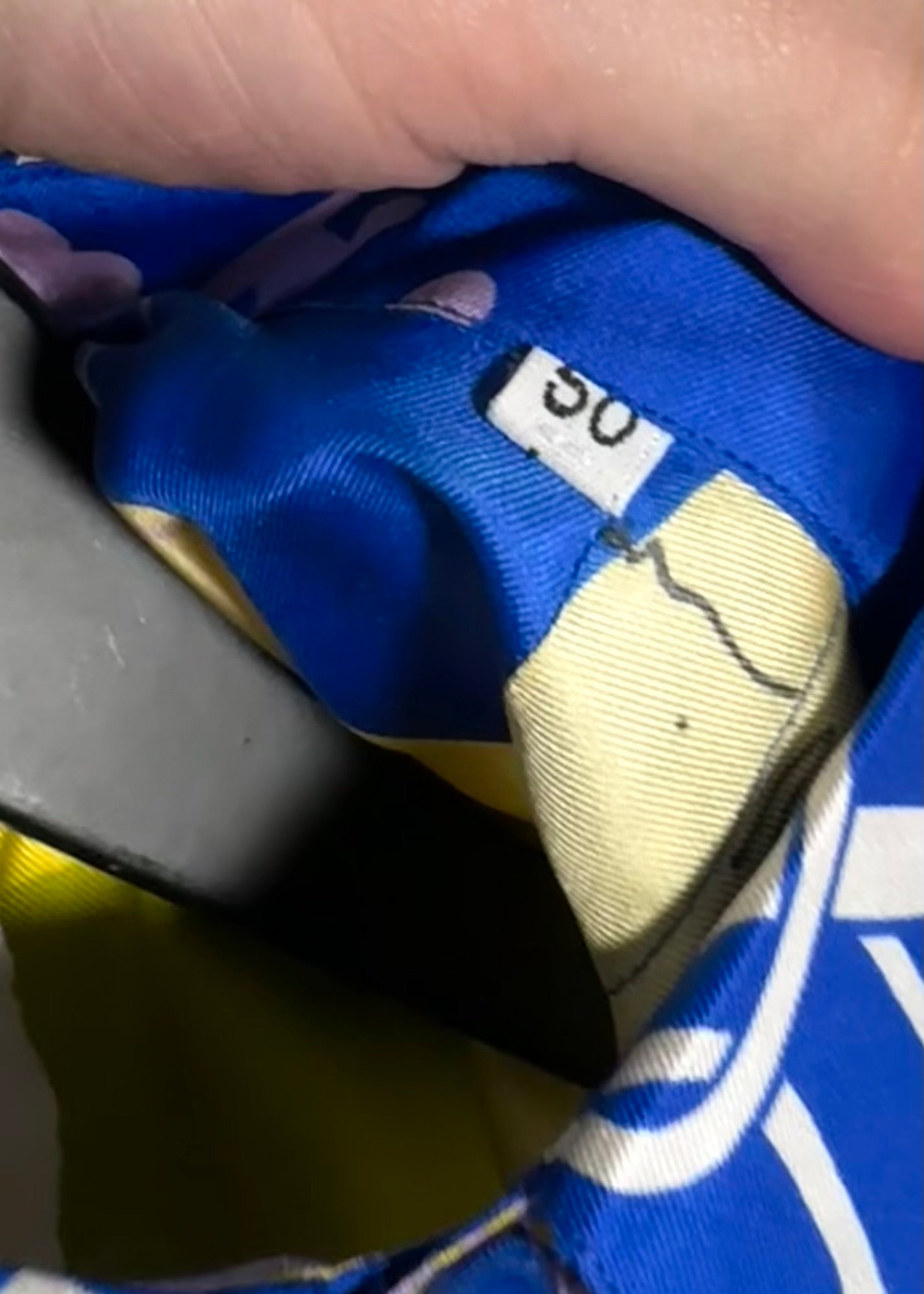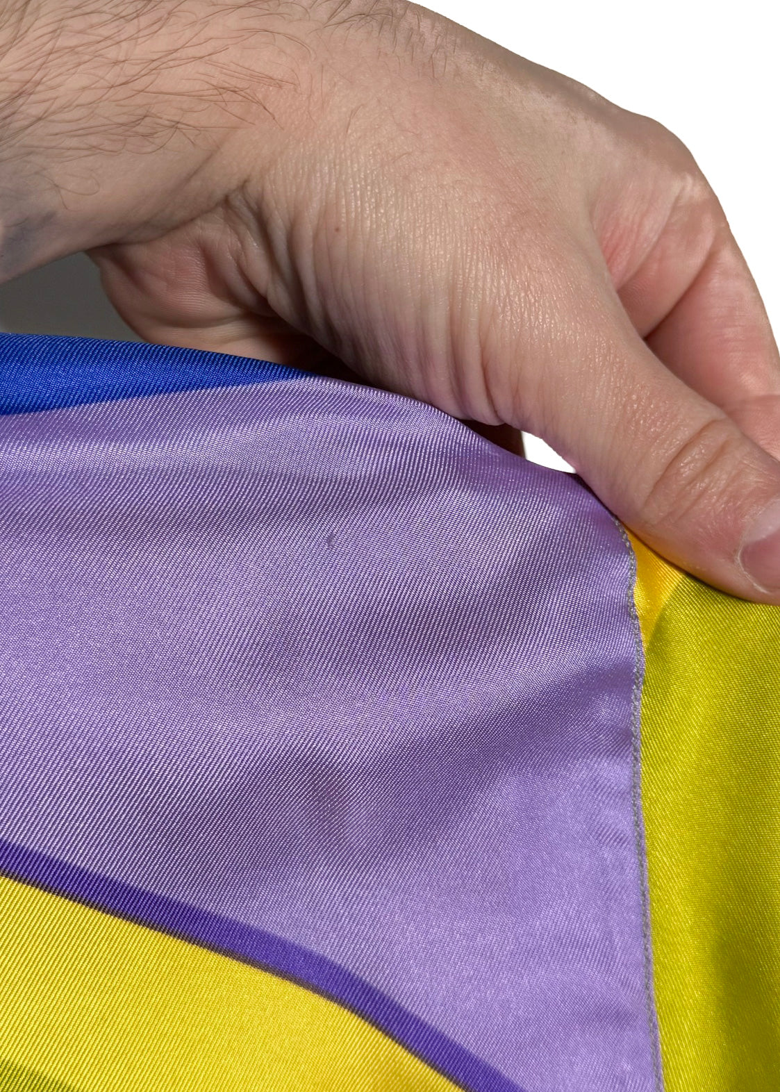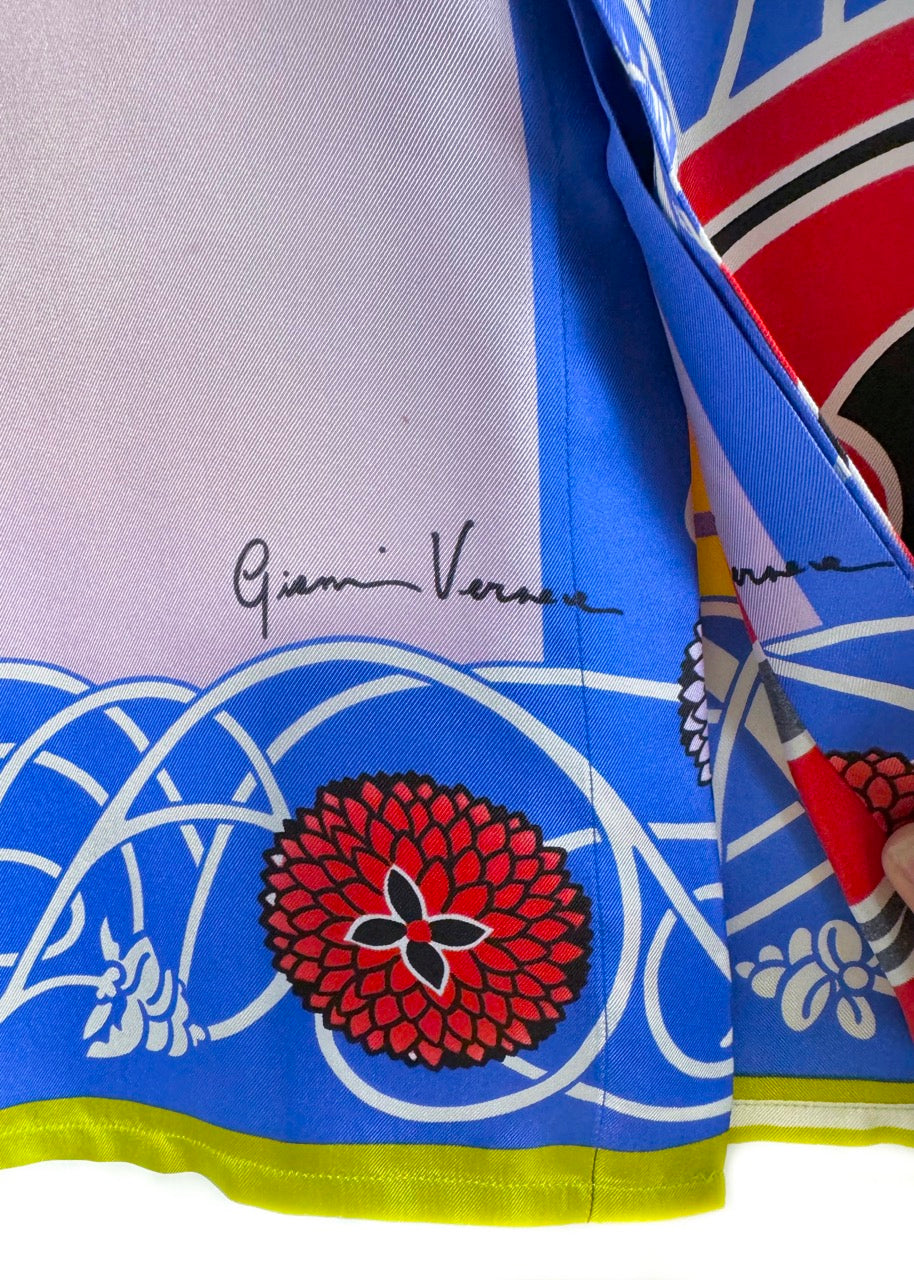Yellow, blue, black, purple, red and white prints throughout. Blue medusa buttons. Front button closure. Long sleeves. Spread collar. Made in Italy.