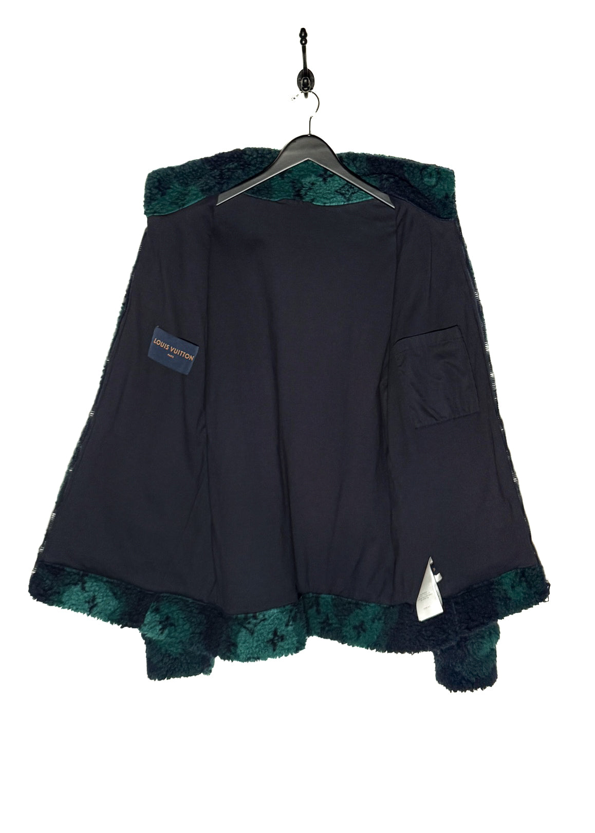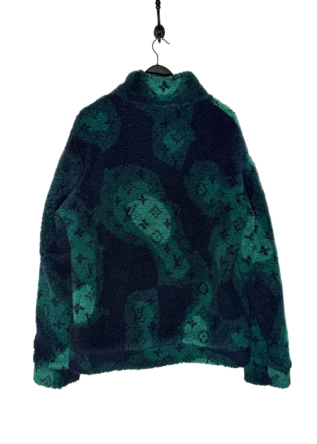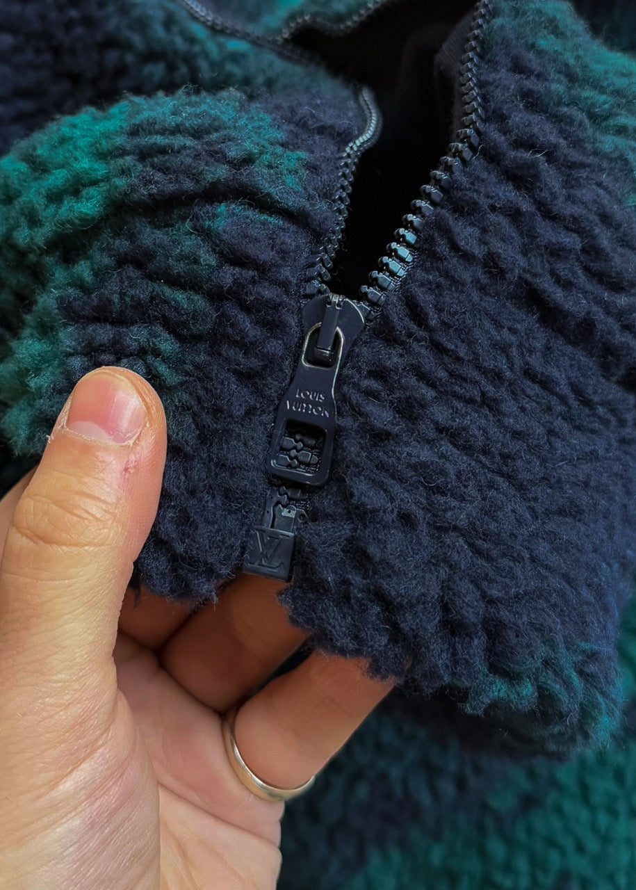 Soft fleece in polyester and wool blend. Camouflage-inspired effect with iconic monogram pattern throughout in navy blue and green tones. High stand collar. Full front zip closure with navy blue LV-engraved hardware. Side welt pockets. Interior pocket. Soft cotton lining. Comes with original Louis Vuitton tags and purchase receipt. Made in Italy.