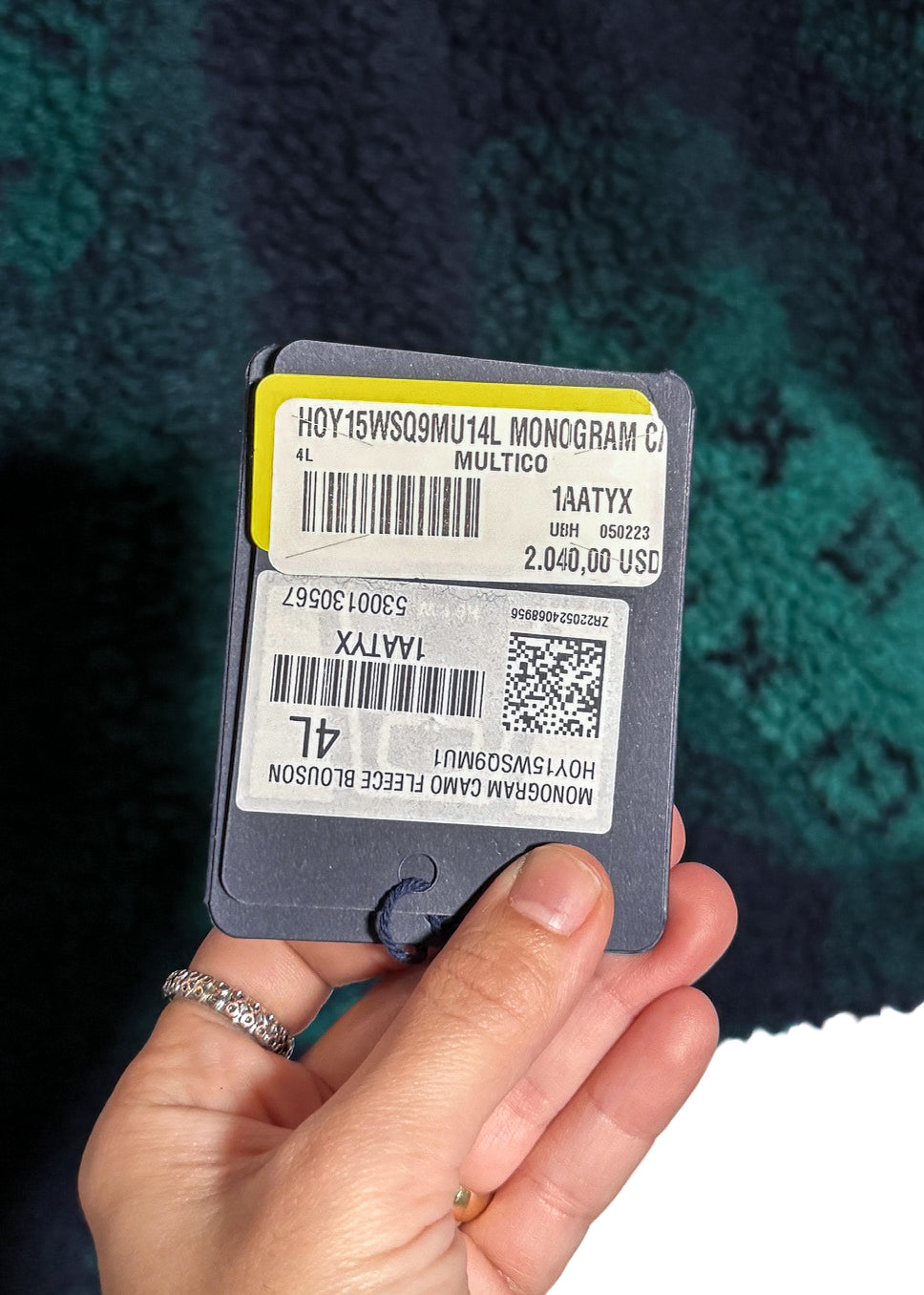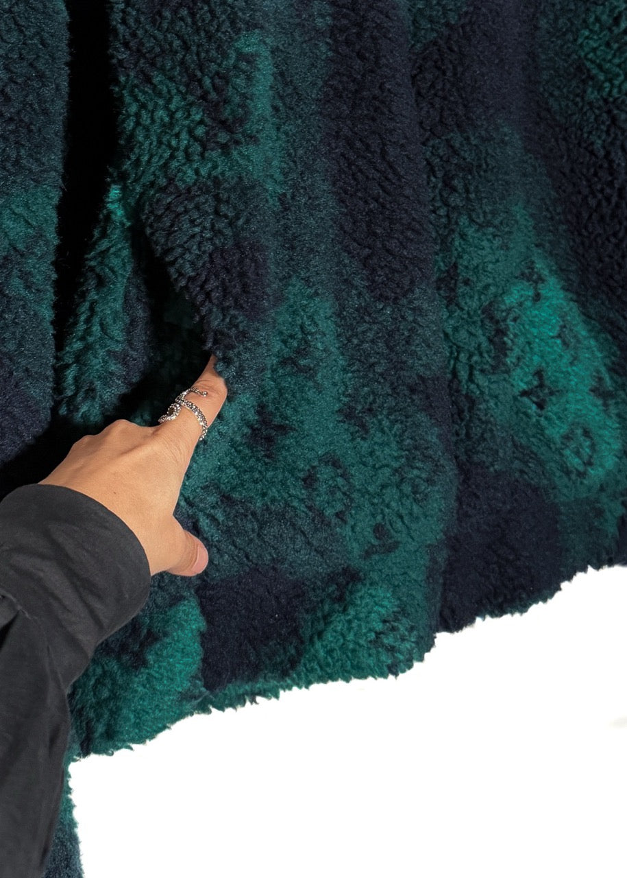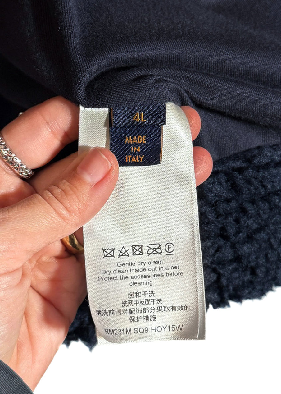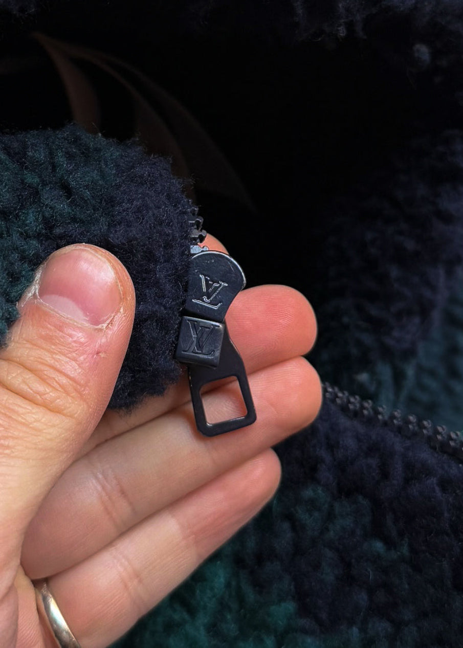 Soft fleece in polyester and wool blend. Camouflage-inspired effect with iconic monogram pattern throughout in navy blue and green tones. High stand collar. Full front zip closure with navy blue LV-engraved hardware. Side welt pockets. Interior pocket. Soft cotton lining. Comes with original Louis Vuitton tags and purchase receipt. Made in Italy.
