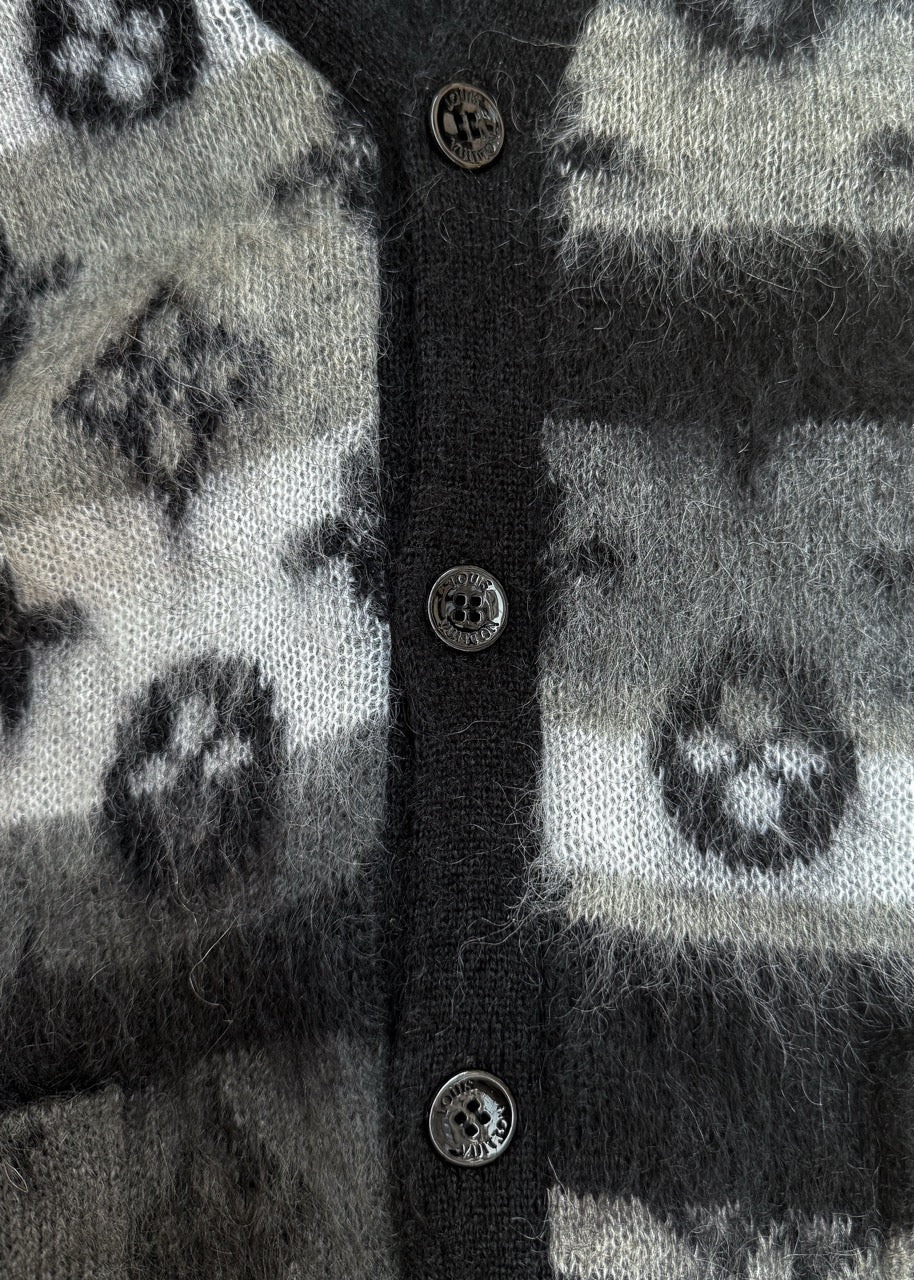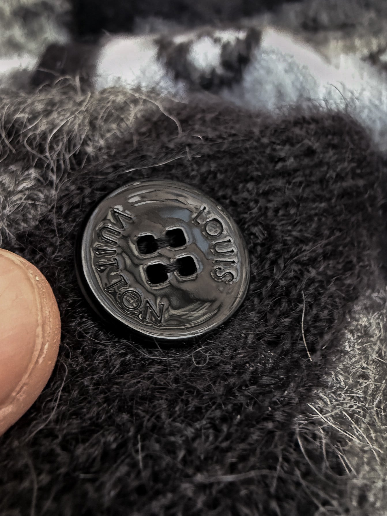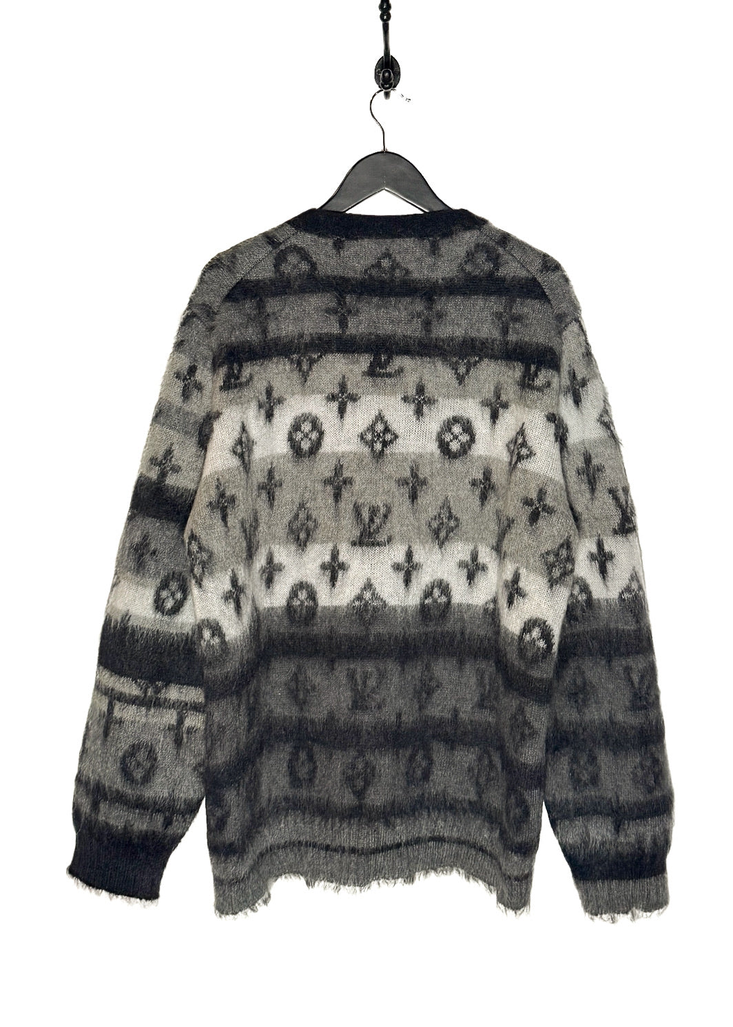 Gradient grey, black, and ivory tones with the LV Monogram motif throughout. Soft brushed texture. Front button closure with black engraved Louis Vuitton buttons. Ribbed cuffs and hem. Long sleeves. Two (2) front patch pockets. Relaxed fit. Made in Italy. Comes with Louis Vuitton box, original tags and receipt.