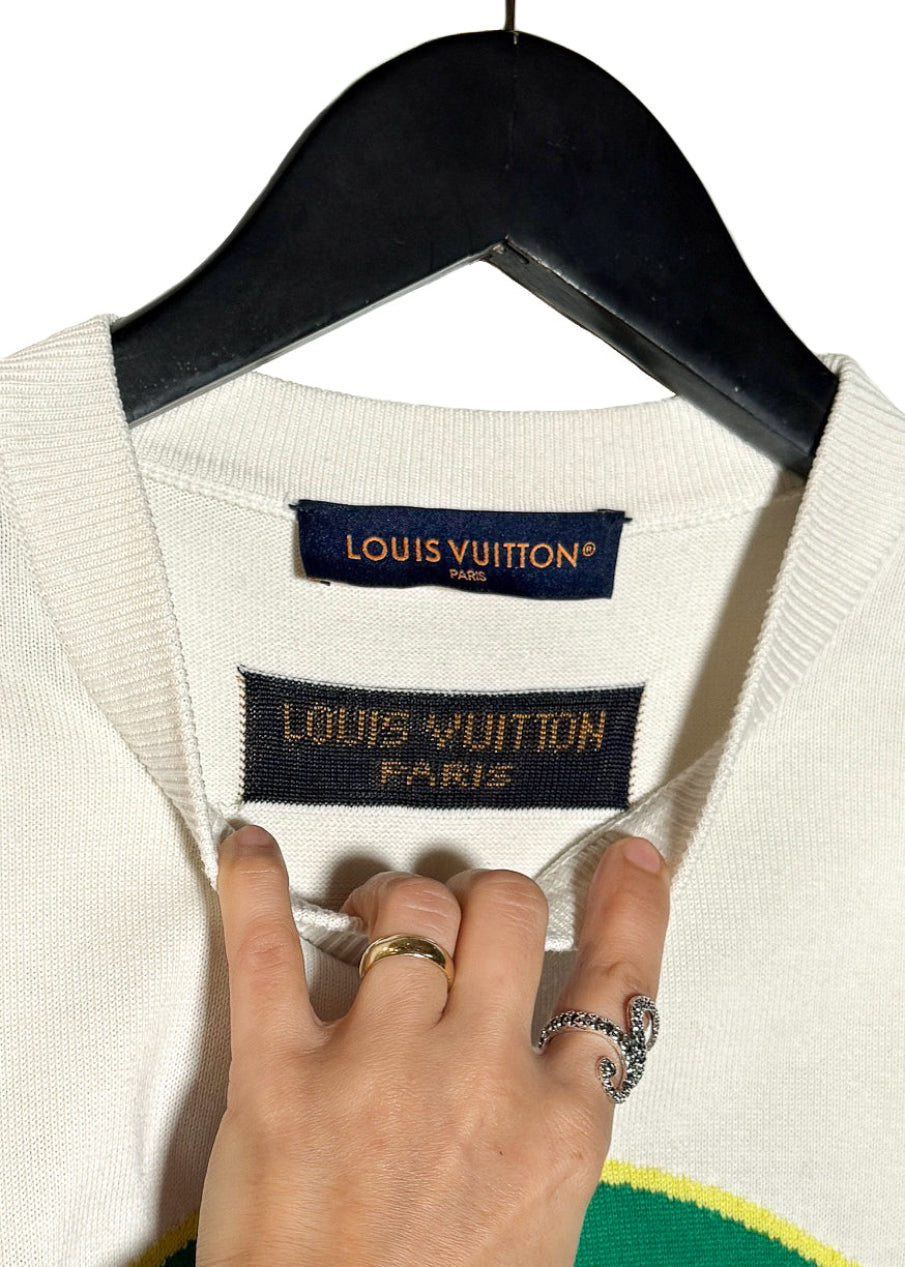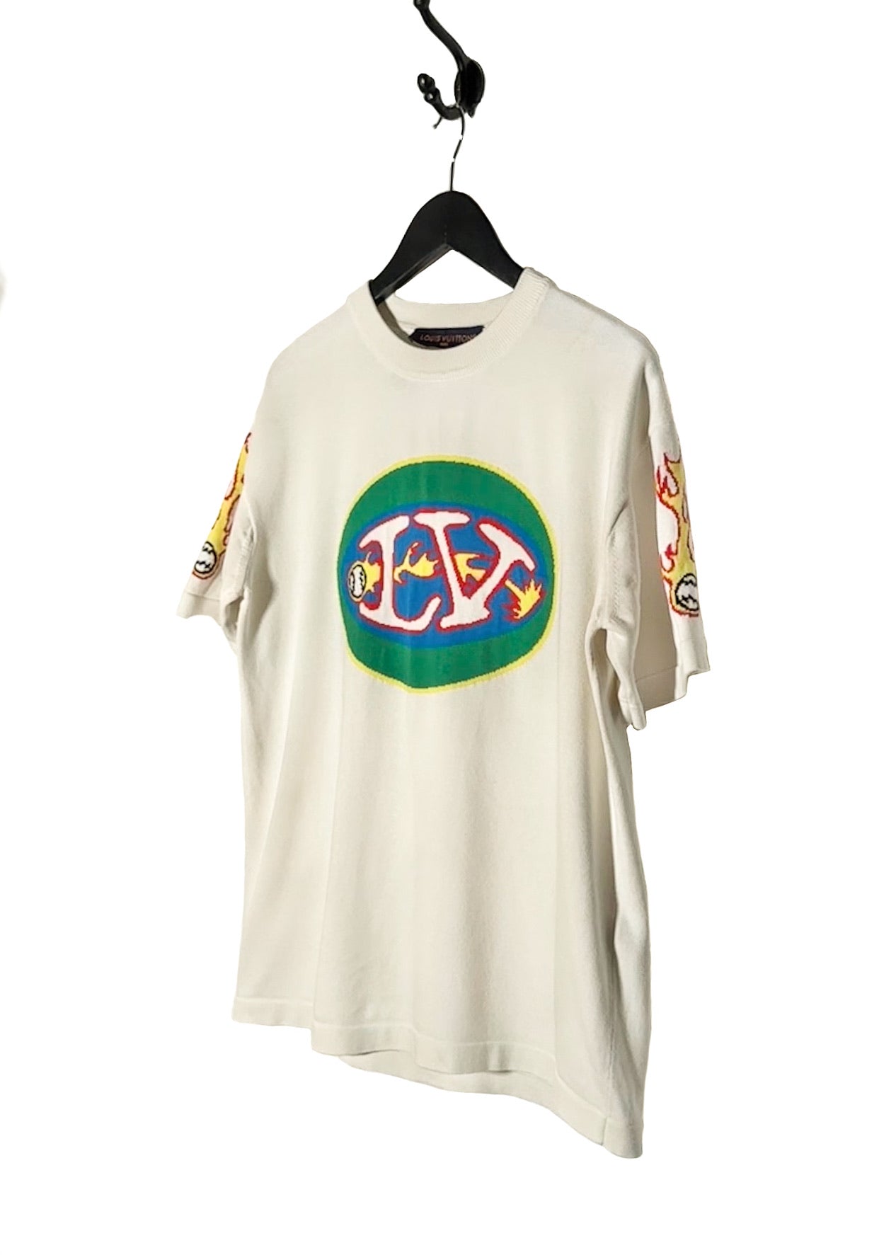 Louis Vuitton Burning Baseball Intersia Graphic Logo Knit T-shirt. From the 2023 collection. 100% cotton ivory knit short sleeves t-shirt. Multicolour intarsia-knit LV logo with burning baseball graphic at the front. Flame and balls motifs on the sleeves. Intersia logo at upper back. Ribbed crew neckline. Straight hem. Made in Italy.