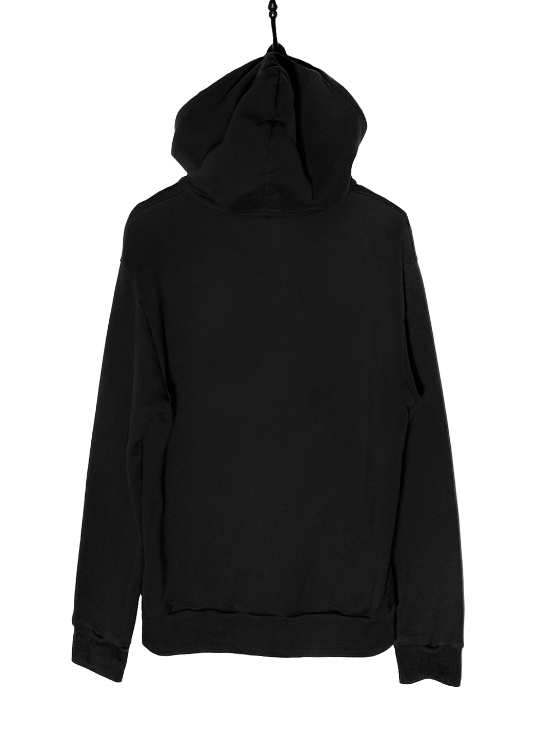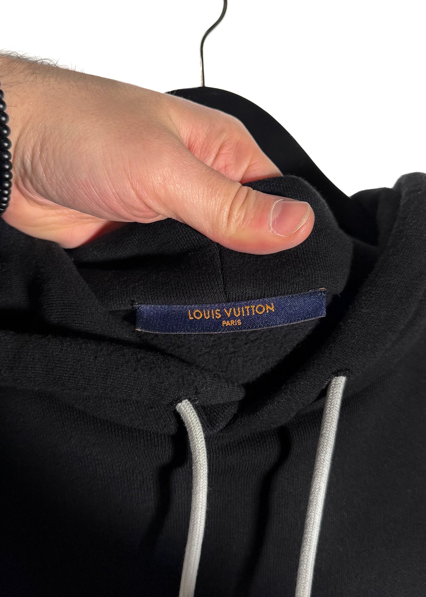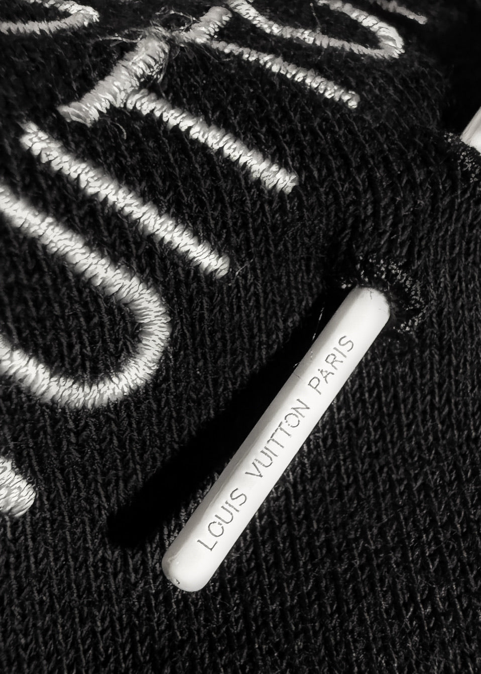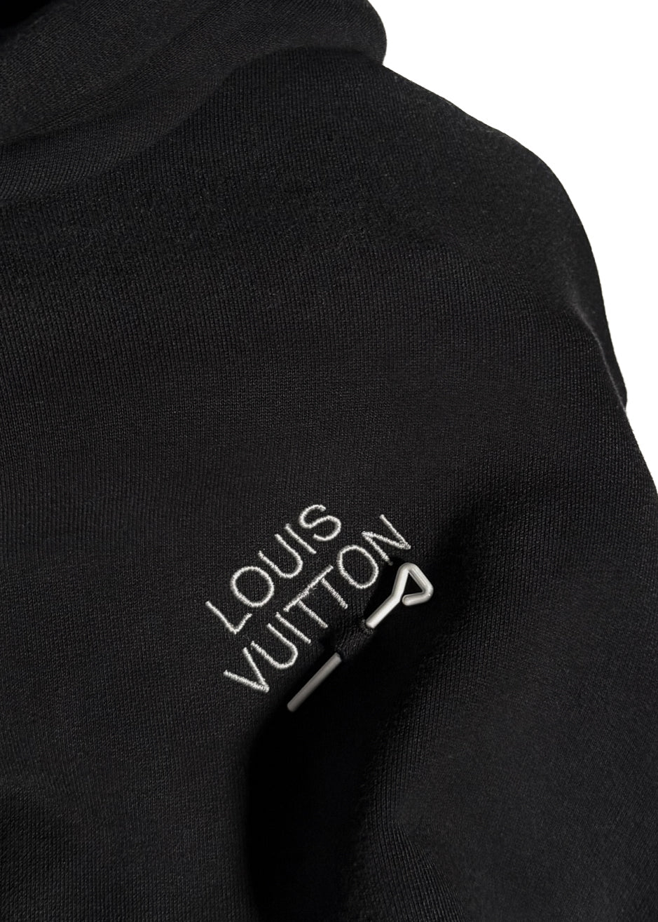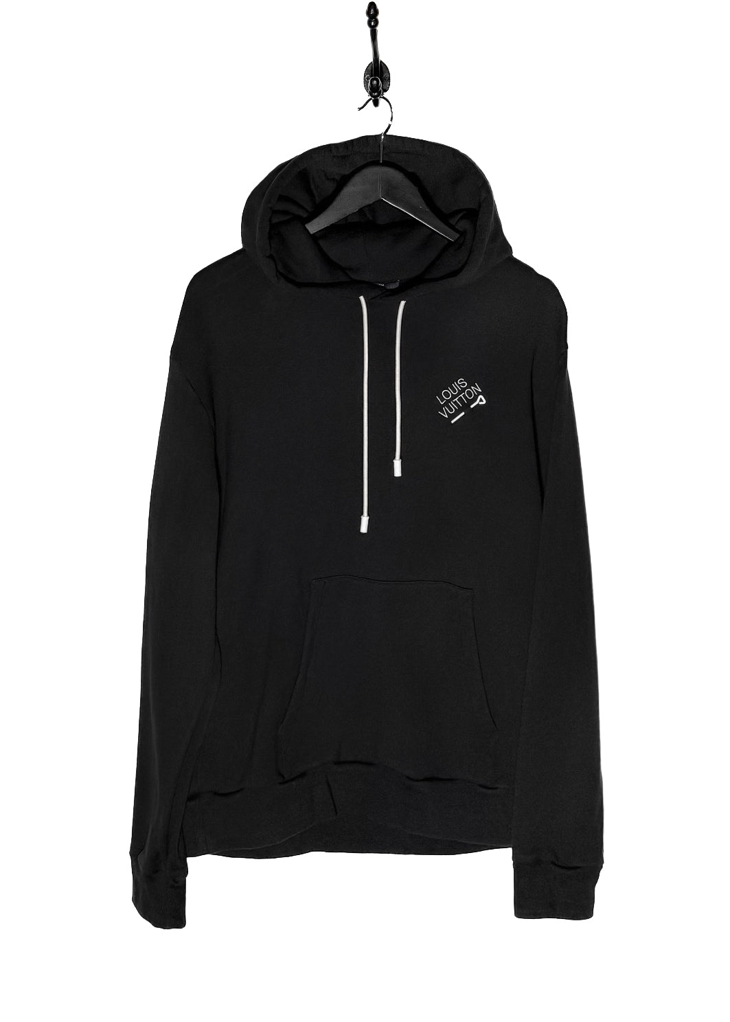 From the Fall Winter 2021 collection. Black hoodie with a regular straight cut. Fixed hood with adjustable white drawstrings and logo-engraved white metal tips. Embroidered Louis Vuitton logo at chest with pin accent in matching white hardware. Kangaroo pocket. Ribbed cuffs and hem. Soft fleece interior. Made in Italy.