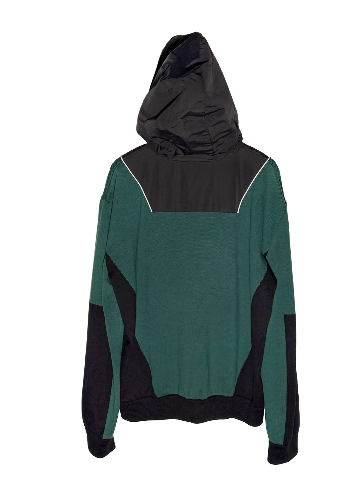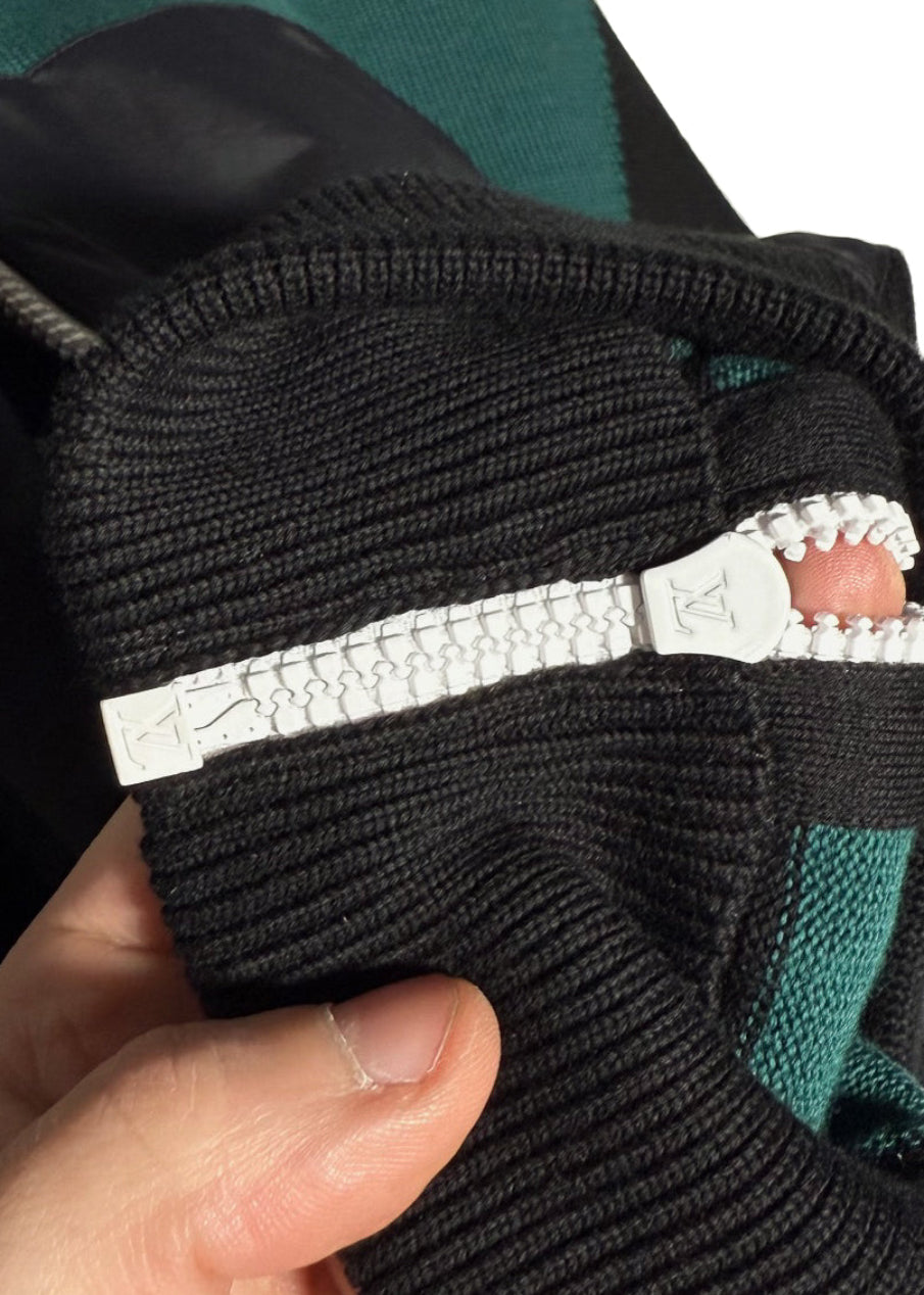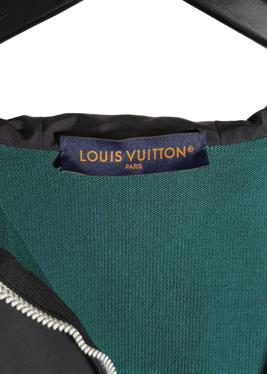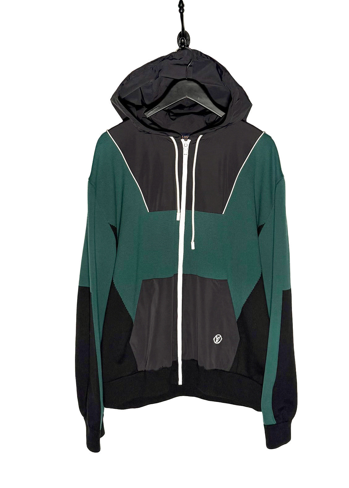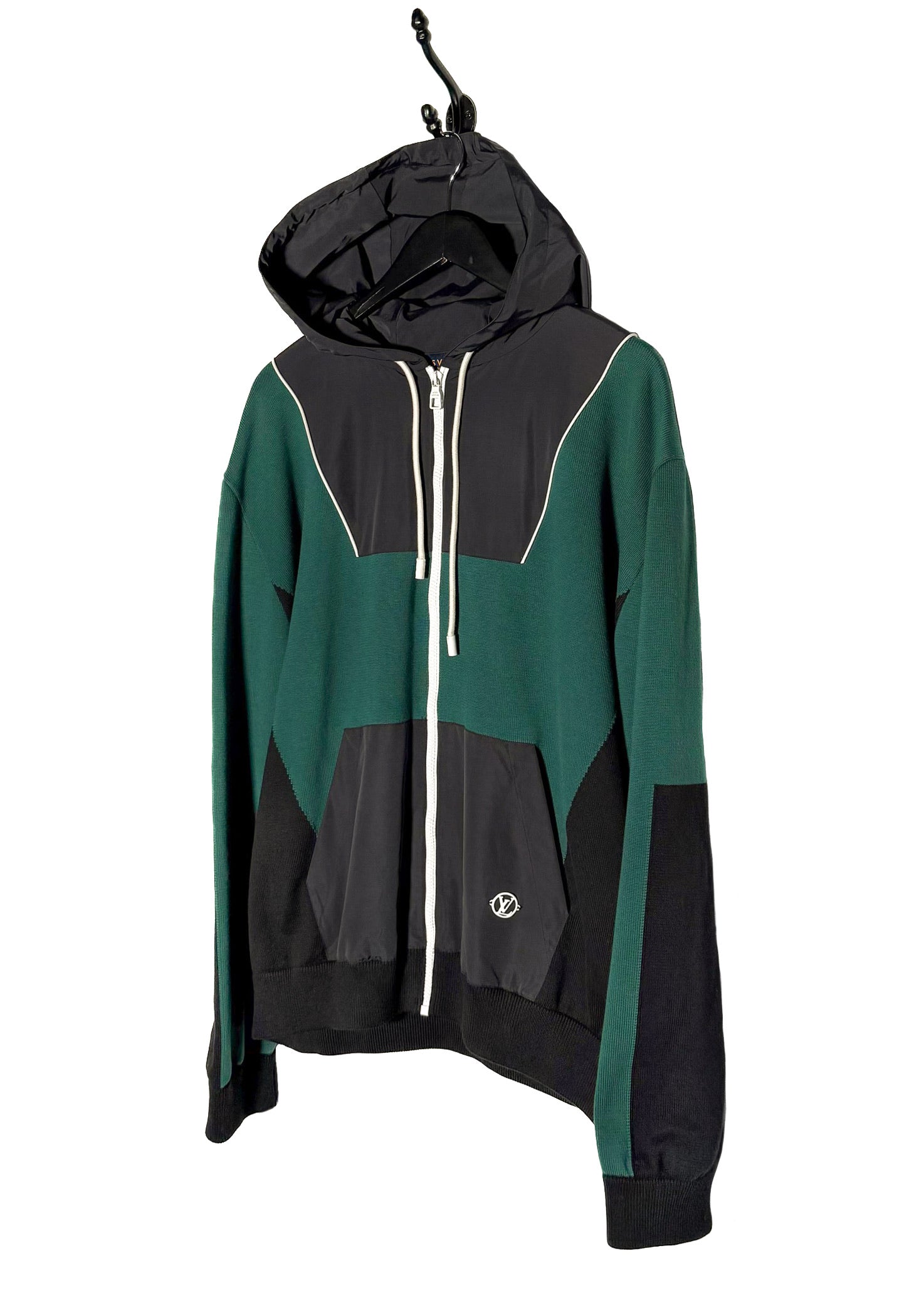 From the Spring/Summer 2023 collection. Green and black colourblock design. Hybrid knit and technical woven panels with adjustable hood. White drawstrings with Louis Vuitton branded cord tips. Full white zip front closure with branded zipper pull and zip end. Long sleeves. Ribbed cuffs and hem. Front pouch pockets with white metal LV circle logo. Made in Italy.