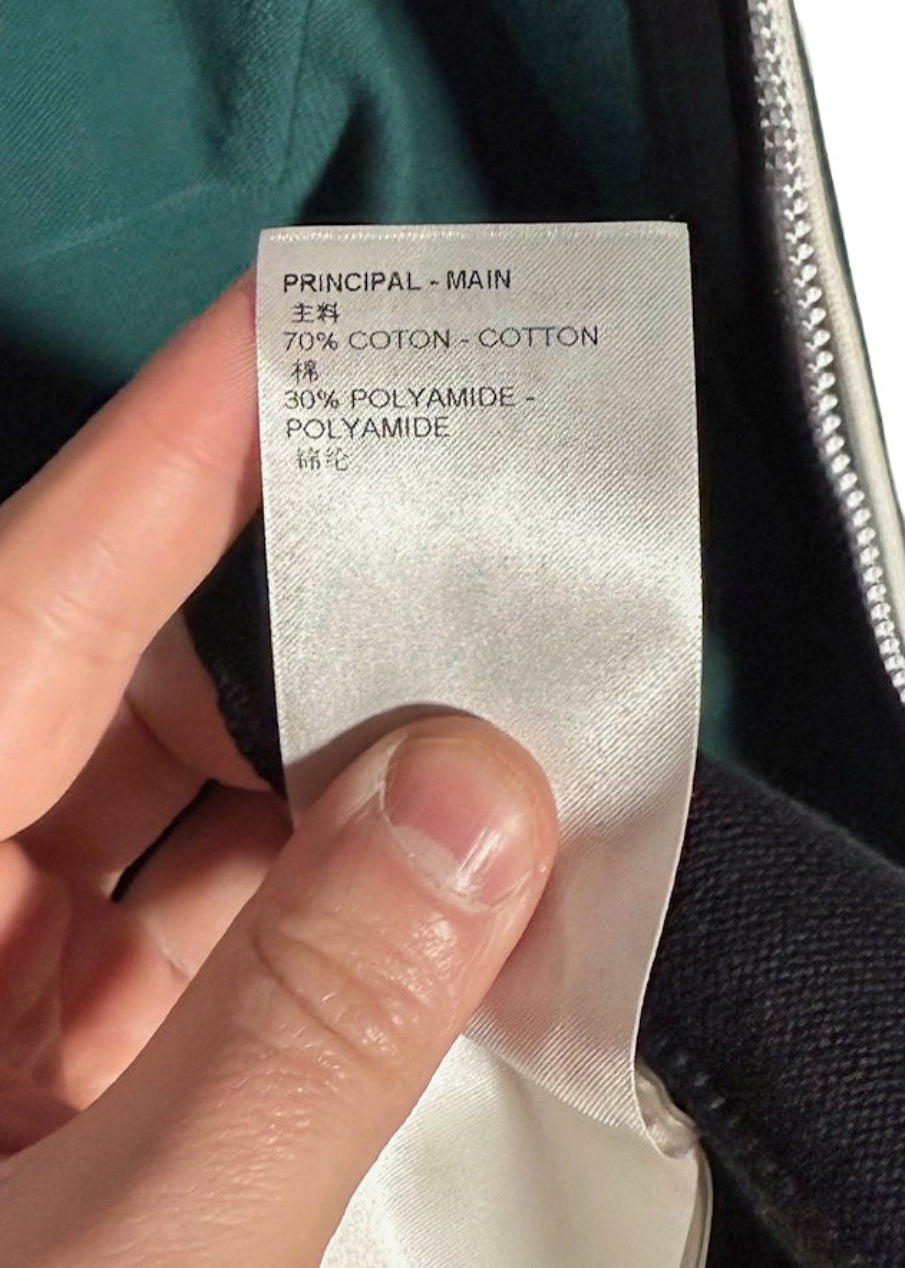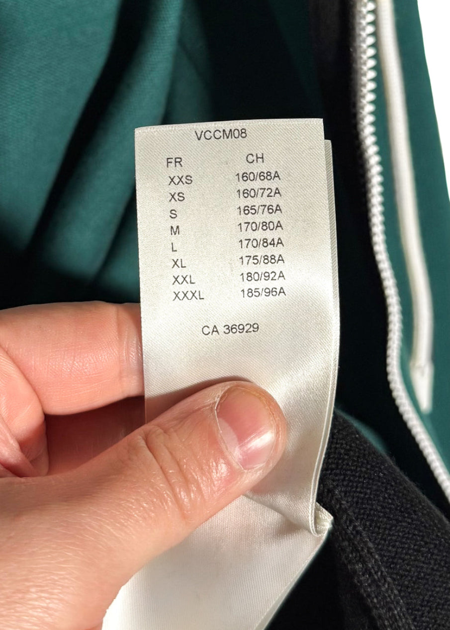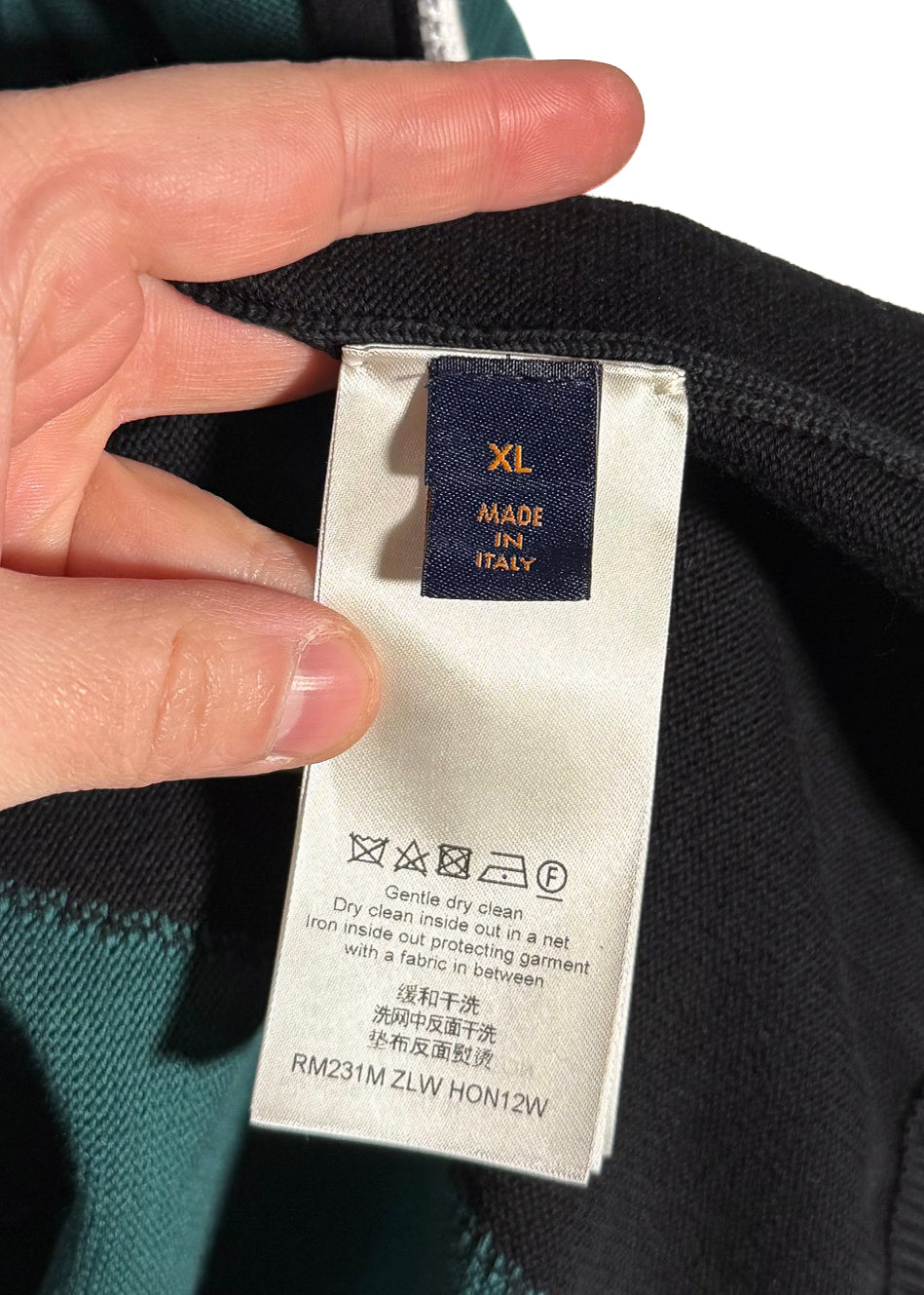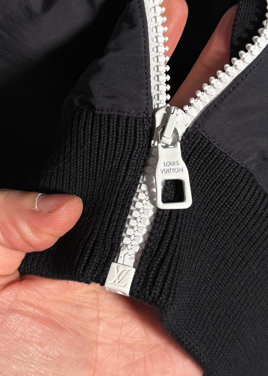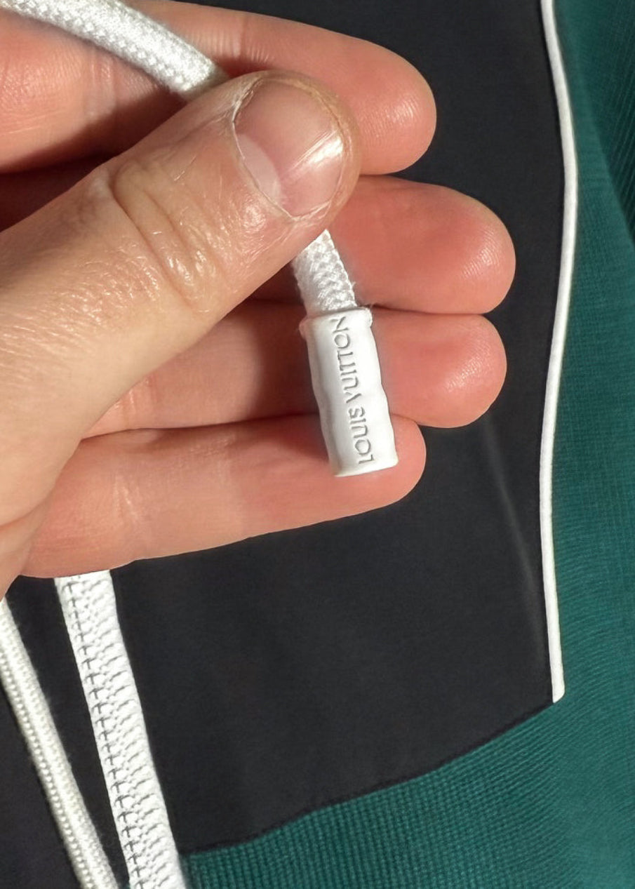 From the Spring/Summer 2023 collection. Green and black colourblock design. Hybrid knit and technical woven panels with adjustable hood. White drawstrings with Louis Vuitton branded cord tips. Full white zip front closure with branded zipper pull and zip end. Long sleeves. Ribbed cuffs and hem. Front pouch pockets with white metal LV circle logo. Made in Italy.